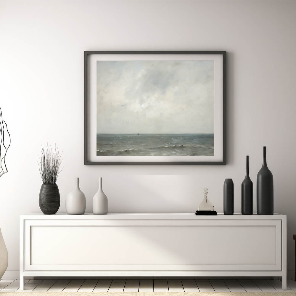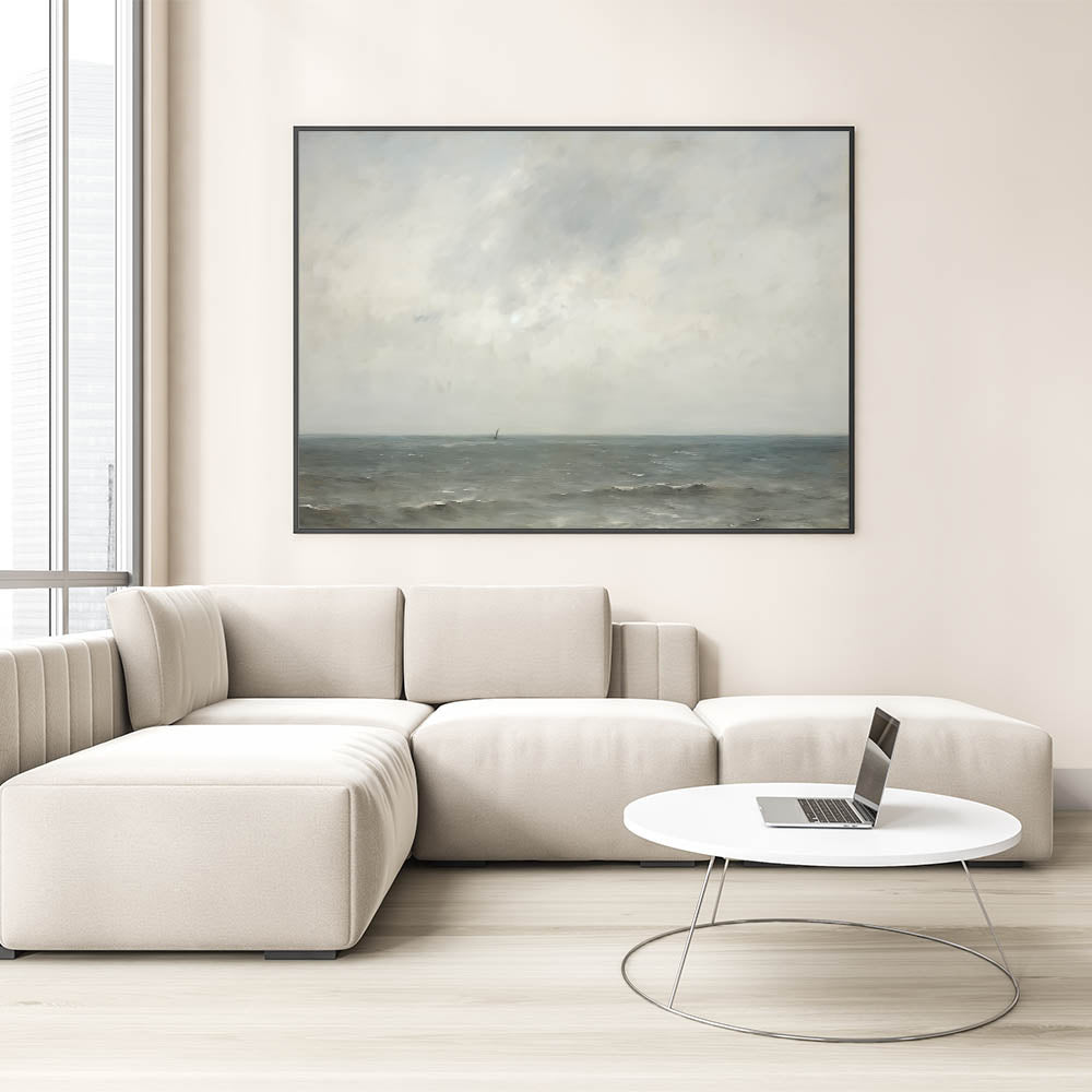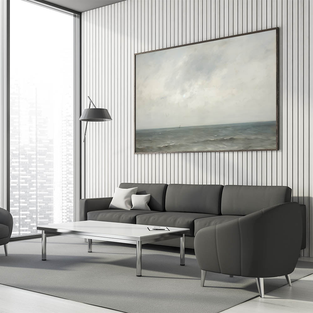This minimalist seascape wall art captures the tranquil beauty of the open ocean with soft tones of blue, gray, and beige. The serene horizon and subtle details evoke a peaceful and calming atmosphere, perfect for spaces that embrace a sense of quiet and reflection. Ideal for modern and minimalist interiors, this artwork brings the natural beauty of the sea into your home, adding a soothing element to any room.