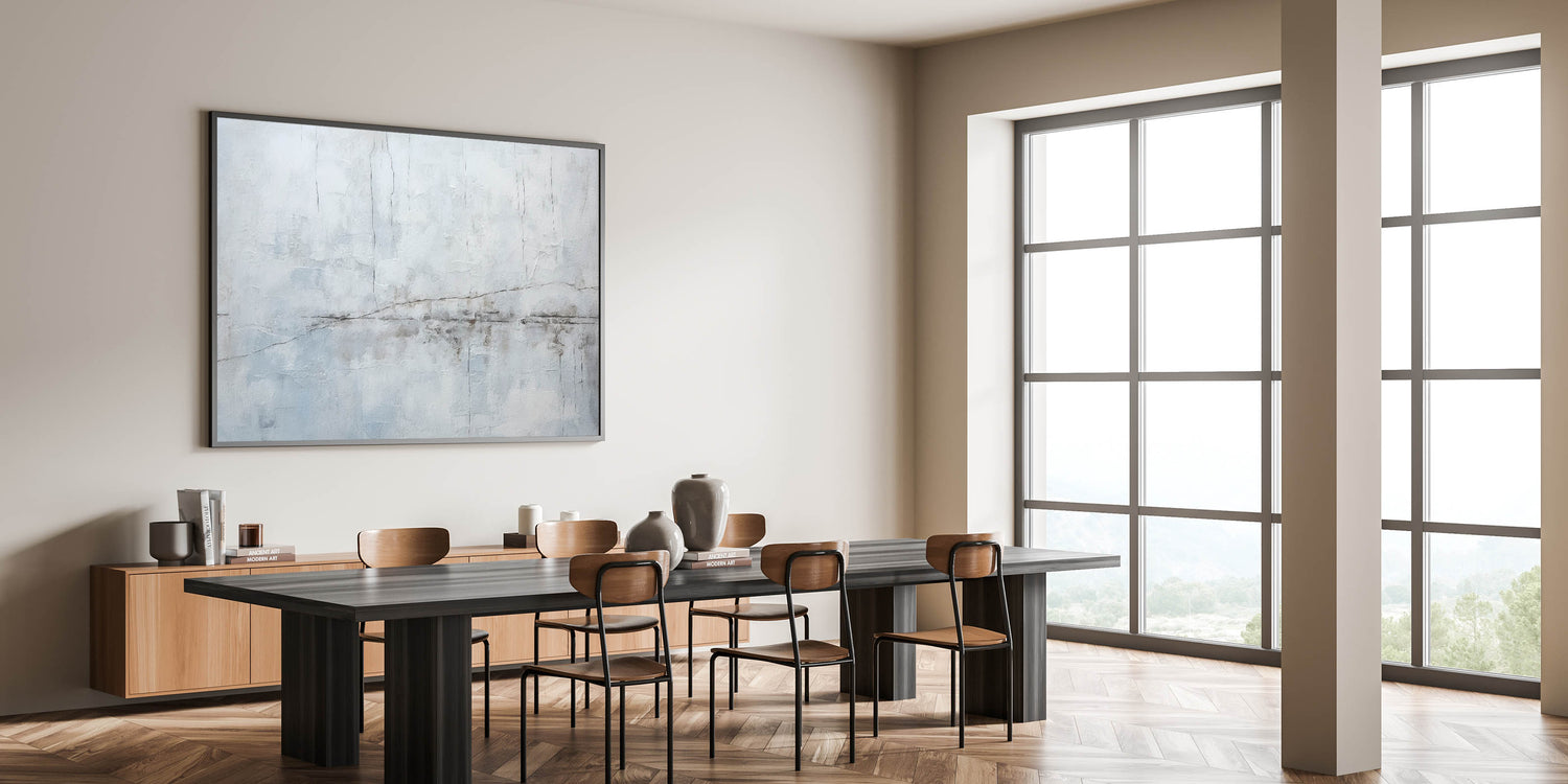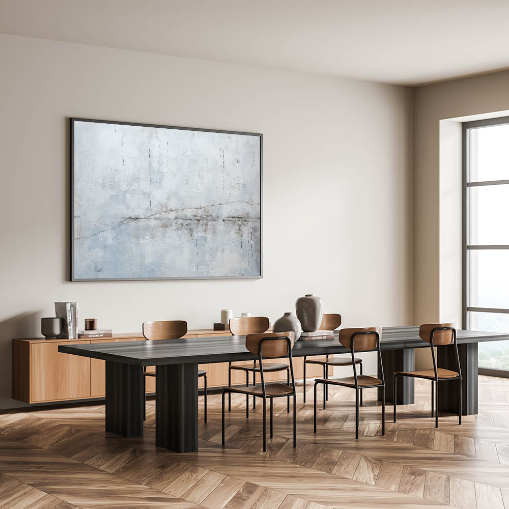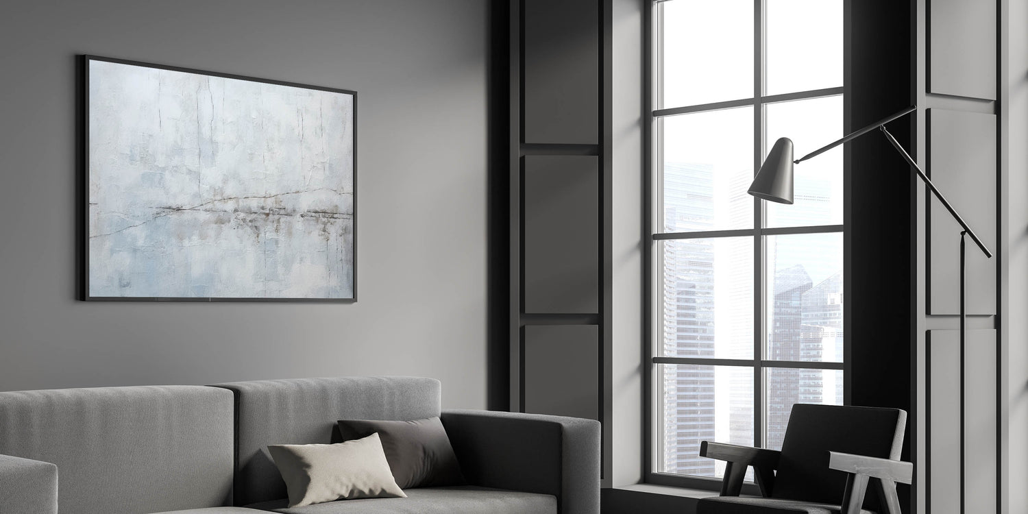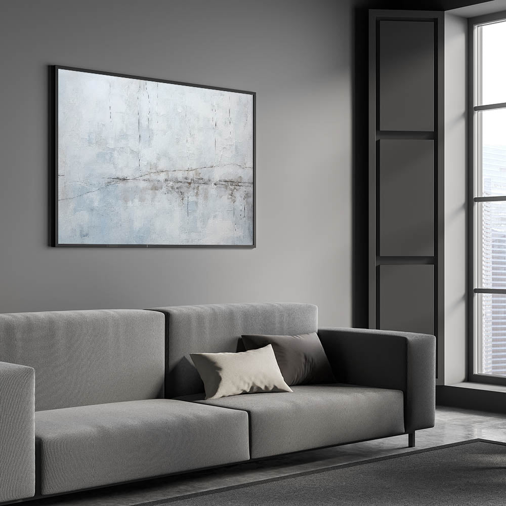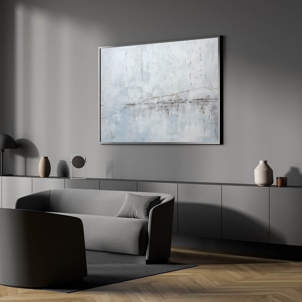 Elevate your space with this minimalist textured abstract art. The artwork showcases a soothing palette of light gray, white, and subtle hints of blue, creating a calm and serene ambiance. The delicate linear details add a sense of movement and depth, resembling gentle cracks or lines across a misty landscape. This piece is ideal for those who appreciate the simplicity and elegance of modern, minimalist design.