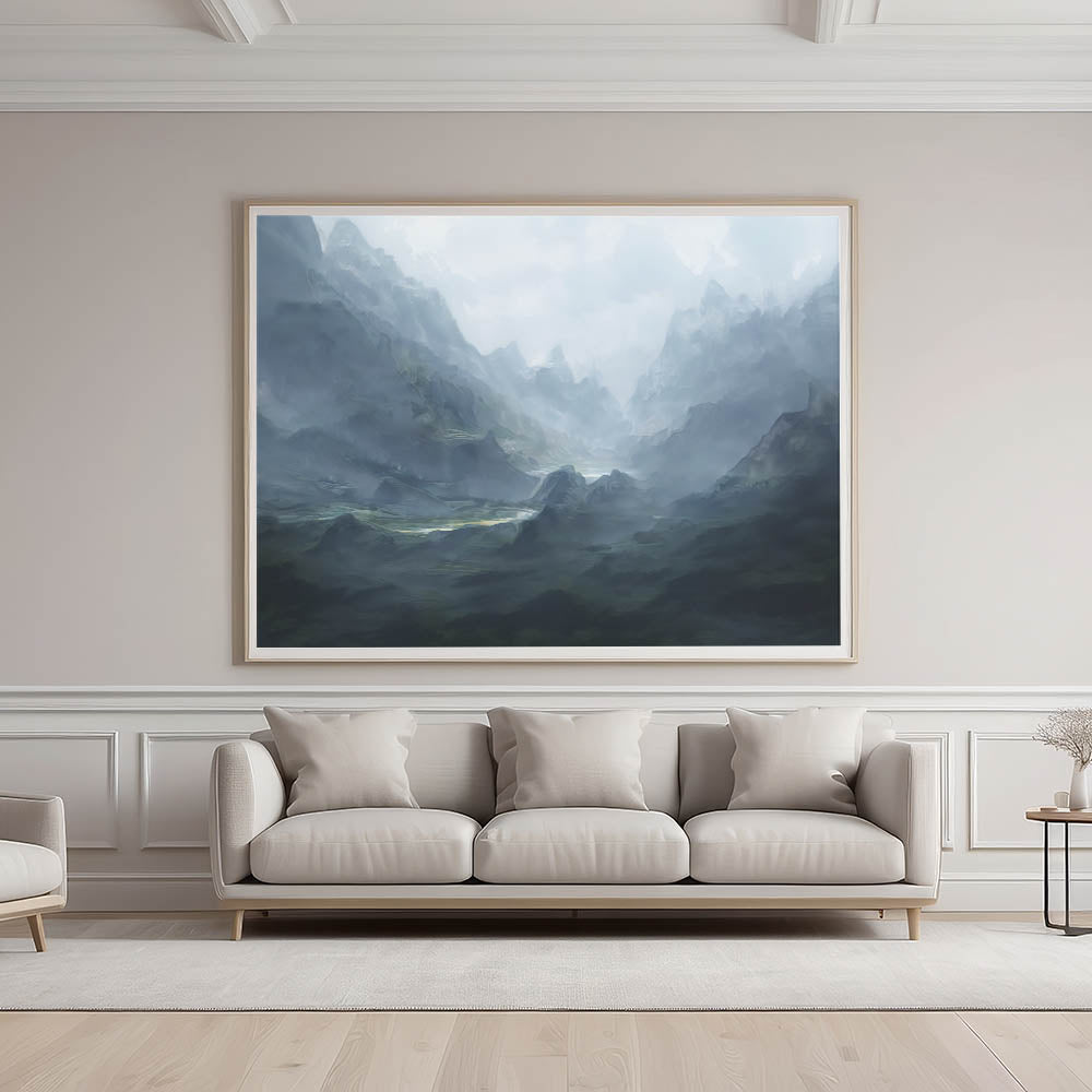 Transform your space with this serene and captivating abstract art piece featuring a misty mountain landscape in cool tones. The composition uses soft brushstrokes and a muted color palette of blues and grays to create a calming and ethereal atmosphere. This artwork is perfect for adding a sense of tranquility and depth to any modern or minimalist interior.