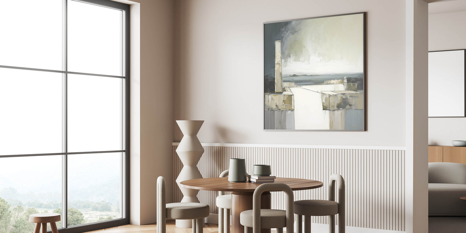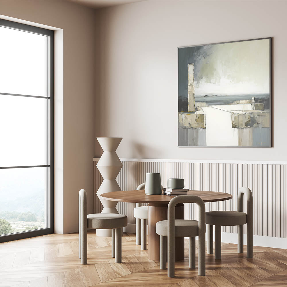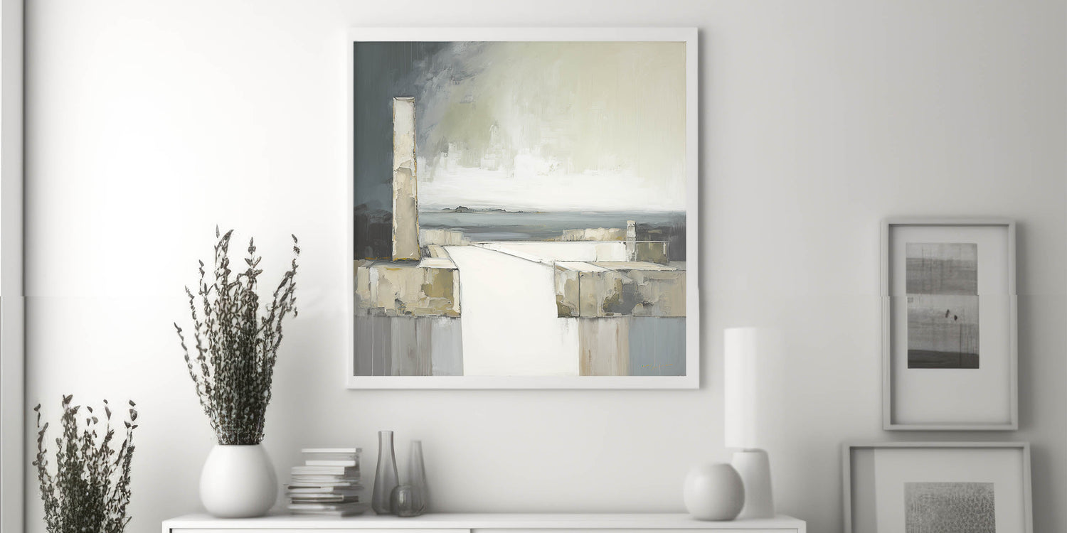 This architectural abstract brings an elegant, contemplative atmosphere to any room. Its minimalist design and soft hues make it a versatile choice for enhancing both modern and traditional décor, adding a touch of calm sophistication.