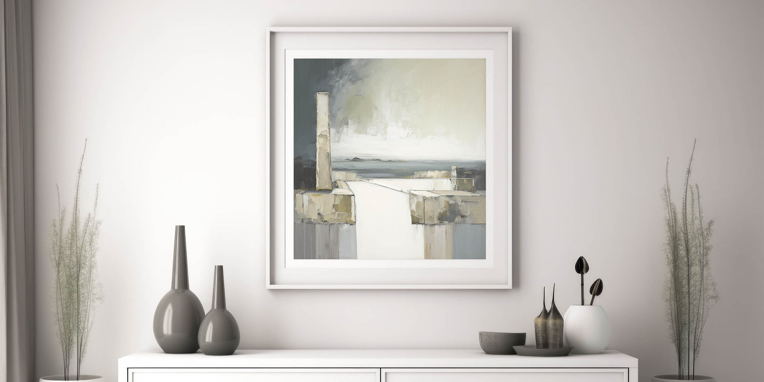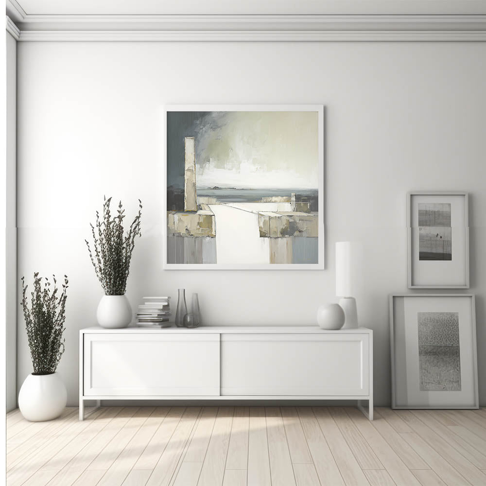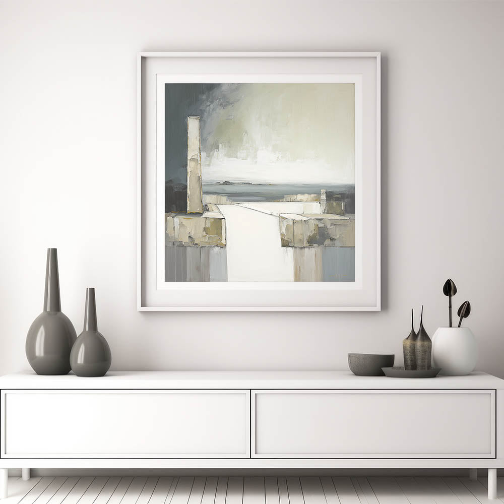 Enhance your space with this striking piece of modern abstract architecture art. Featuring a monochromatic palette of grays, whites, and muted greens, this artwork captures a minimalist coastal scene with bold architectural forms leading the eye toward the horizon. The interplay of shadows and textures evokes a sense of depth and calm, making this piece ideal for contemporary interiors seeking a sophisticated, understated aesthetic.