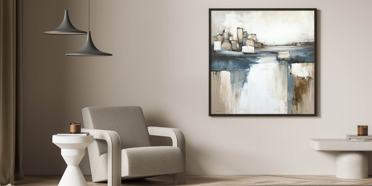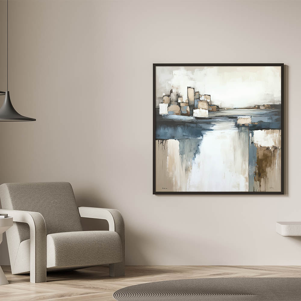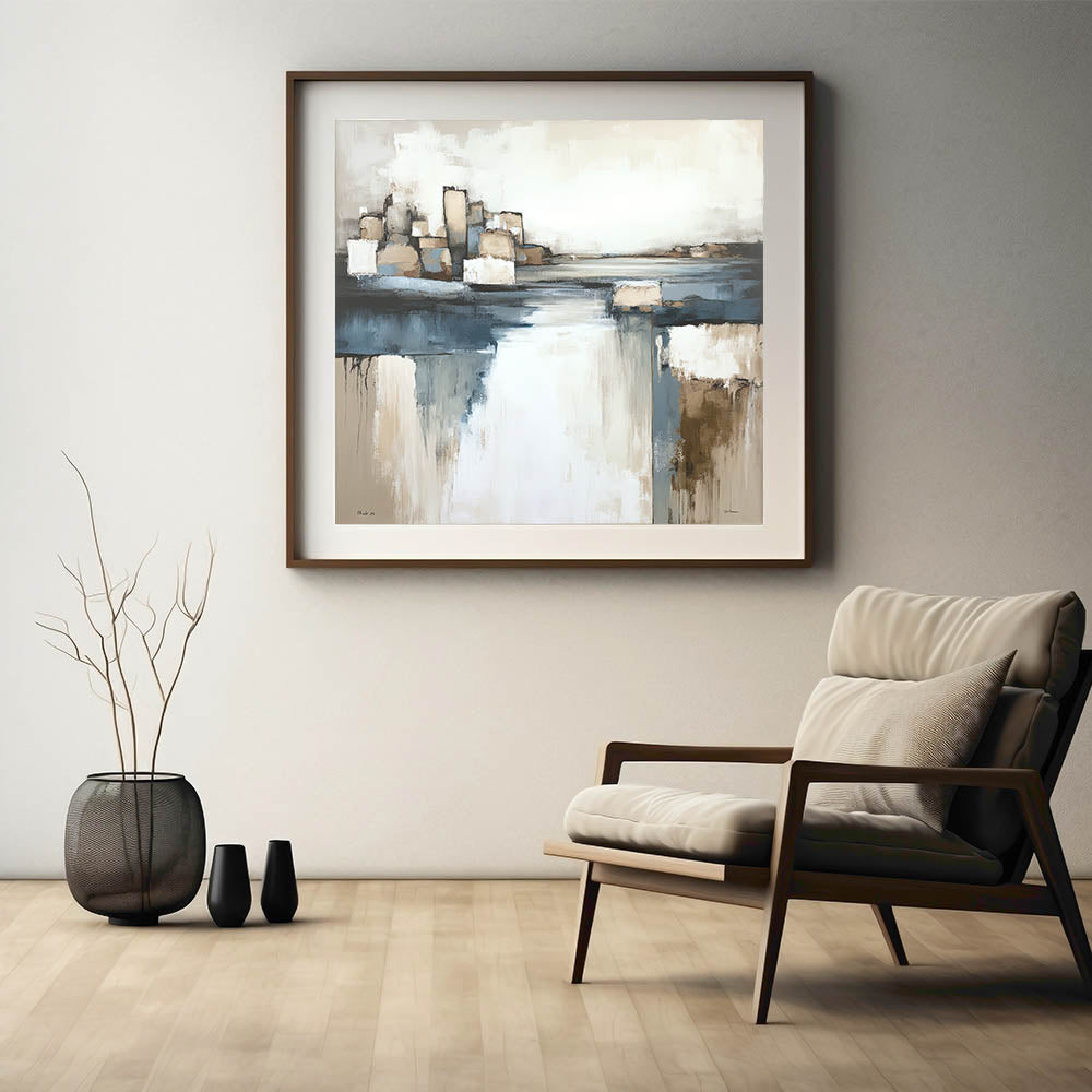 Add a touch of urban elegance to your decor with this modern abstract cityscape. Depicting an impressionistic view of city buildings, this artwork features a balanced blend of neutral tones—beige, gray, and deep blue. The layered textures and minimalist color palette evoke a calm, sophisticated ambiance, making it ideal for contemporary and minimalist interiors. Perfect for a living room or office, this piece brings a serene yet powerful presence to any wall.