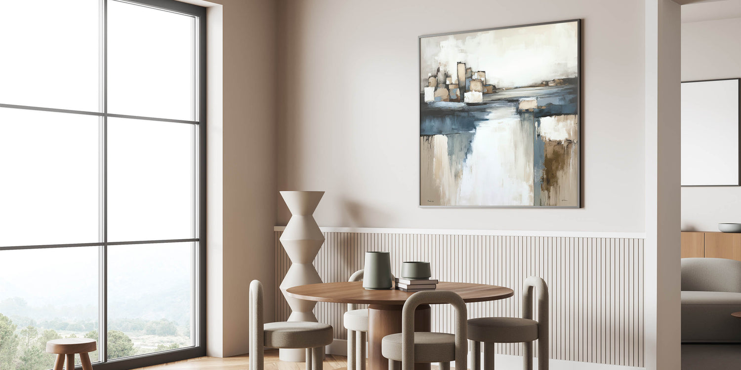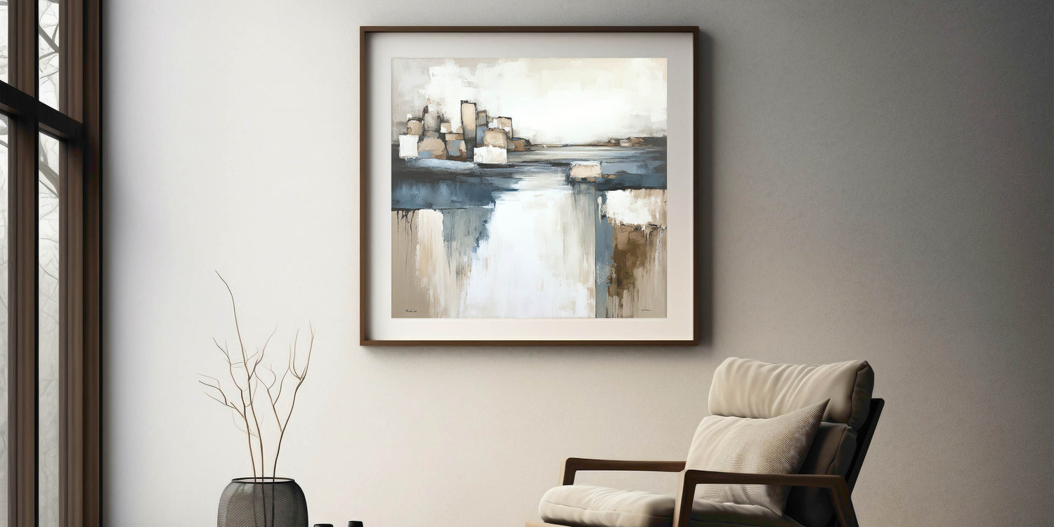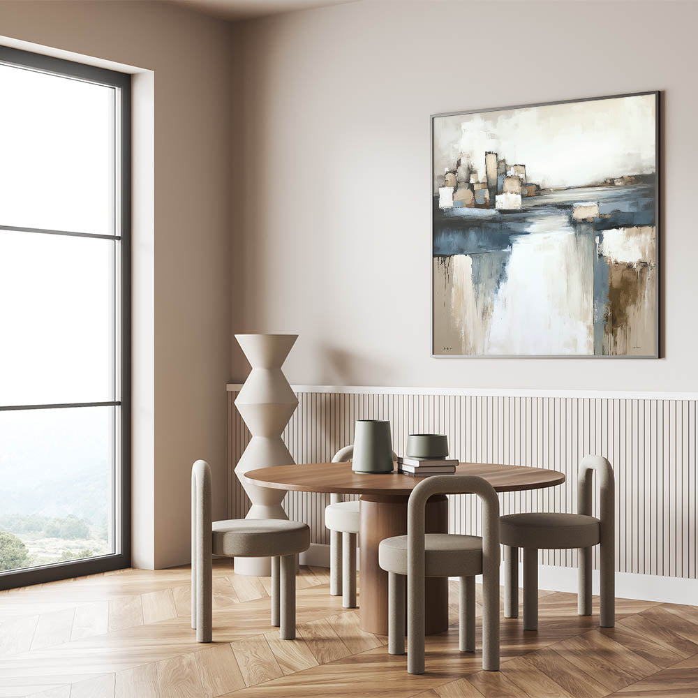 Add a touch of urban elegance to your decor with this modern abstract cityscape. Depicting an impressionistic view of city buildings, this artwork features a balanced blend of neutral tones—beige, gray, and deep blue. The layered textures and minimalist color palette evoke a calm, sophisticated ambiance, making it ideal for contemporary and minimalist interiors. Perfect for a living room or office, this piece brings a serene yet powerful presence to any wall.