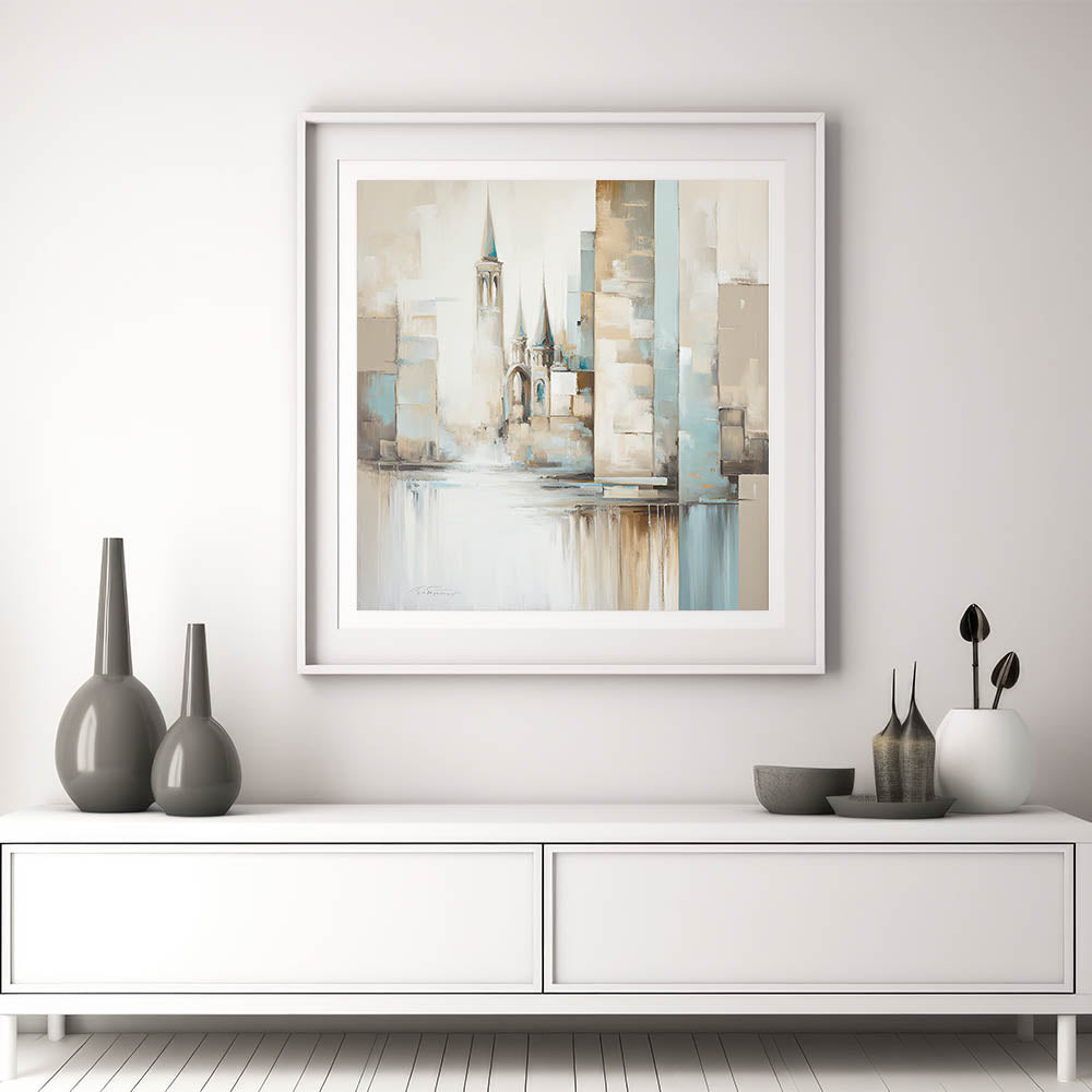 Bring the grandeur of cathedral architecture into your space with this Modern Cathedral Abstract Architecture Art. This piece features towering spires and geometric forms, blending classical and modern elements in a refined palette of beige, blue, and cream. The soft colors and abstract design give it a serene yet sophisticated feel, making it a versatile addition to both contemporary and traditional interiors.