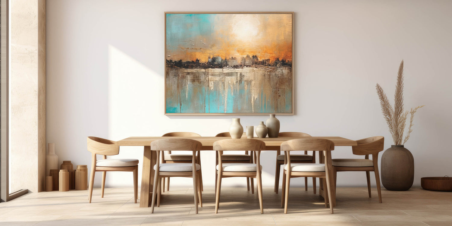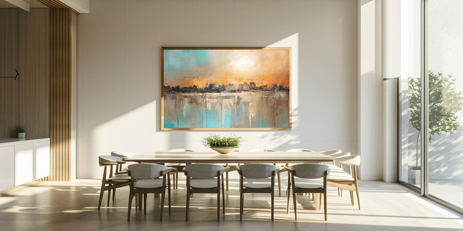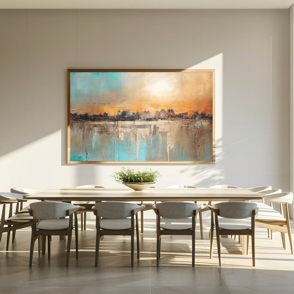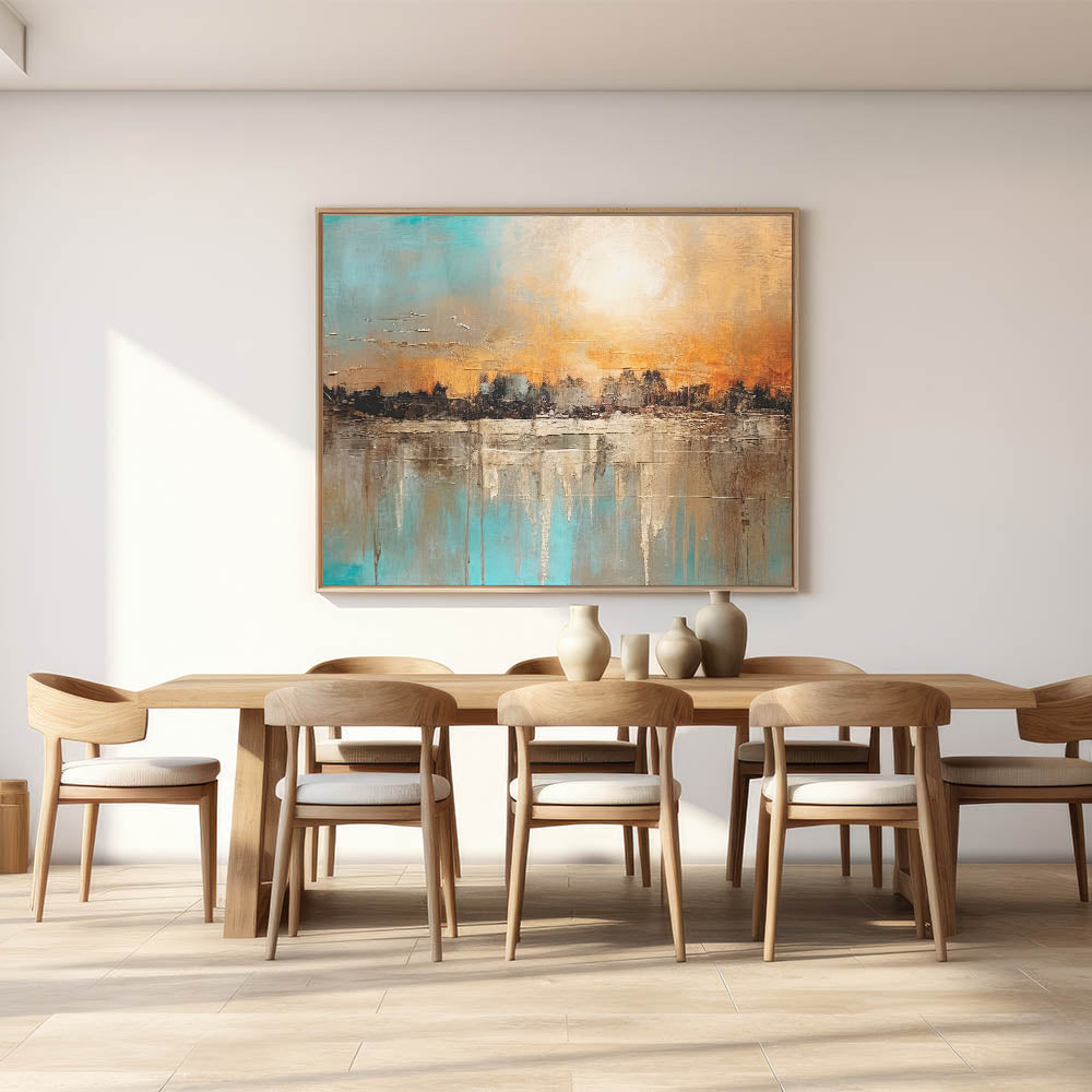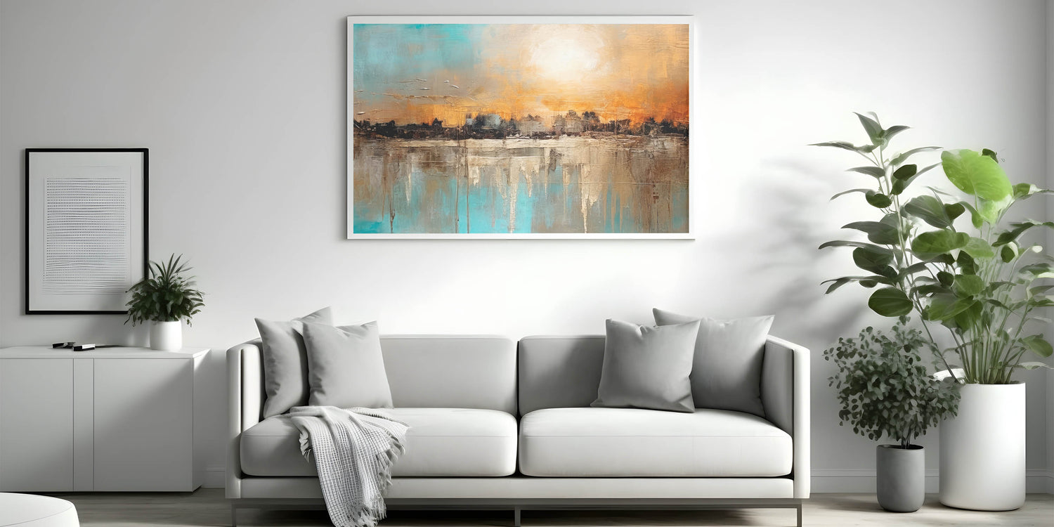 Infuse your home with the vibrant energy of our Modern Landscape Abstract wall art. This piece captures a stunning sunset over a textured cityscape, blending warm oranges and cool blues in a dynamic composition. The rich textures and bold colors create a visually striking and engaging scene, perfect for any contemporary setting.