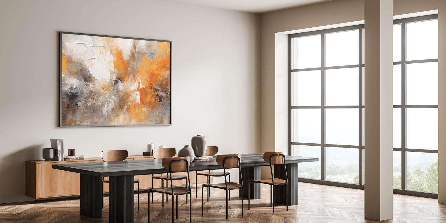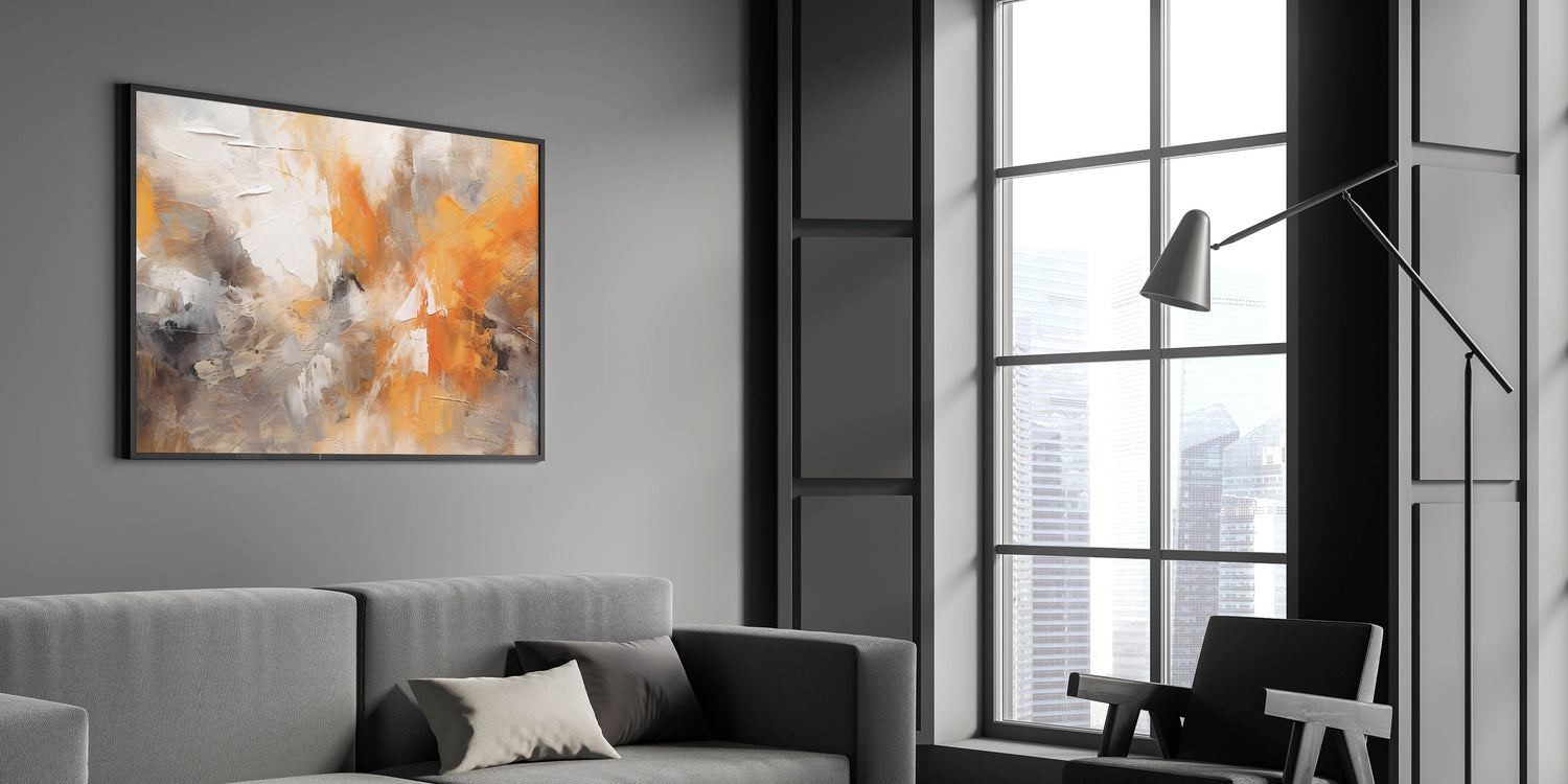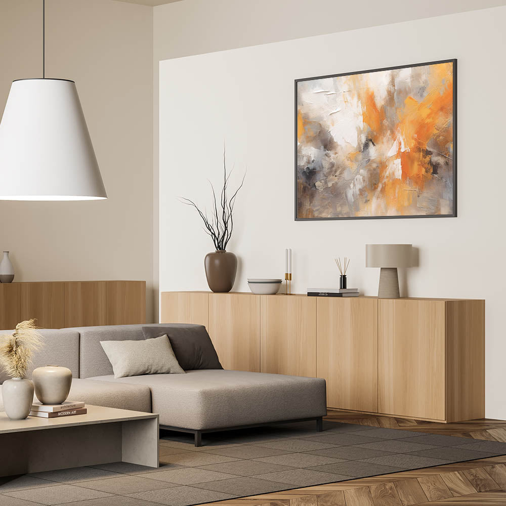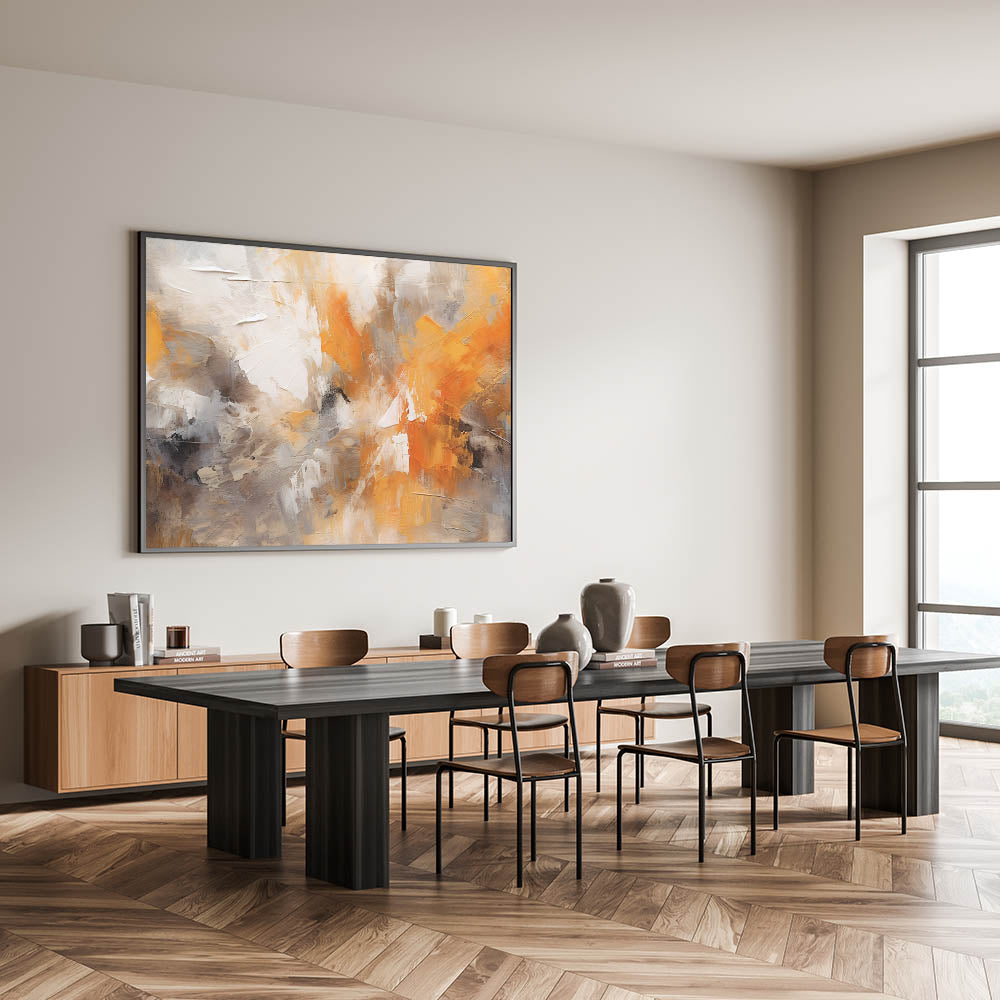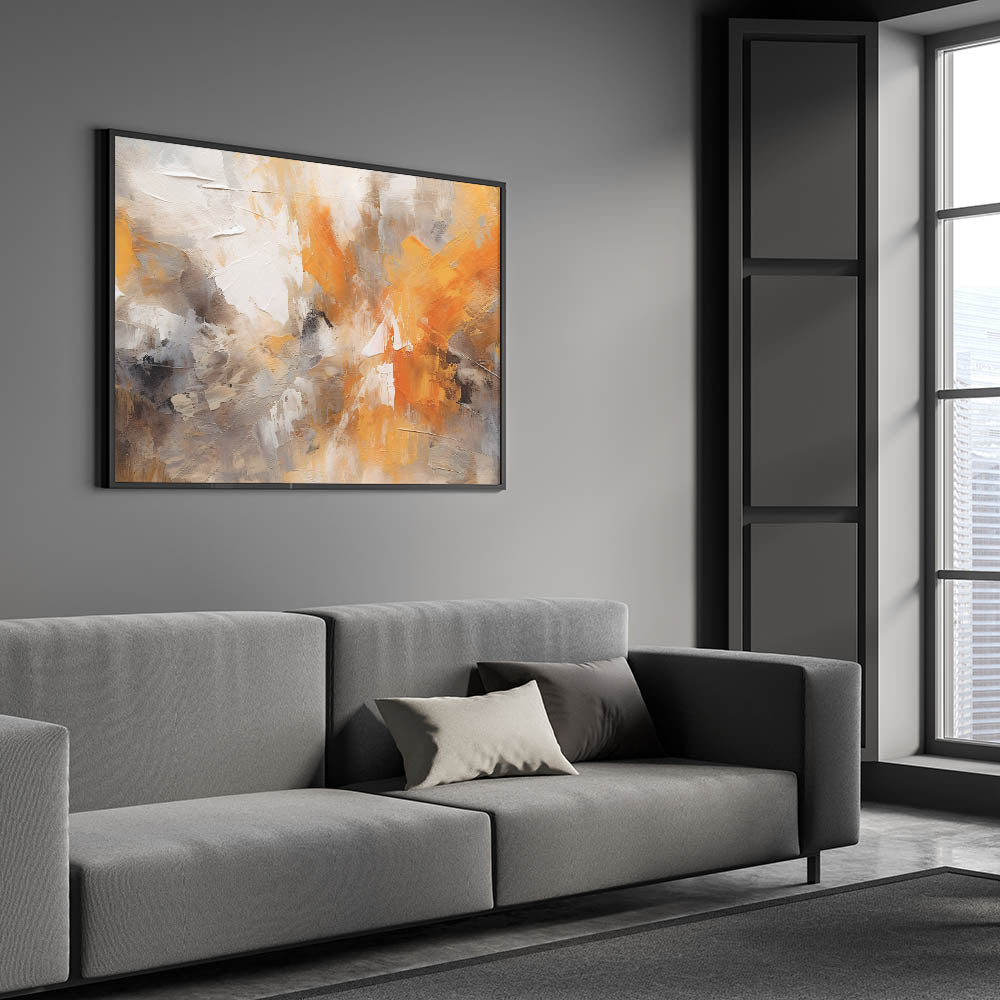 Transform your space with this captivating piece of modern abstract art. This stunning design features dynamic strokes and fluid brushwork that merge shades of orange, deep gray, and crisp white. The painting captures the essence of contemporary line art, offering a vivid display of artistic expression that brings energy and warmth to any room.