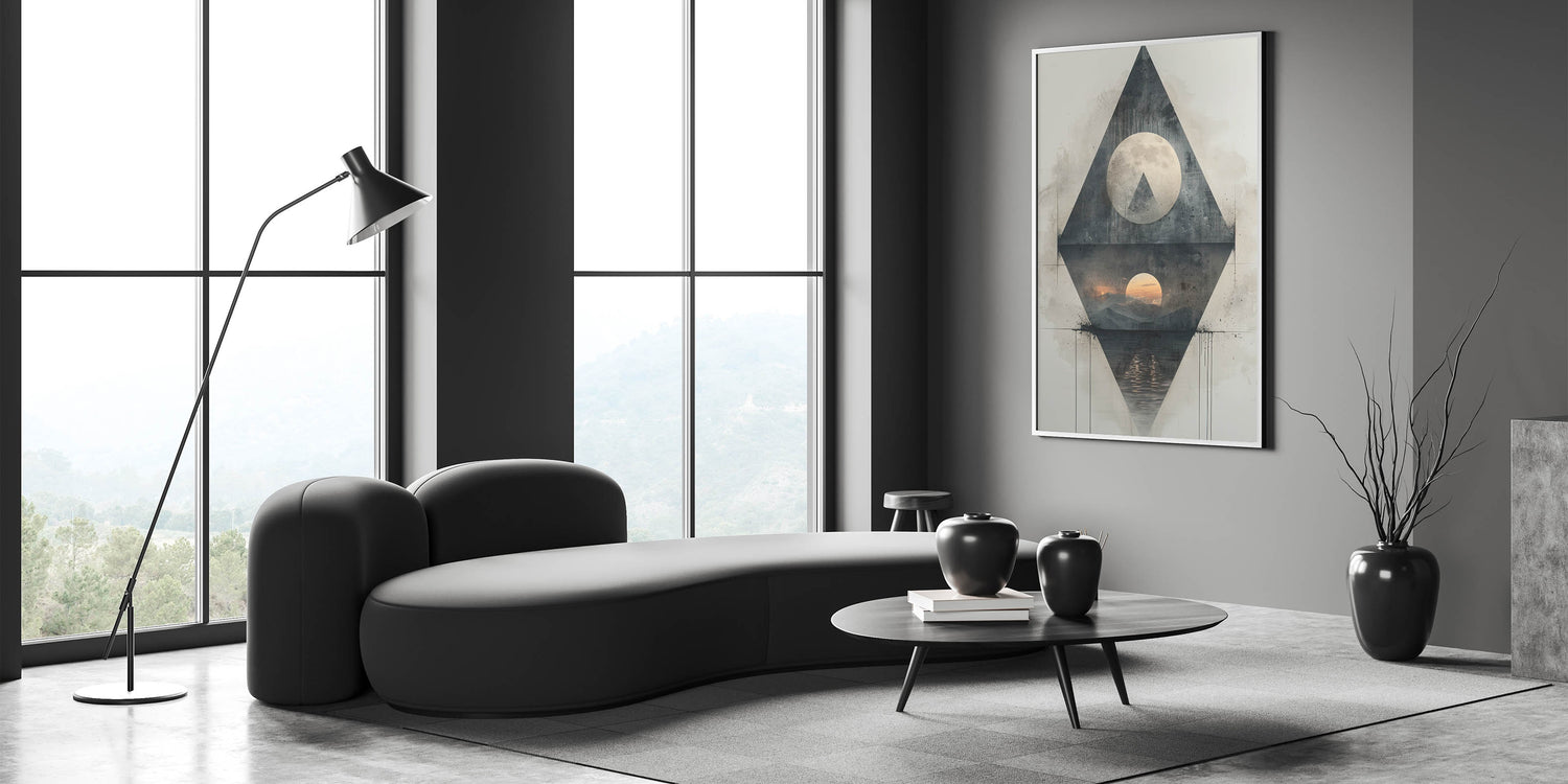 Capture the allure of nature and mysticism with this Mystic Abstract Landscape Art. Featuring a unique blend of geometric shapes and a surreal landscape, this artwork combines modern design with natural elements. The contrasting dark tones and a subtle sunset scene evoke a sense of tranquility and depth, making it a stunning focal point for contemporary interiors.