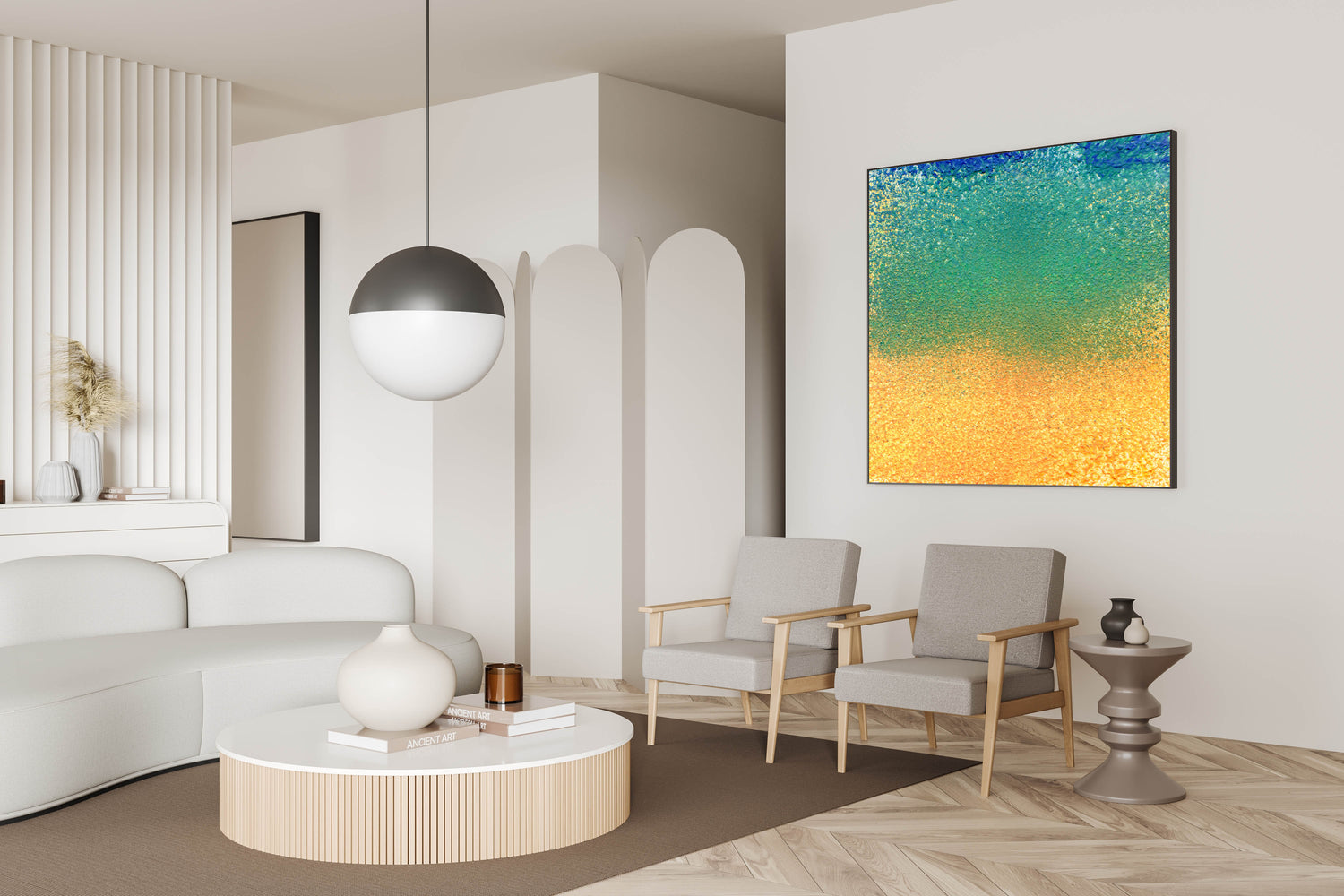 This abstract design brings a vibrant, sunny atmosphere to your home. Whether you envision a beach sunrise or the waves of the ocean, this piece adds a touch of nature’s beauty and joy, making it a versatile choice for modern and coastal-themed interiors.