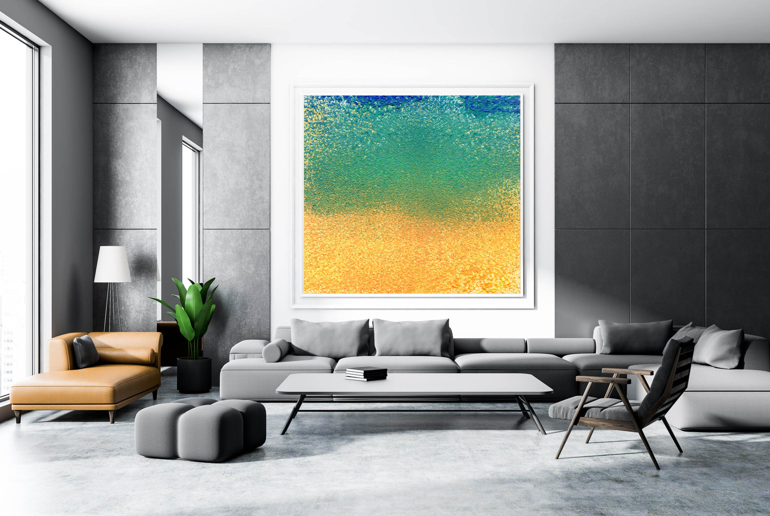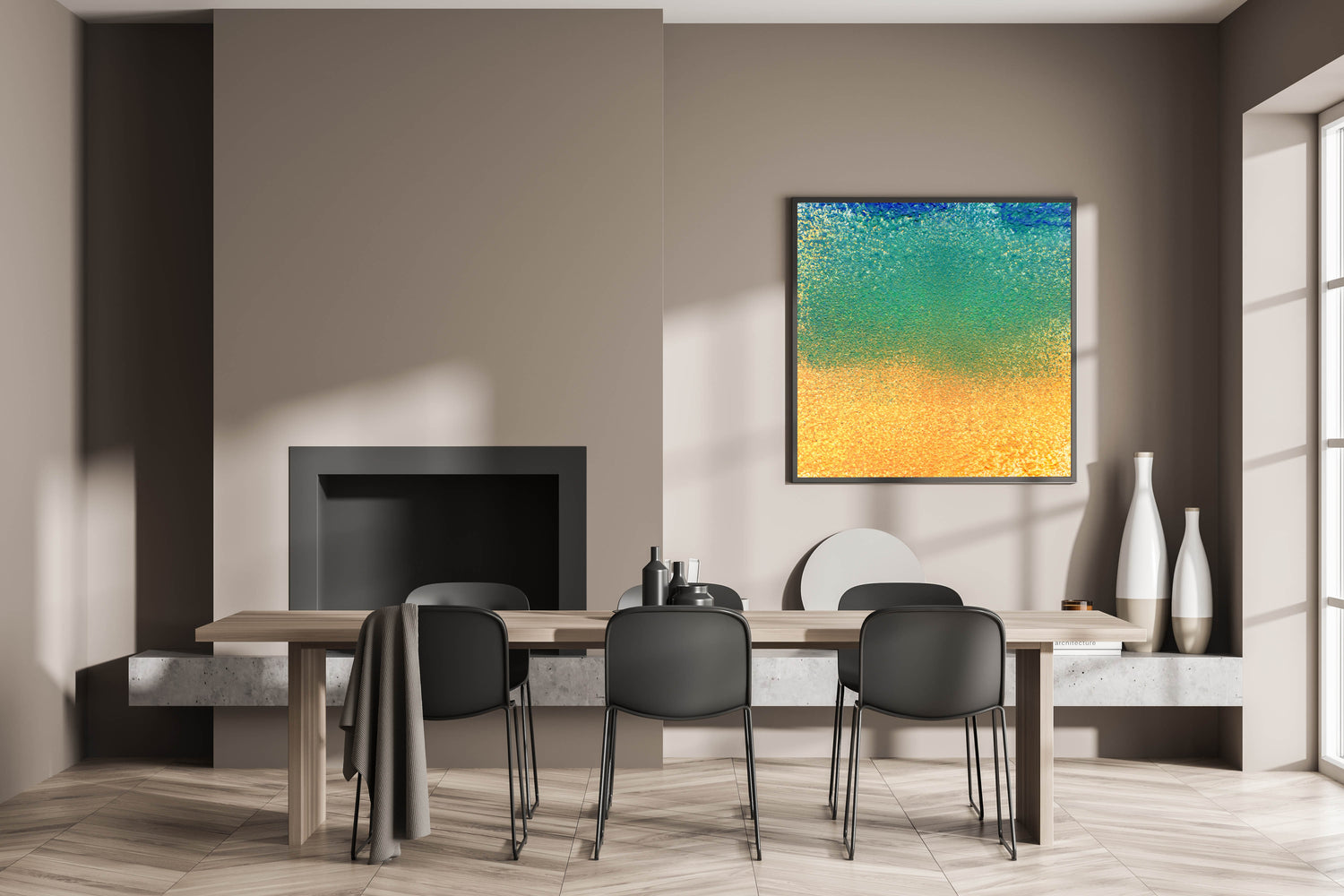 Capture the essence of the ocean with this stunning abstract artwork, featuring a vibrant gradient of deep blue, calming teal, and warm golden yellow. The textured surface and soft color transitions evoke the feeling of a sunny beach, making it a perfect addition for any space in need of a refreshing, lively vibe. The playful mix of cool and warm tones creates a harmonious, uplifting composition that brightens up any room.