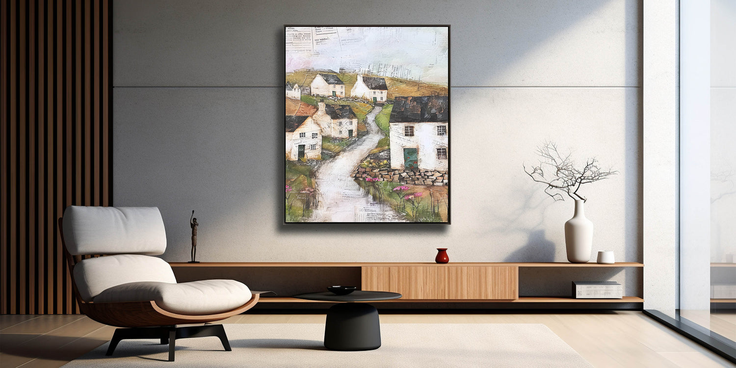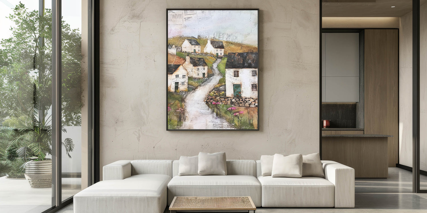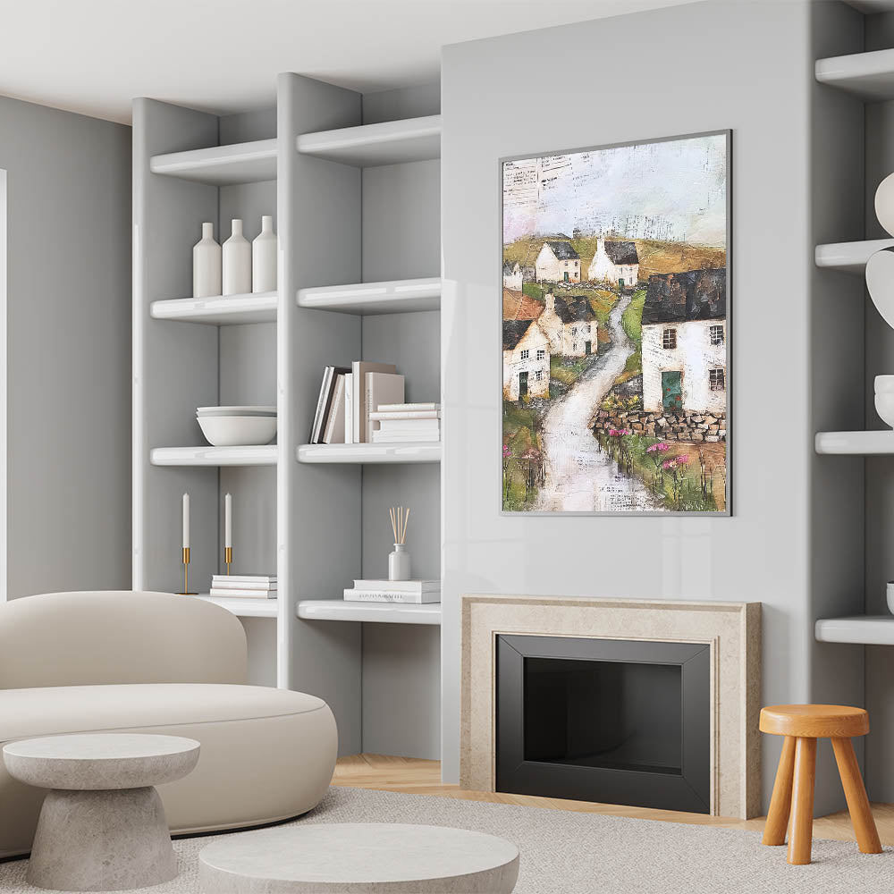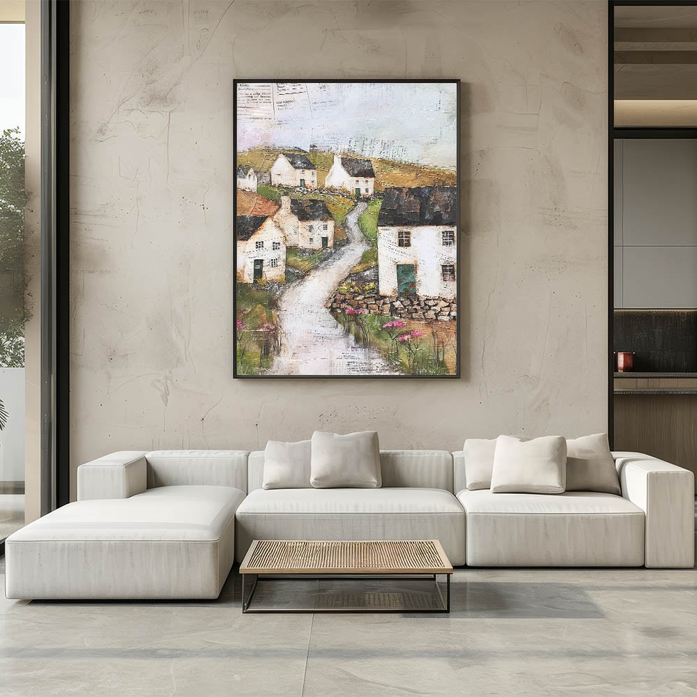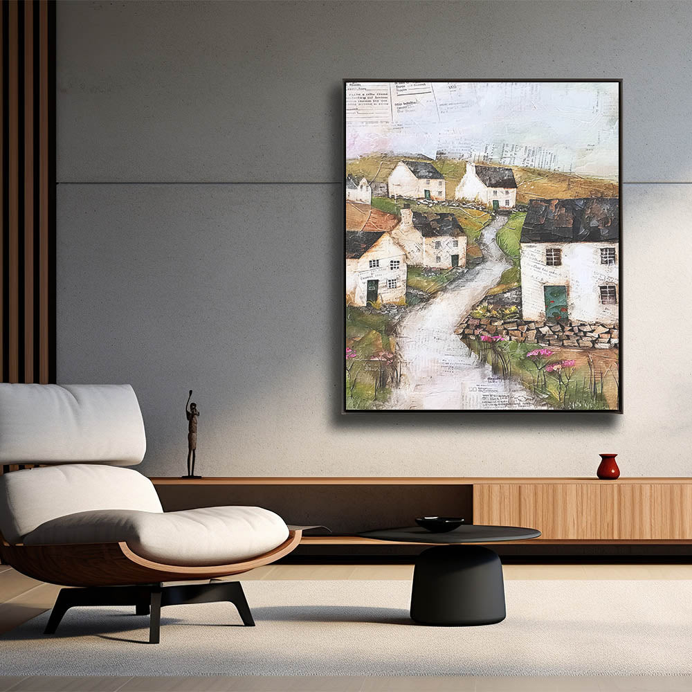 Transform your space with this charming rustic countryside village art. This artwork captures the essence of a peaceful rural scene with quaint cottages, winding pathways, and lush greenery. Rendered in earthy tones and textured layers, the piece evokes a sense of nostalgia and tranquility, ideal for those who appreciate the beauty of pastoral landscapes. Perfect for creating a cozy ambiance, this art piece is available in various formats to suit different styles.