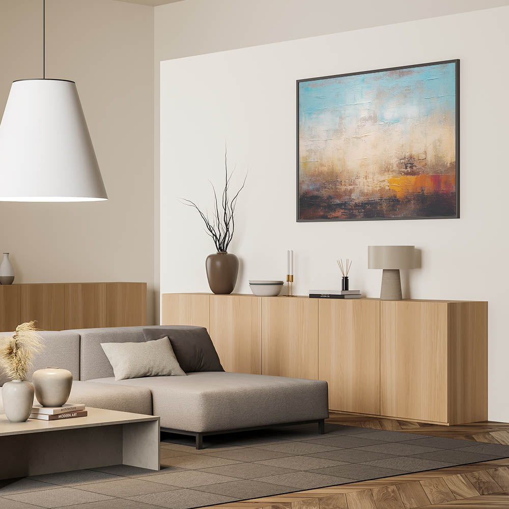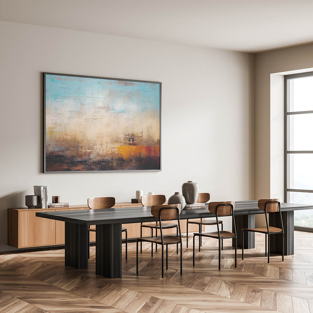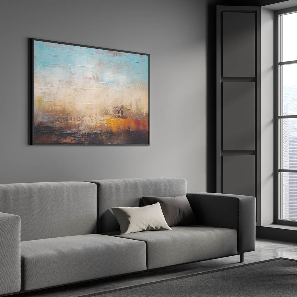 Immerse yourself in the tranquility of this serene abstract landscape art piece, featuring a harmonious blend of warm and cool tones. The textured brushstrokes create a soft, ethereal scene that evokes the beauty of nature at dawn or dusk. The subtle gradients of blues, beiges, and warm earth tones make this artwork a perfect addition to any modern or rustic interior.