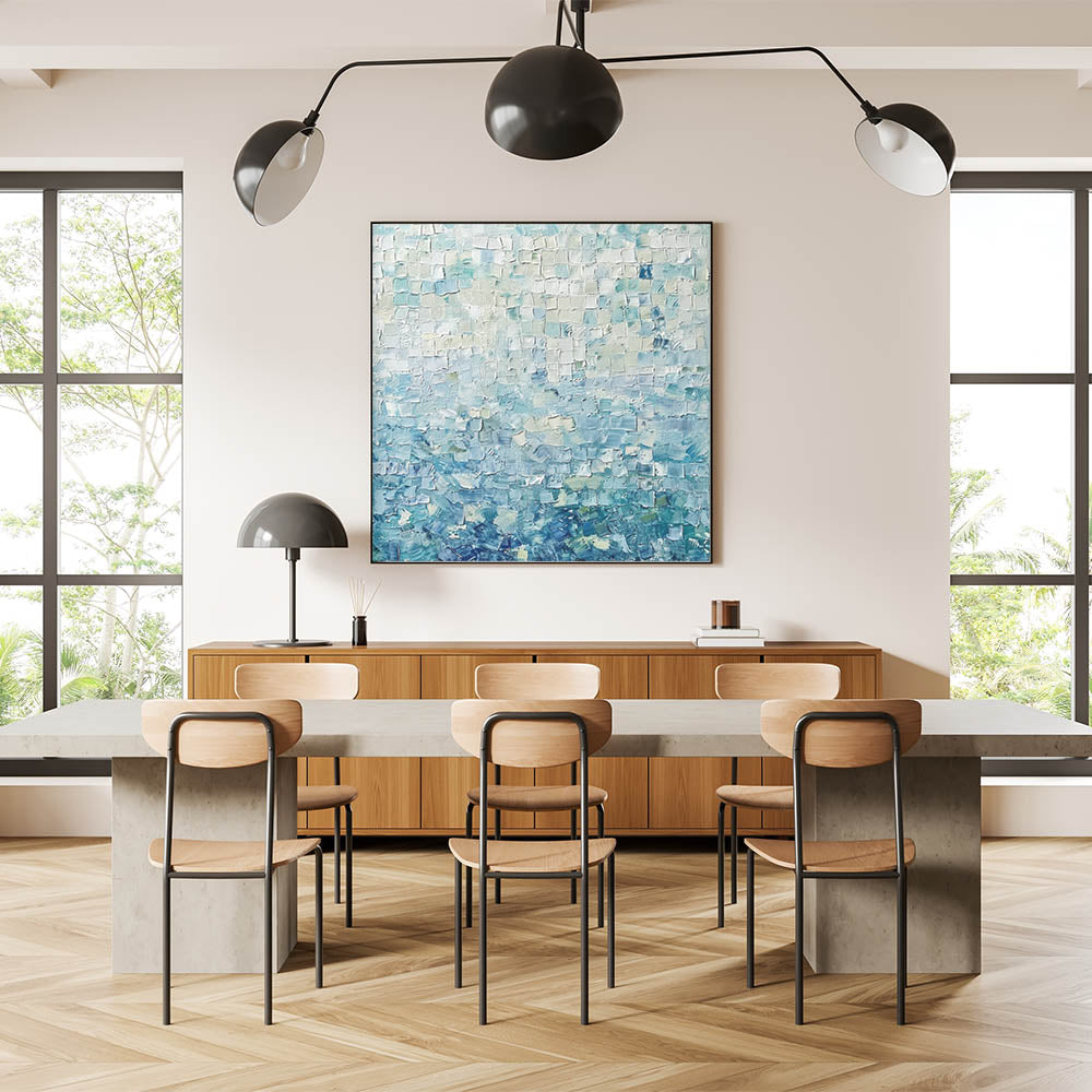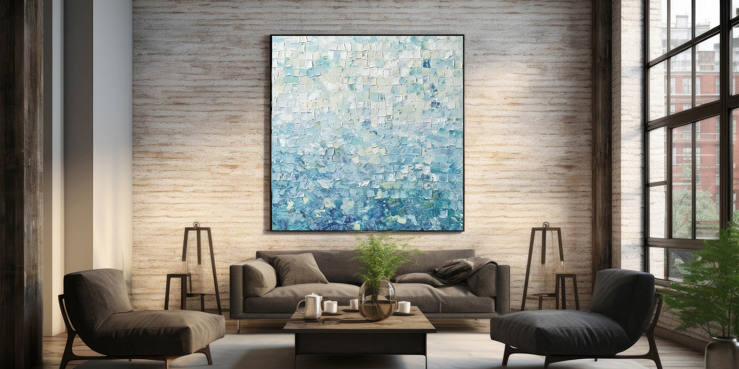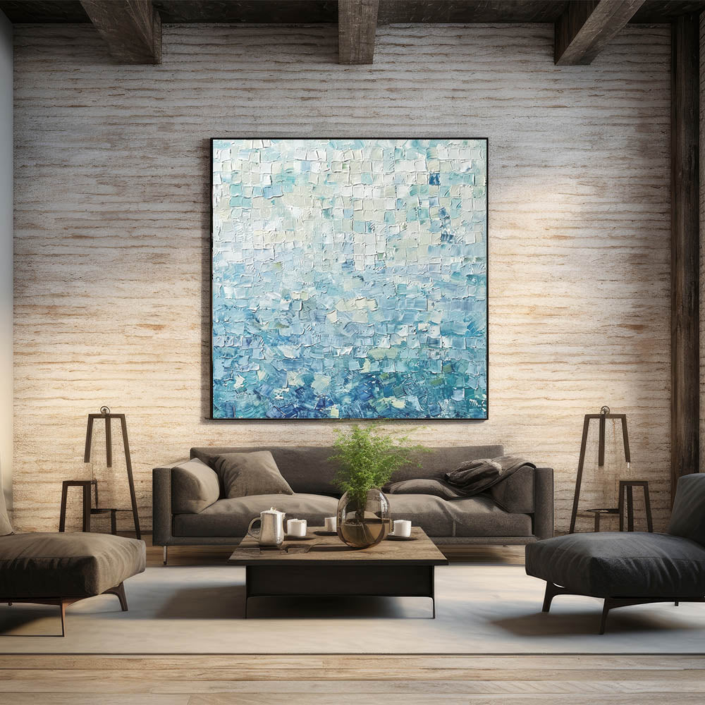 Transform your space with the tranquil beauty of this Soft Abstract Mosaic Art. Featuring a harmonious blend of pastel blue, mint green, and white tones, this artwork uses a textured mosaic pattern to create depth and serenity. Its gentle colors evoke feelings of calmness and balance, making it an ideal addition to contemporary and minimalist interiors.
