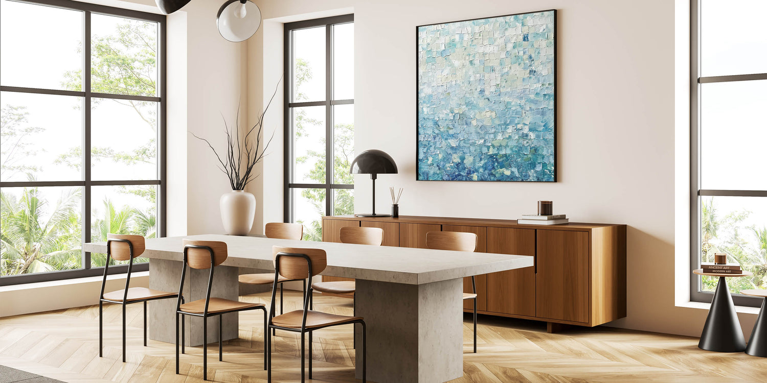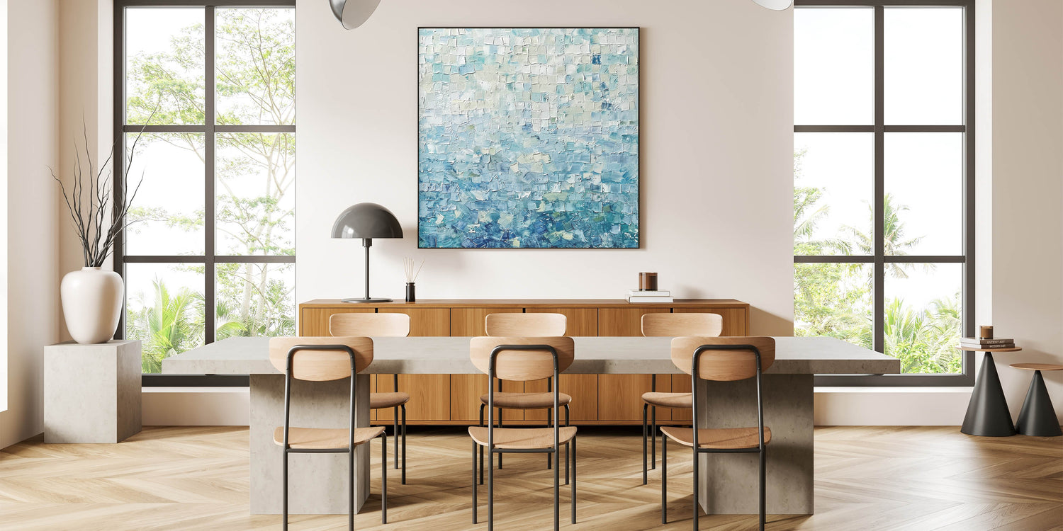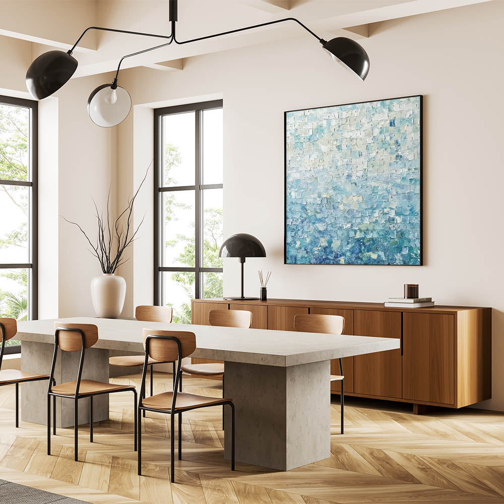 Transform your space with the tranquil beauty of this Soft Abstract Mosaic Art. Featuring a harmonious blend of pastel blue, mint green, and white tones, this artwork uses a textured mosaic pattern to create depth and serenity. Its gentle colors evoke feelings of calmness and balance, making it an ideal addition to contemporary and minimalist interiors.