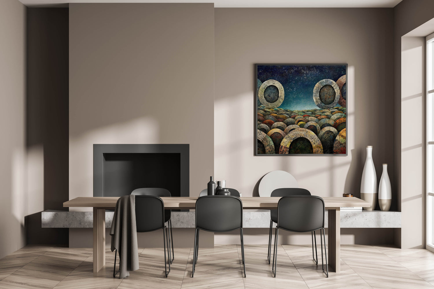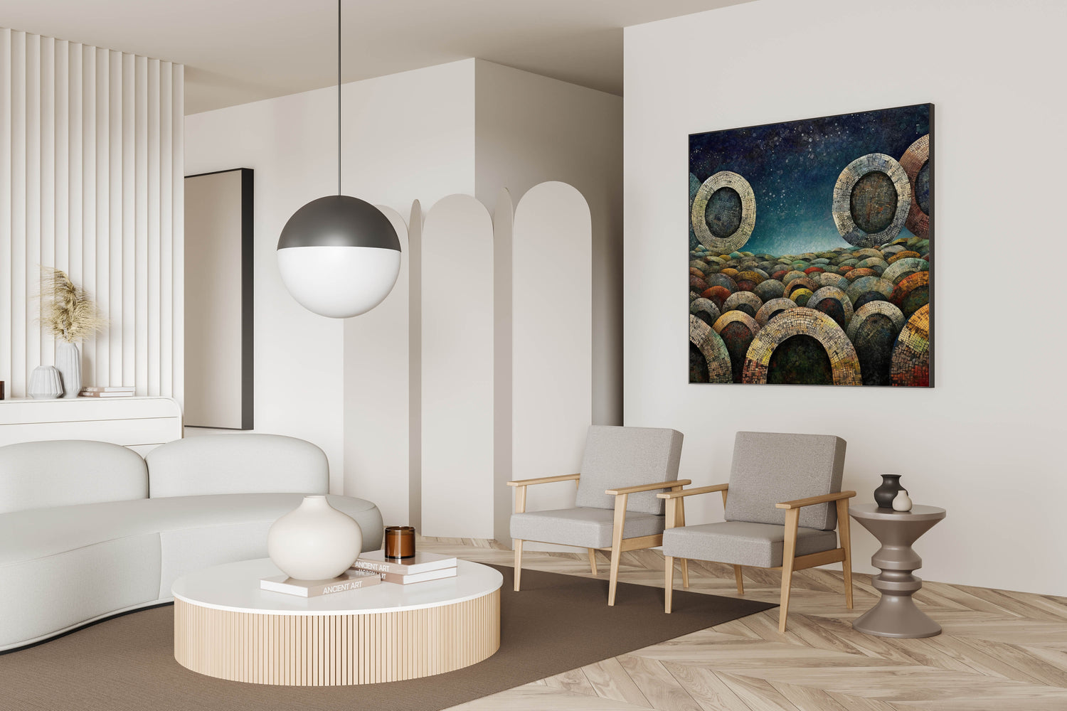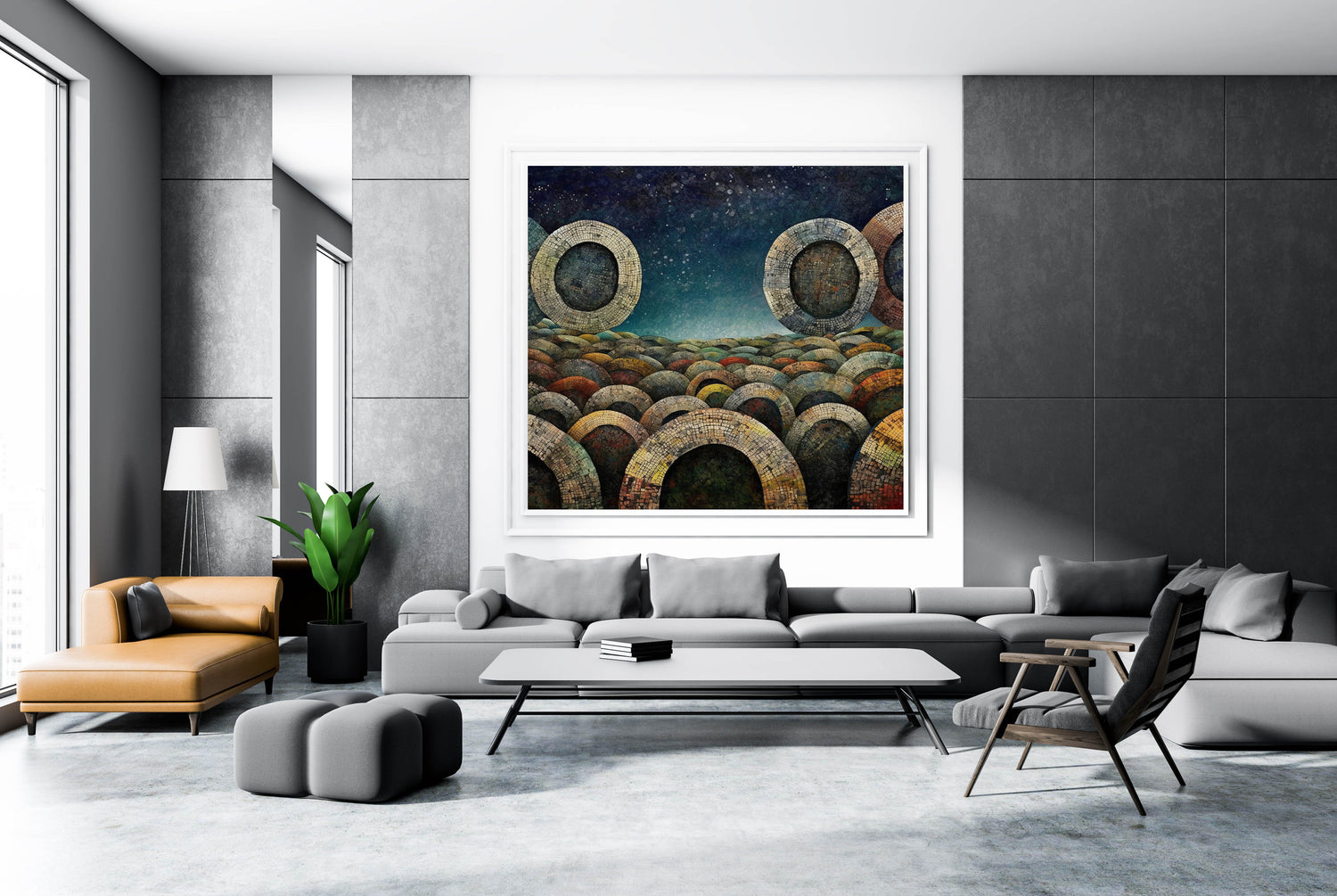 Discover the intrigue of a surreal landscape with this captivating Abstract Landscape Art. Featuring arching stone-like structures set against a textured, starry night sky, this artwork combines muted blues, greens, and earthy hues to create a dreamlike scene. The intricate mosaic patterns evoke a sense of ancient ruins and timeless wonder, making it a compelling focal point for any space.