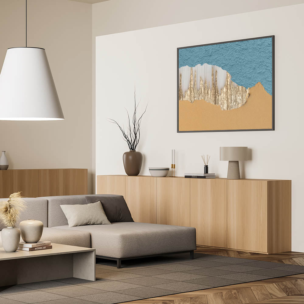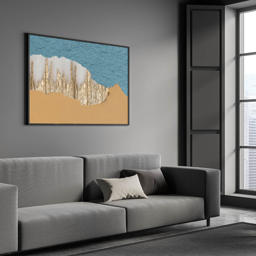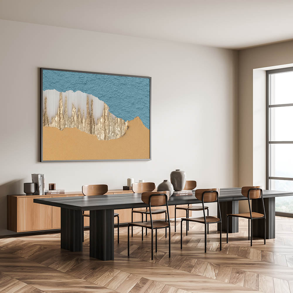 Discover the perfect blend of modern elegance and natural inspiration with this textured abstract artwork. The piece features a harmonious mix of teal, gold, and beige layers, creating a visually striking composition that captures the essence of a serene landscape. The intricate textures and metallic accents add depth and dimension, making this artwork a stunning focal point for any room.