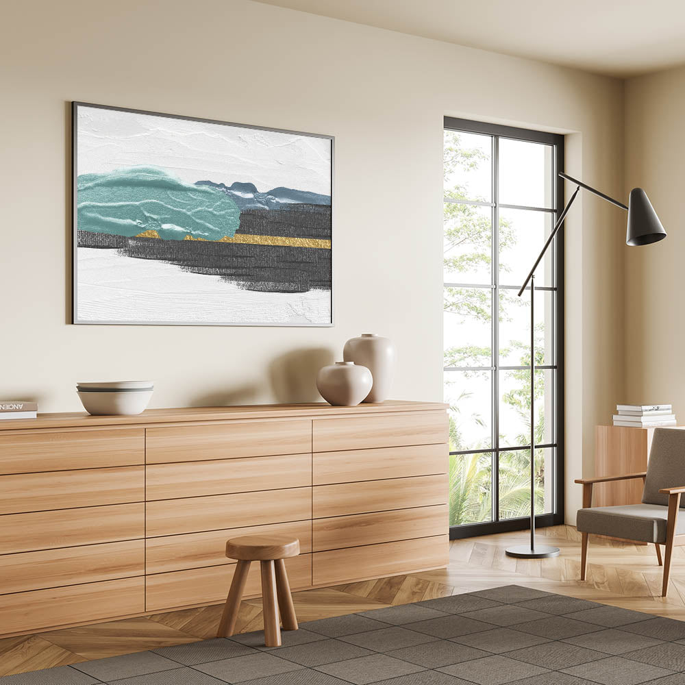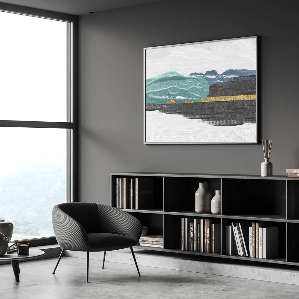 Bring a serene yet striking element into your space with this "Textured Abstract Landscape Art." This piece features a harmonious blend of teal, gold, and black tones, layered with rich textures that evoke the feel of a modern abstract landscape. The subtle gold accents add a touch of luxury, making this artwork an ideal choice for those looking to enhance their interiors with contemporary elegance.