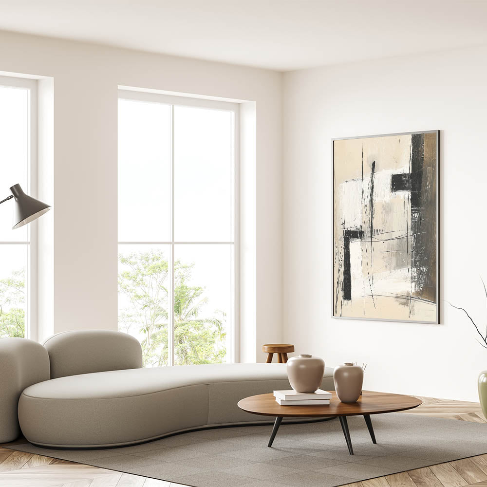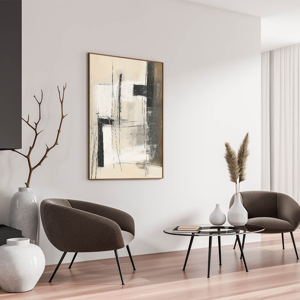 Bring elegance to your space with this Textured Abstract Line Art. Featuring bold, dynamic lines in black and white over soft beige and taupe backgrounds, this piece exudes a sophisticated minimalist vibe. Its neutral tones make it a versatile addition to any modern or contemporary decor, adding depth and texture to any room. Ideal for living rooms, offices, or bedrooms where subtle sophistication is desired.