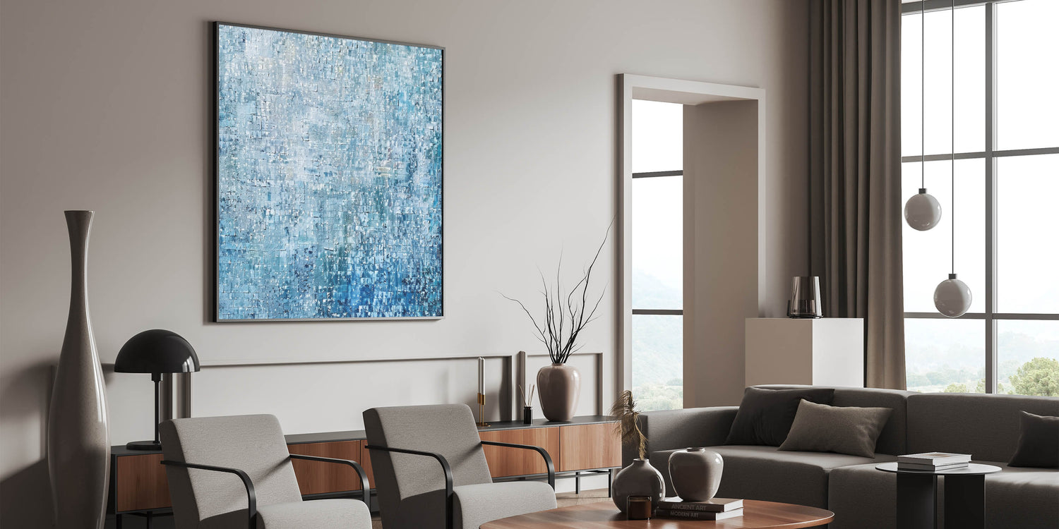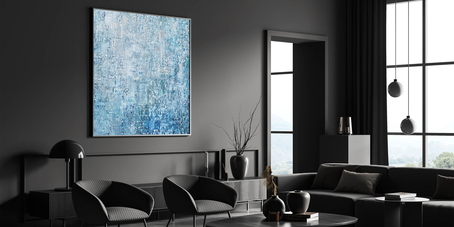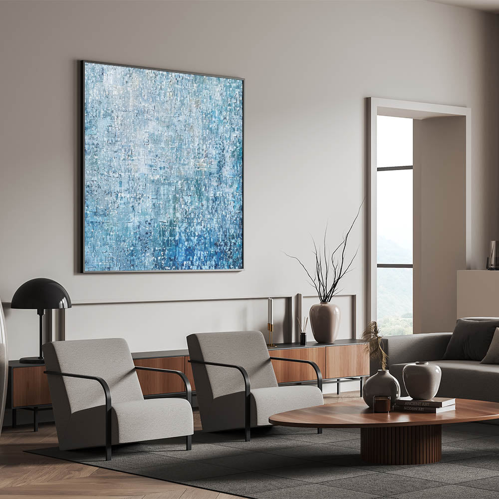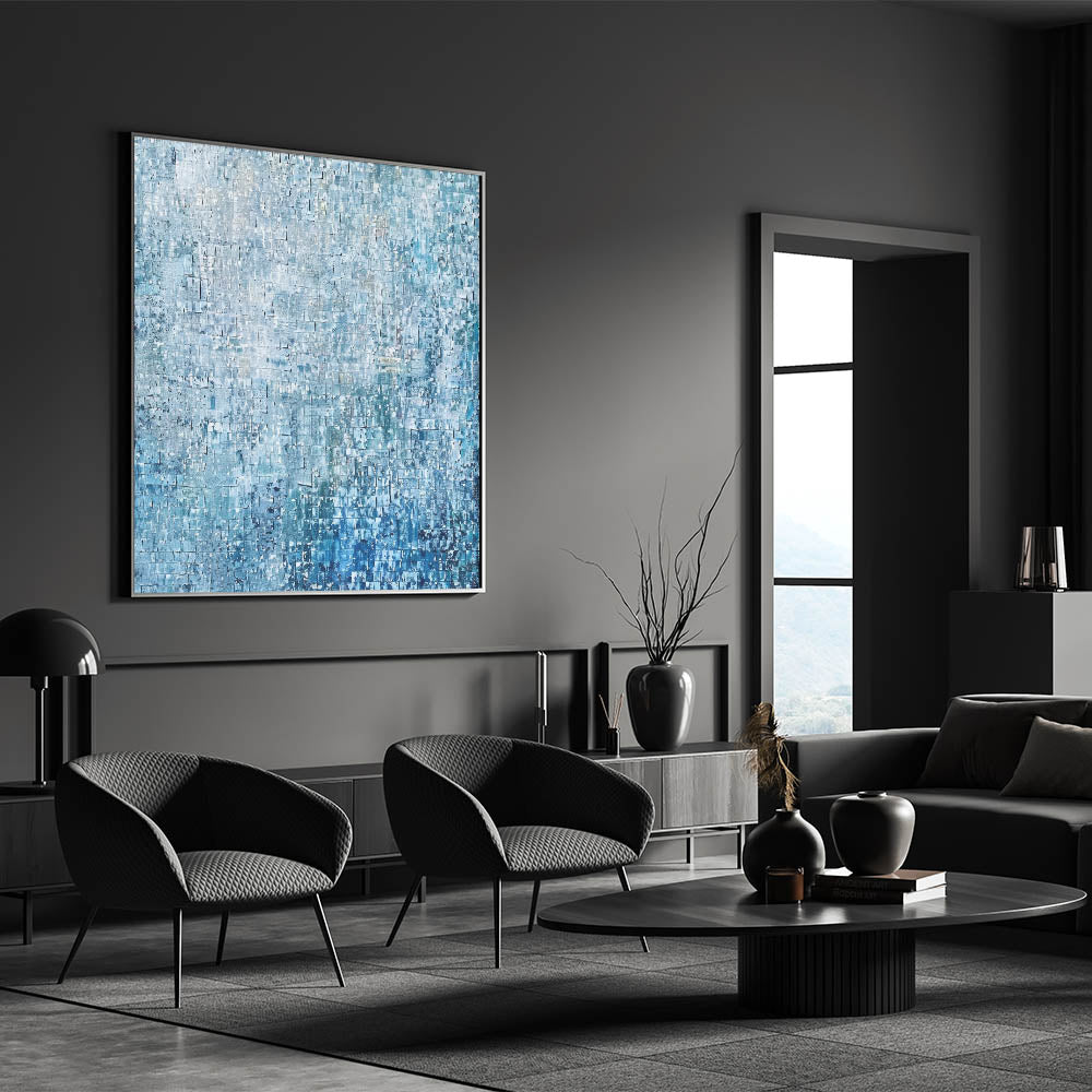 Embrace the tranquility of textured artistry with this Blue Mosaic Abstract Splatter Art. Featuring intricate layers of varying blue tones, this piece captures the essence of calmness and depth. The mosaic-like pattern adds a tactile dimension to the design, making it an ideal centerpiece for minimalist or modern spaces.
