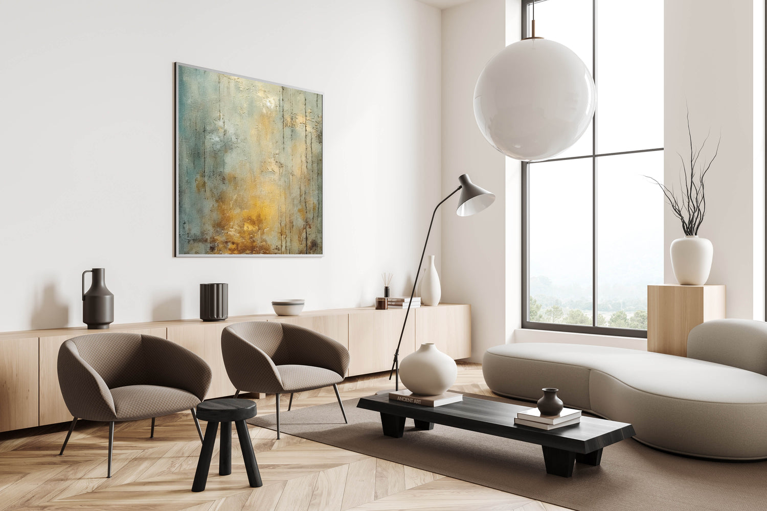 - A soothing blend of teal, beige, and golden ochre with a textured, layered finish