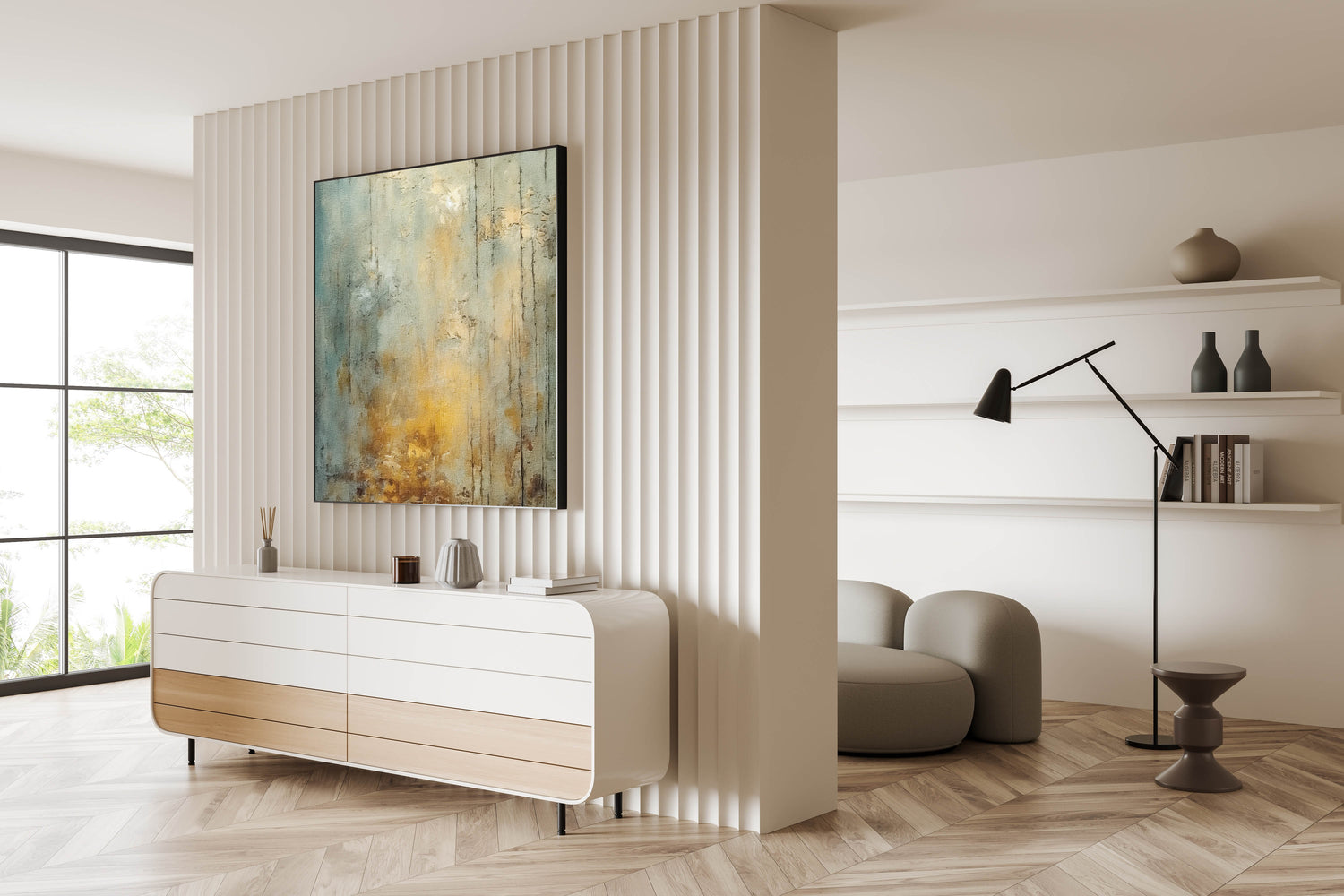 Bring a sense of calm and warmth to your space with this stunning textured abstract wall art. Featuring a delicate blend of teal, beige, and golden ochre, this artwork is defined by its vertical brush strokes and weathered texture. The soft, muted tones give the piece a serene, ethereal quality, making it a versatile choice for any modern or rustic interior.