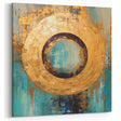 Bring a touch of luxury to your space with this striking geometric abstract art. The design features a large circular gold stroke set against a textured backdrop of turquoise and deep navy blue. This piece effortlessly combines vibrant color and elegant metallics, creating a dynamic focal point perfect for modern and contemporary interiors.