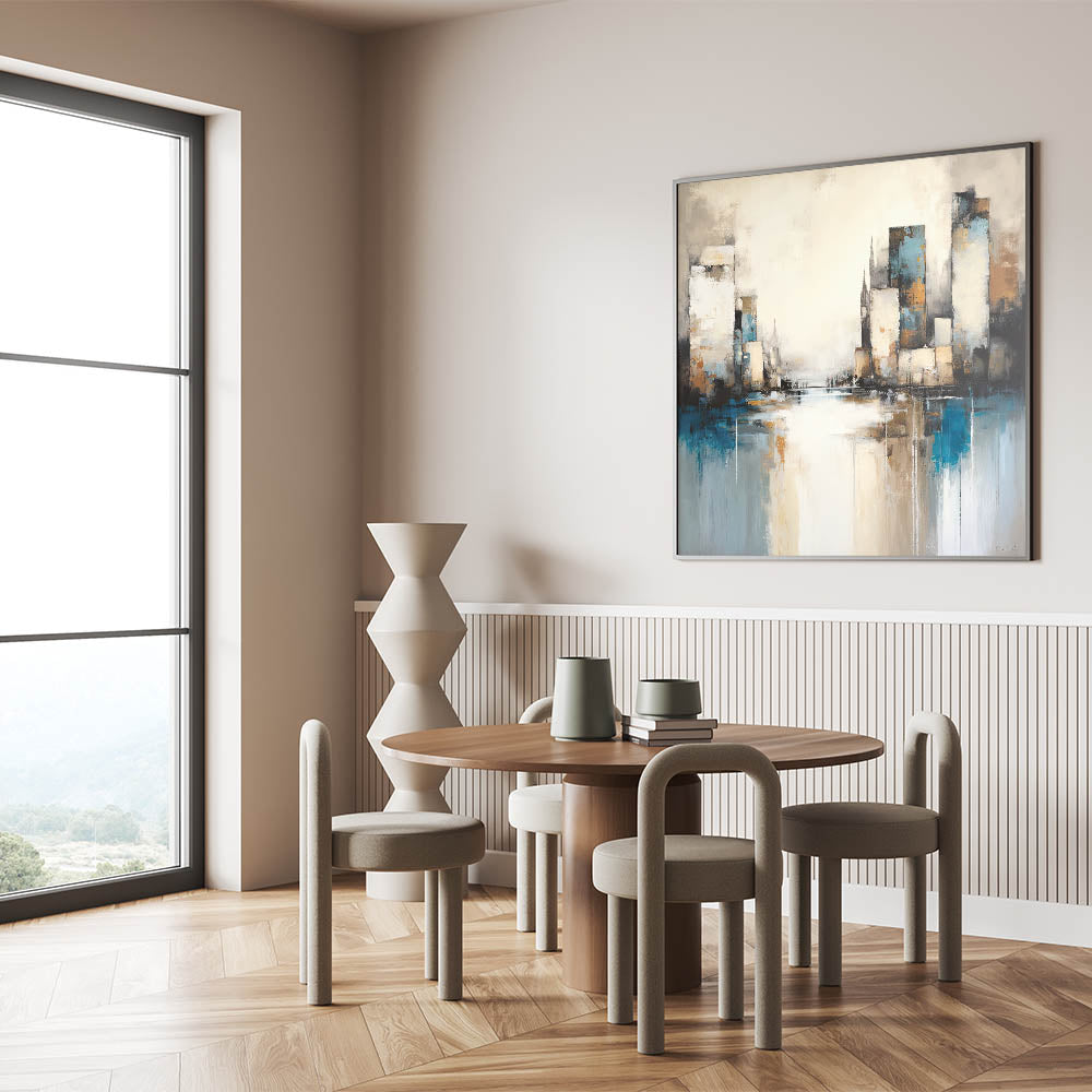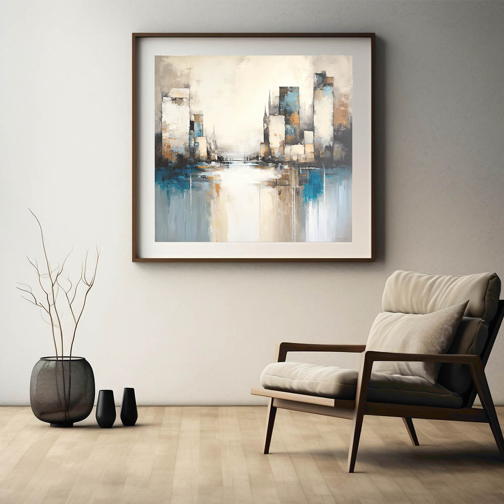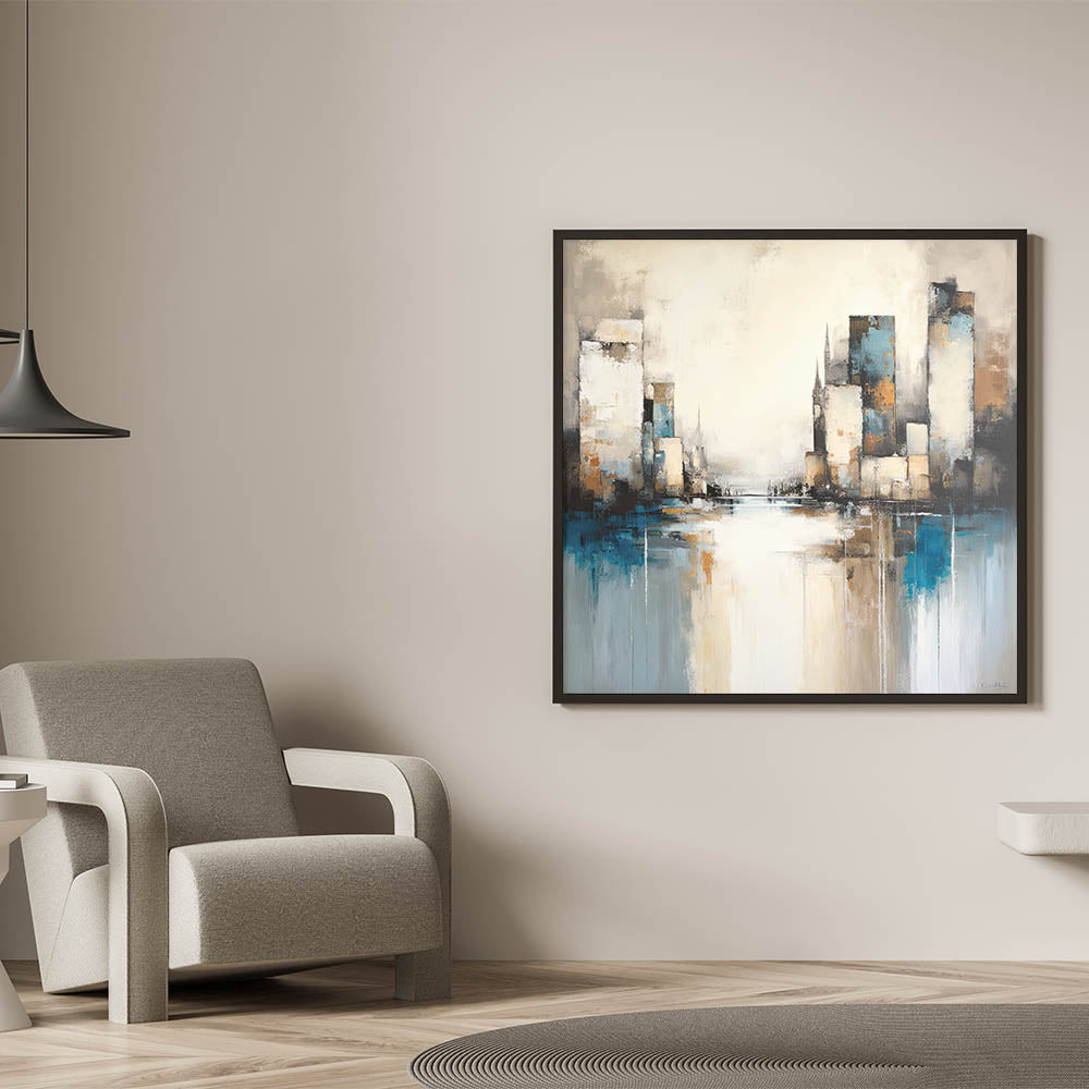 Capture the dynamic energy of the city with this Urban Skyline Abstract Architecture Art. Featuring towering skyscrapers and reflections over a tranquil water surface, this artwork combines shades of blue, beige, and subtle grays to create a harmonious yet vibrant cityscape. The abstract style adds a touch of modern sophistication, making it perfect for contemporary spaces.