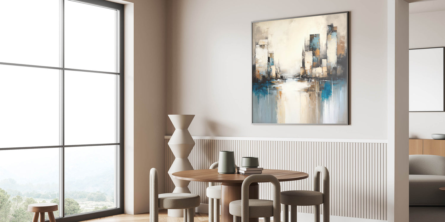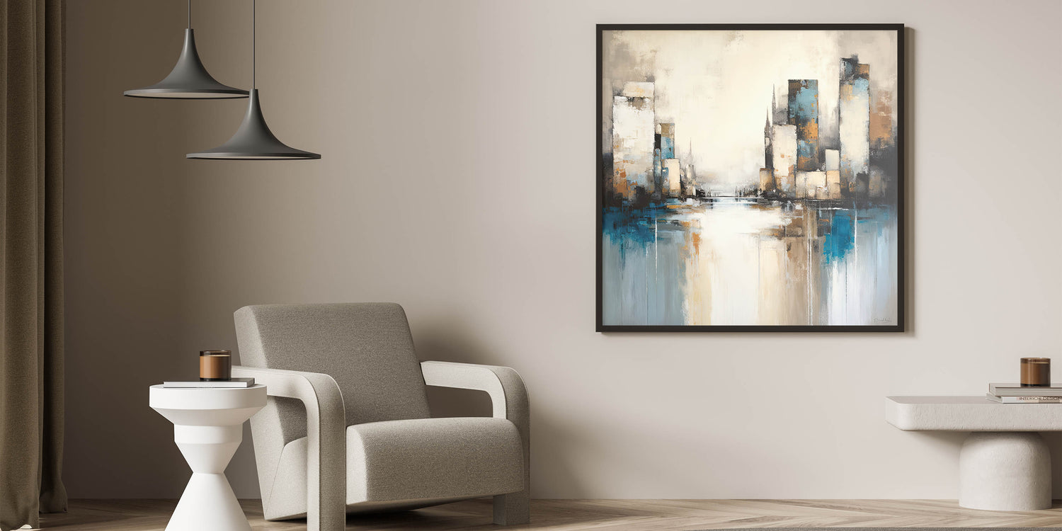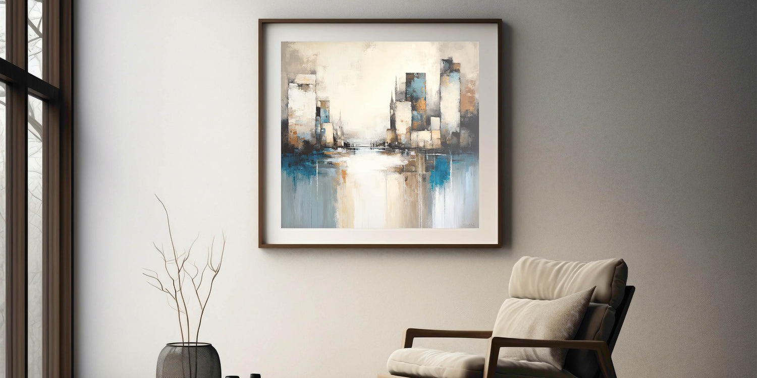 Capture the dynamic energy of the city with this Urban Skyline Abstract Architecture Art. Featuring towering skyscrapers and reflections over a tranquil water surface, this artwork combines shades of blue, beige, and subtle grays to create a harmonious yet vibrant cityscape. The abstract style adds a touch of modern sophistication, making it perfect for contemporary spaces.