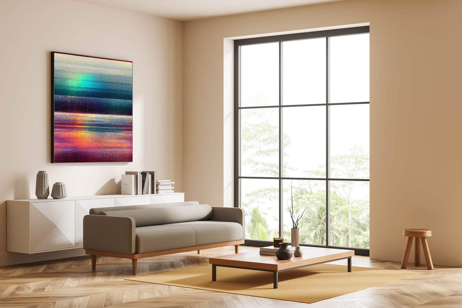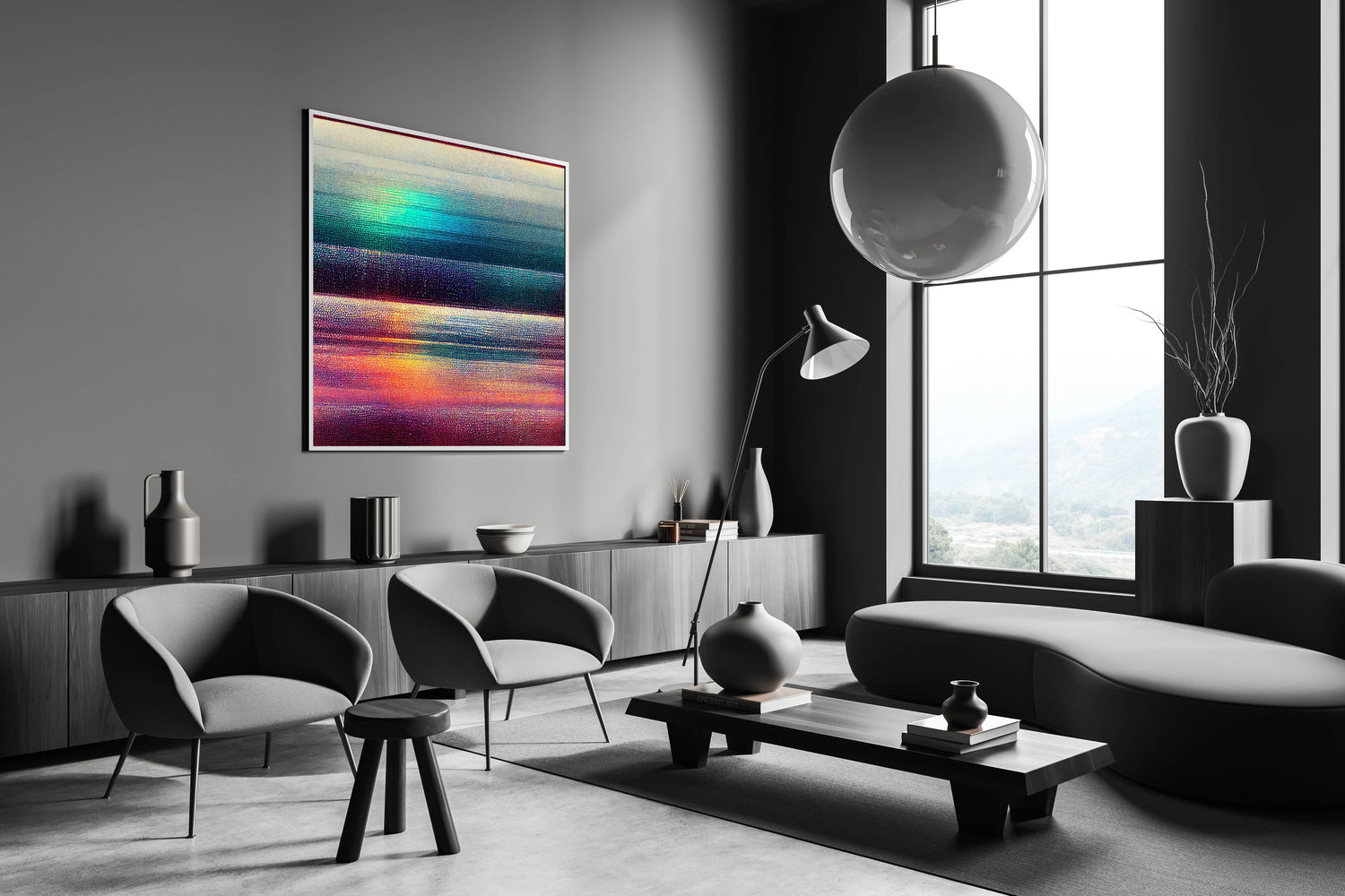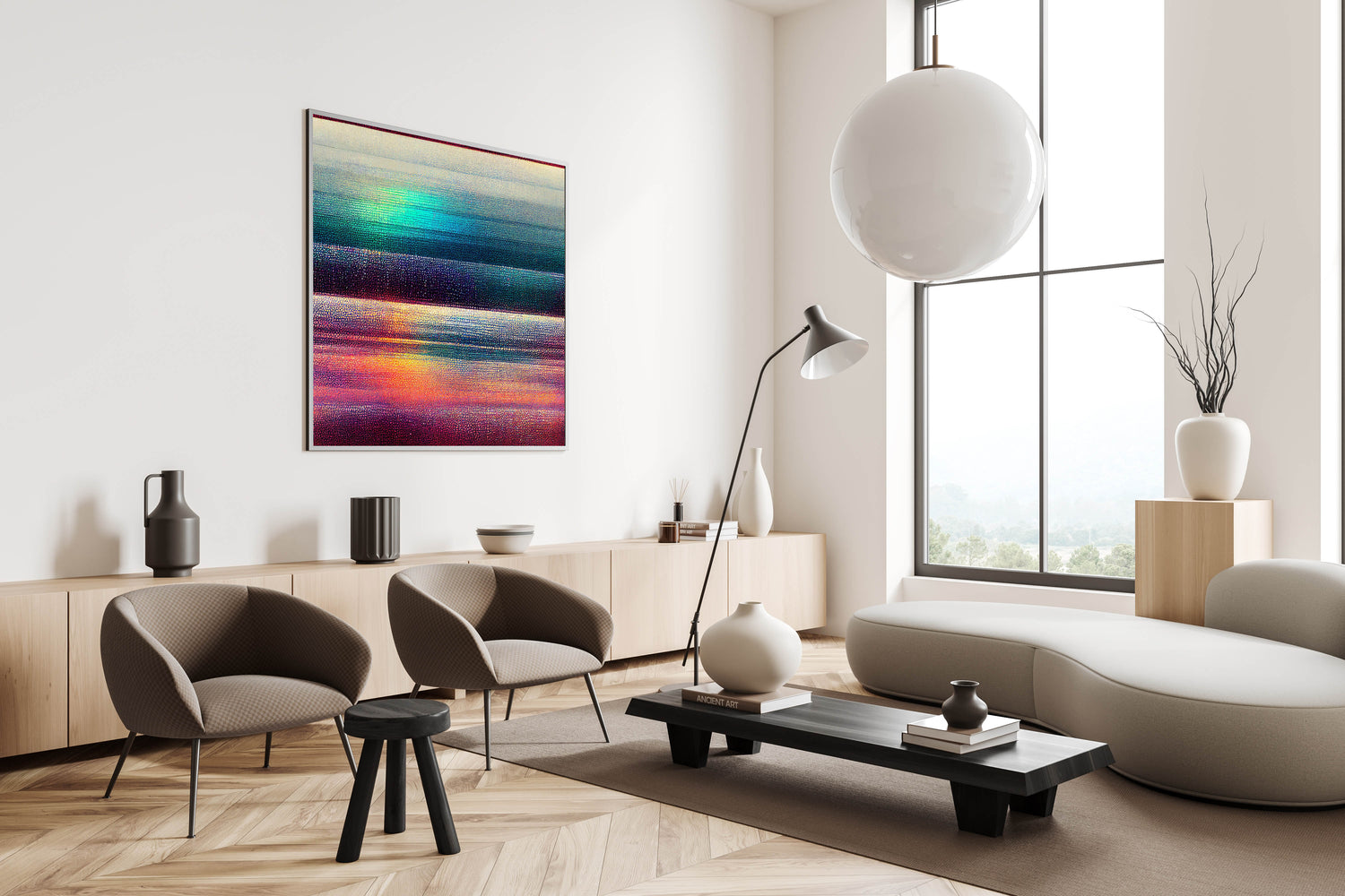 Infuse your space with color and texture through this vibrant mosaic abstract artwork. The canvas features bold horizontal stripes, transitioning from cool teal and blue tones to warm shades of purple, pink, and golden yellow. The textured, mosaic-like finish adds a dynamic and tactile element, making this piece a stunning focal point for any room. Perfect for modern and eclectic interiors, it captures the essence of a serene sunset over the ocean.