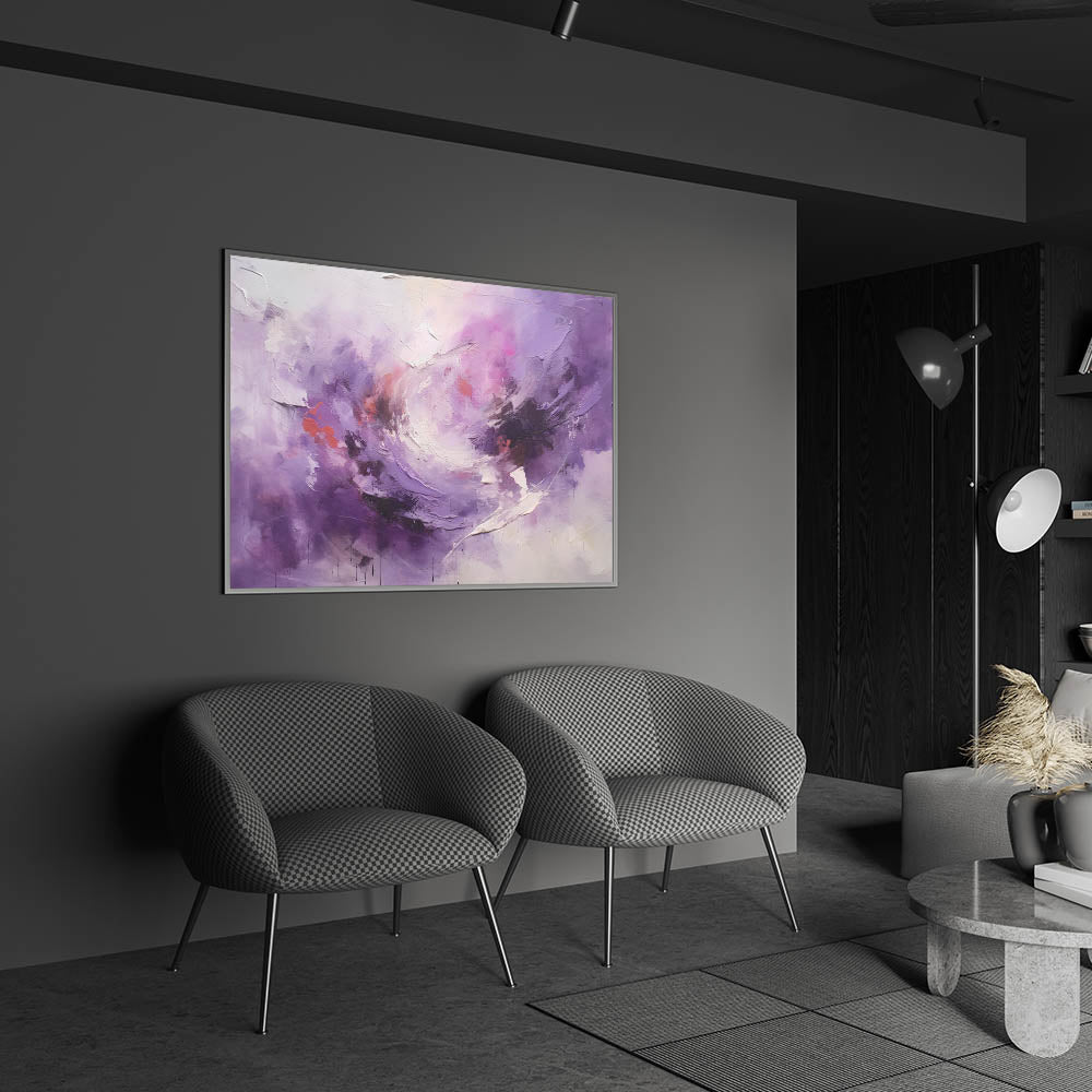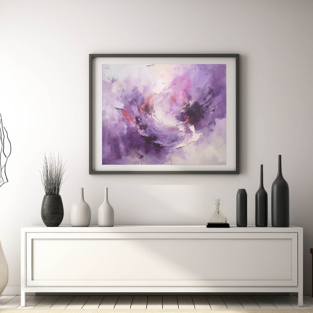 Experience the vibrant energy of this purple swirl abstract art, featuring bold brushstrokes in shades of violet, lilac, and deep purple. The dynamic composition is enhanced by splashes of pink and hints of black, creating a captivating visual effect. The swirling patterns give a sense of movement and depth, making this canvas print an eye-catching addition to any space. Perfect for those seeking a bold and modern statement piece, this artwork adds a touch of sophistication and creativity to your decor.