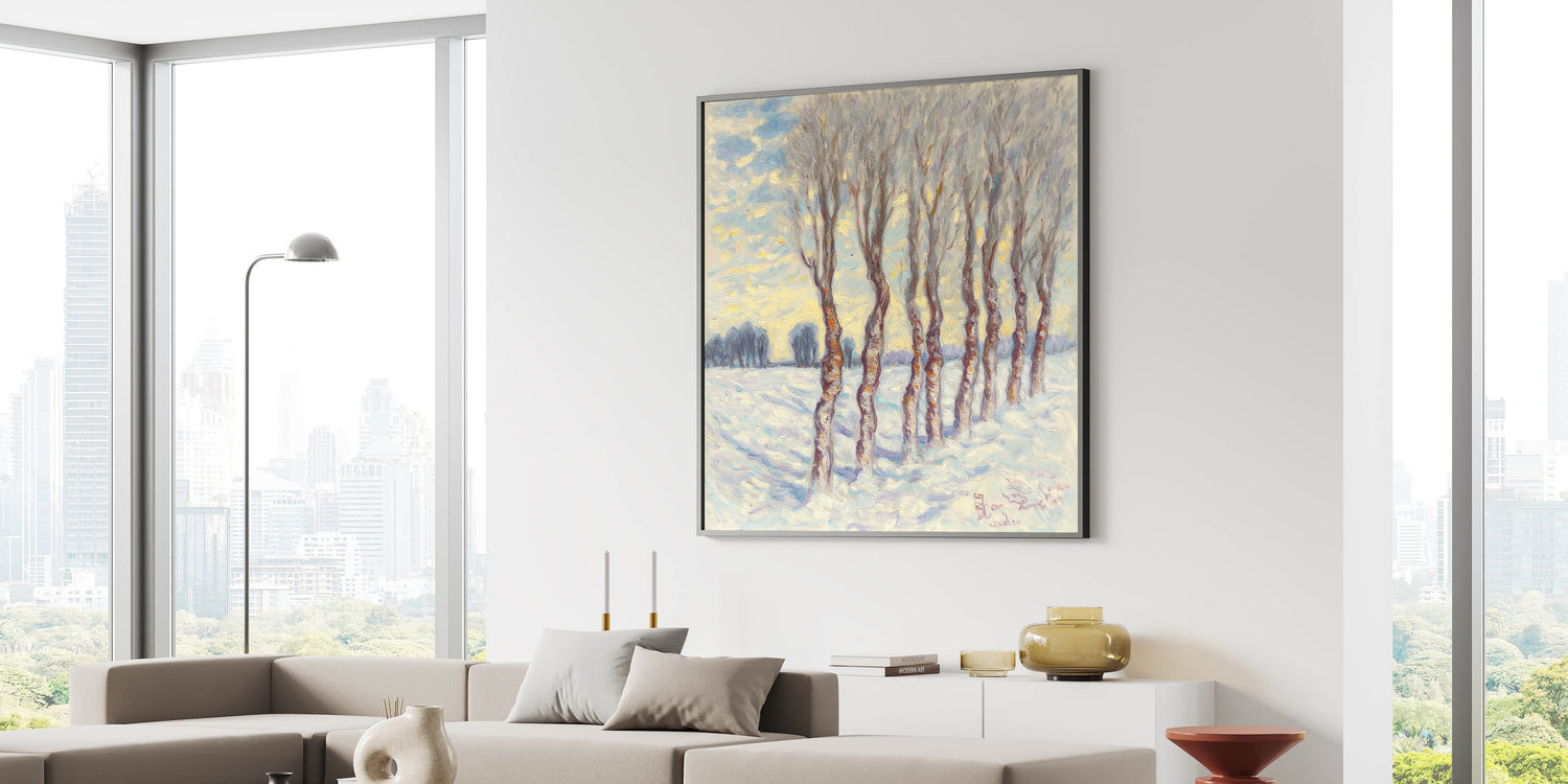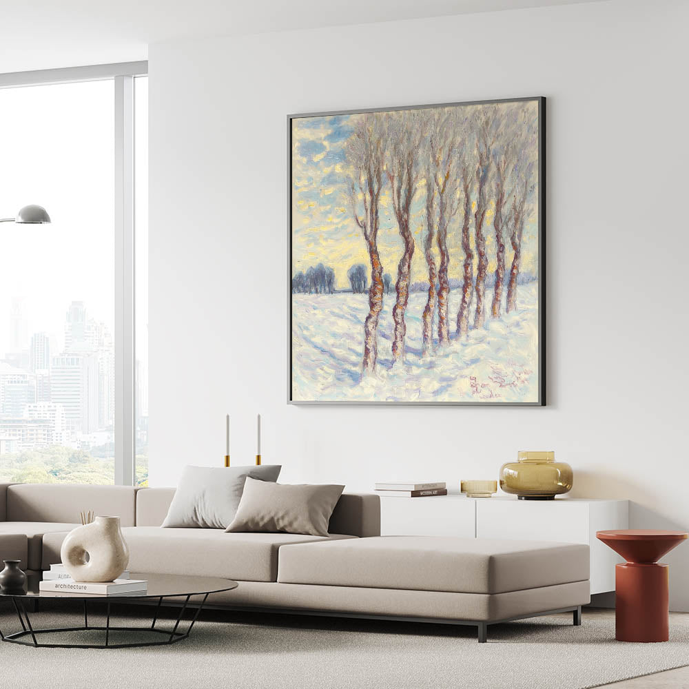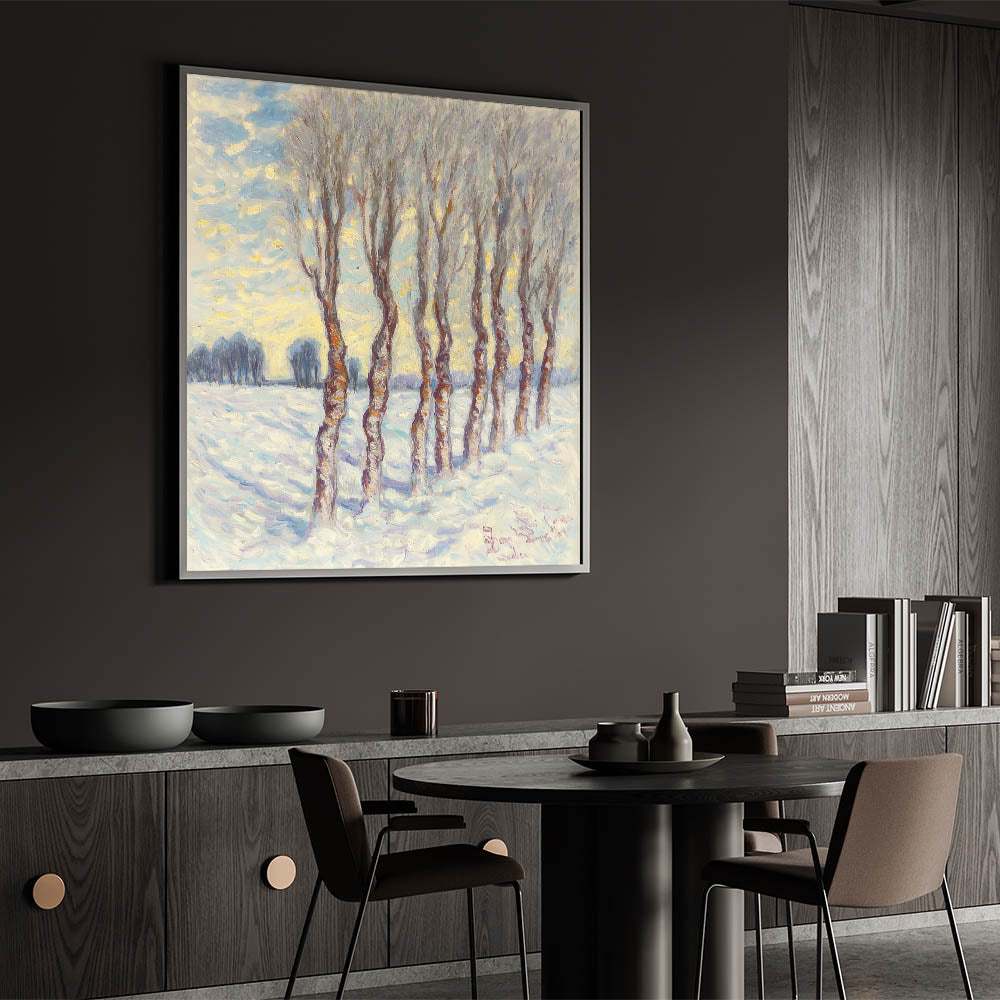 Step into the serene beauty of a snowy landscape with this enchanting abstract floral artwork, showcasing a grove of slender trees under a soft blue and white winter sky. The impressionistic brushstrokes and warm brown tree trunks add a touch of warmth to the cool, tranquil setting, making this piece perfect for modern, rustic, or classic interiors.