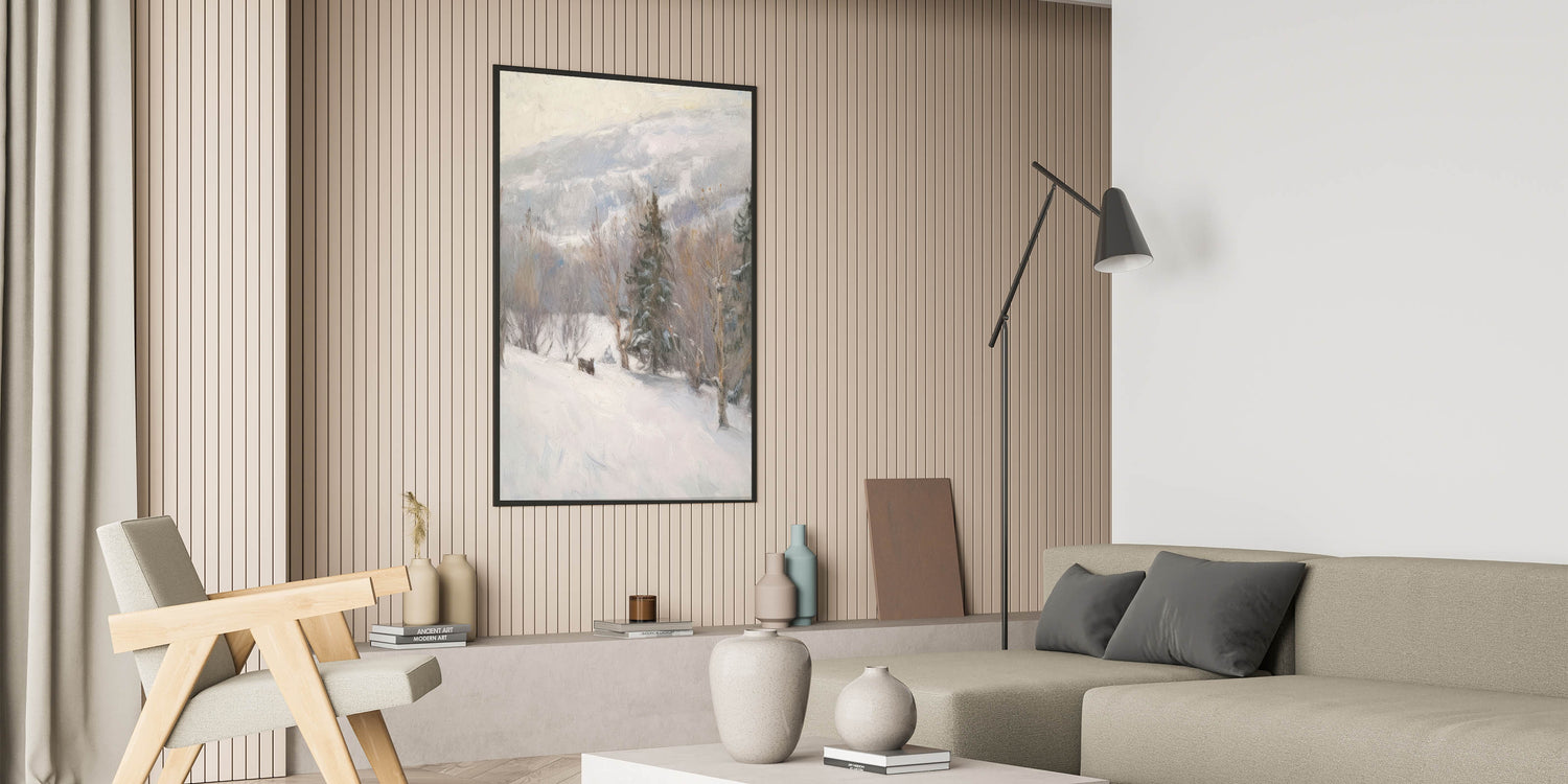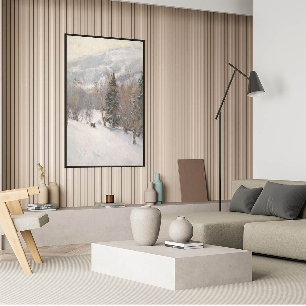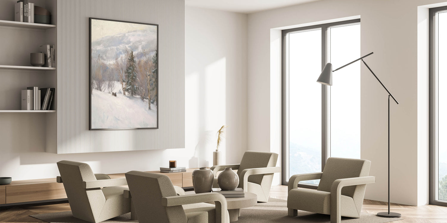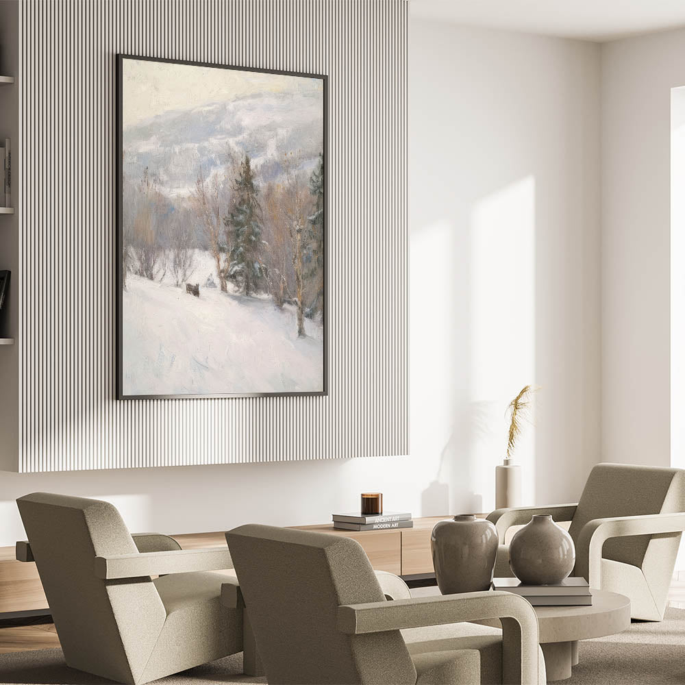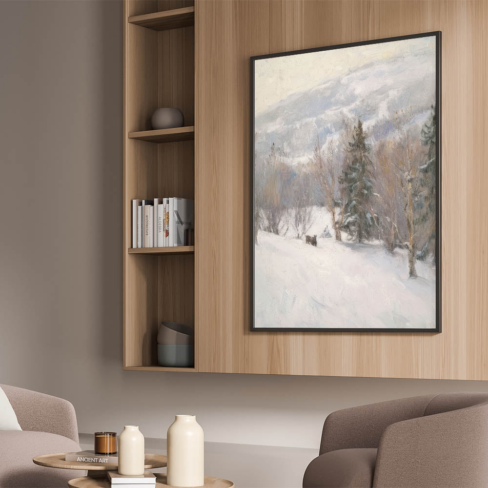 Transform your space with this stunning winter wonderland canvas, featuring a serene snowy landscape with delicate trees and a peaceful mountain backdrop. The subtle hues of white, gray, and soft blues evoke a tranquil atmosphere, making it the perfect addition to modern, rustic, or minimalist interiors. A lone figure of nature amidst the snow adds a touch of life to this breathtaking scene, capturing the essence of winter’s quiet beauty.
