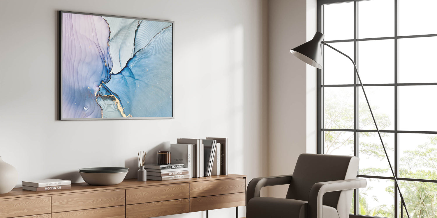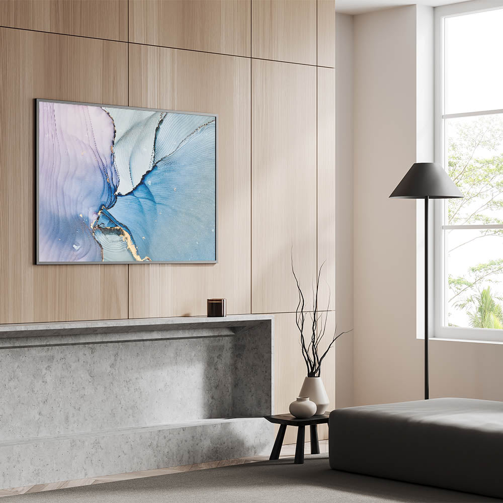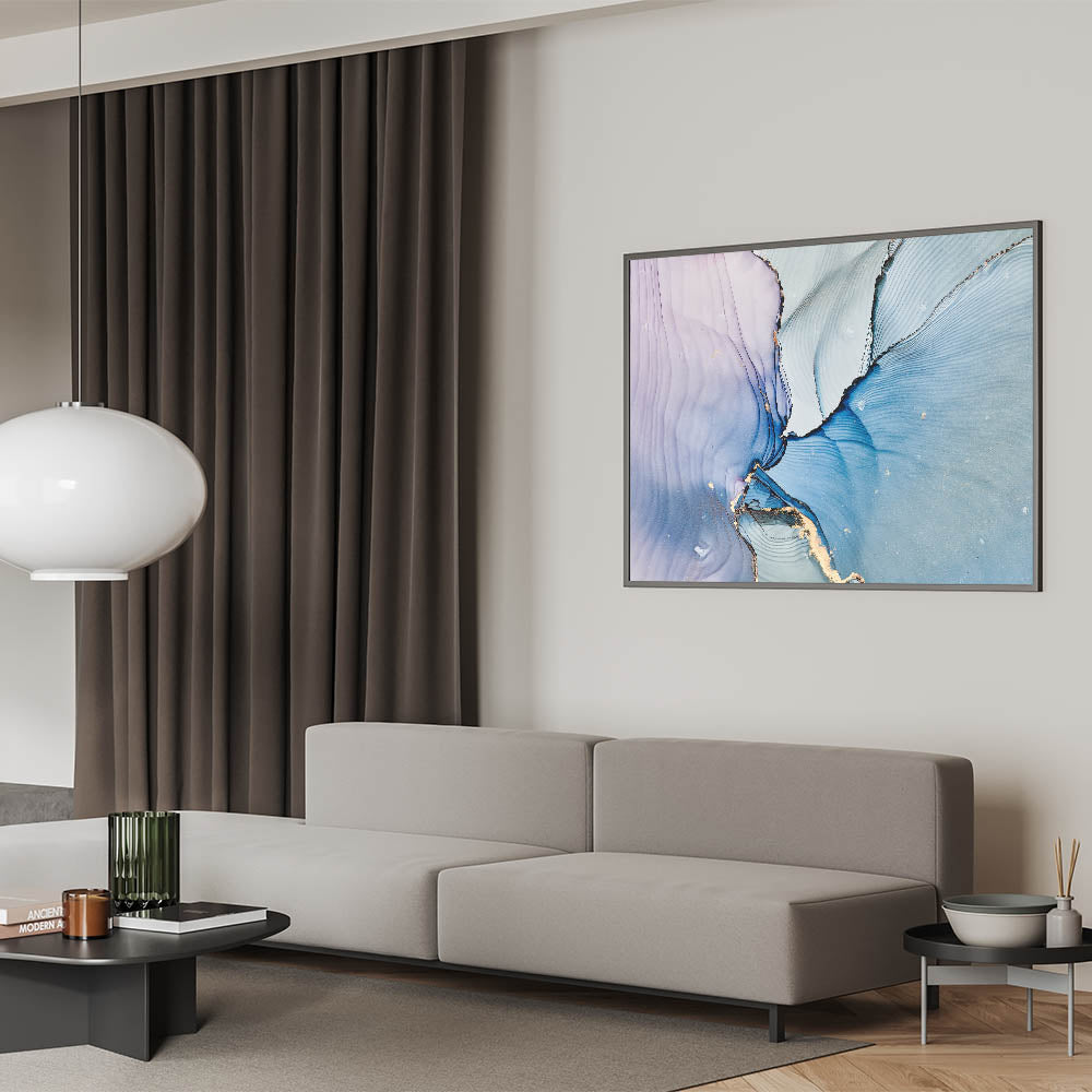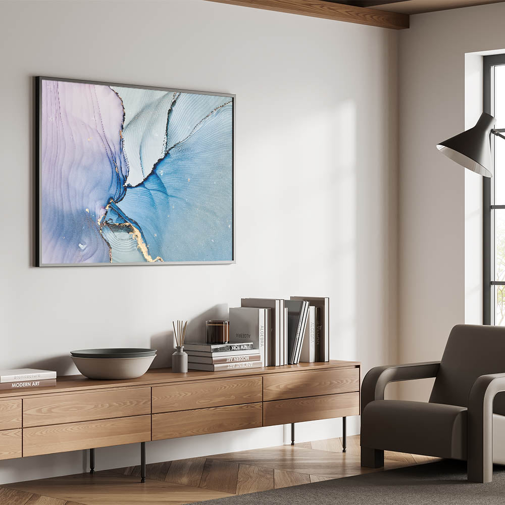 This exclusive abstract design for modern spaces blends soft blue and lilac hues with gold highlights, offering sophisticated abstract art to enhance your decor. Whether as a framed print, acrylic glass, or luxury canvas, this upscale abstract piece for elegant decor brings serenity to any space.