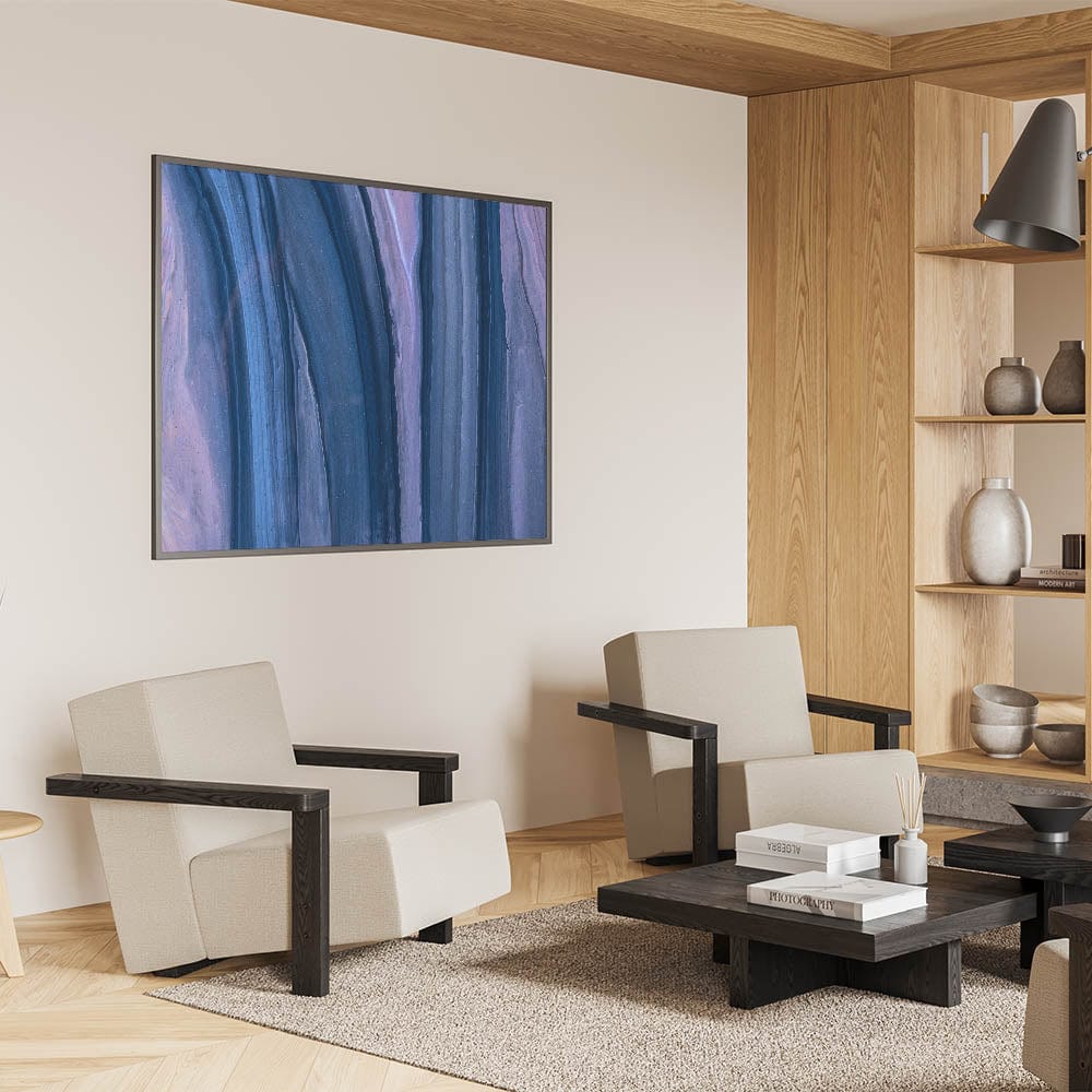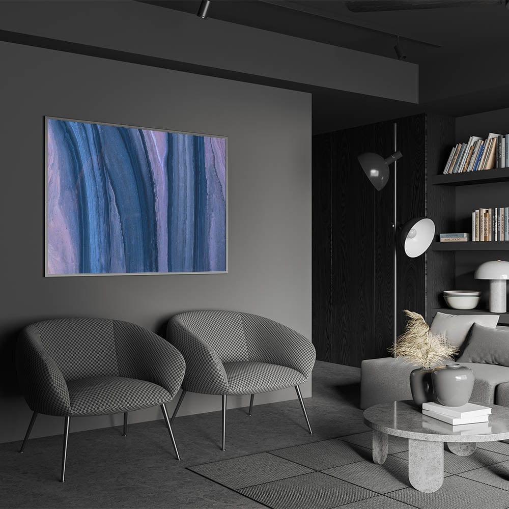 Create a calming atmosphere with this serene abstract fluid canvas. Featuring soft muted blue tones blended with deep plum hues, this contemporary fluid art piece exudes elegance and tranquility. The flowing patterns and delicate gradients bring a sophisticated yet peaceful aesthetic to any interior.