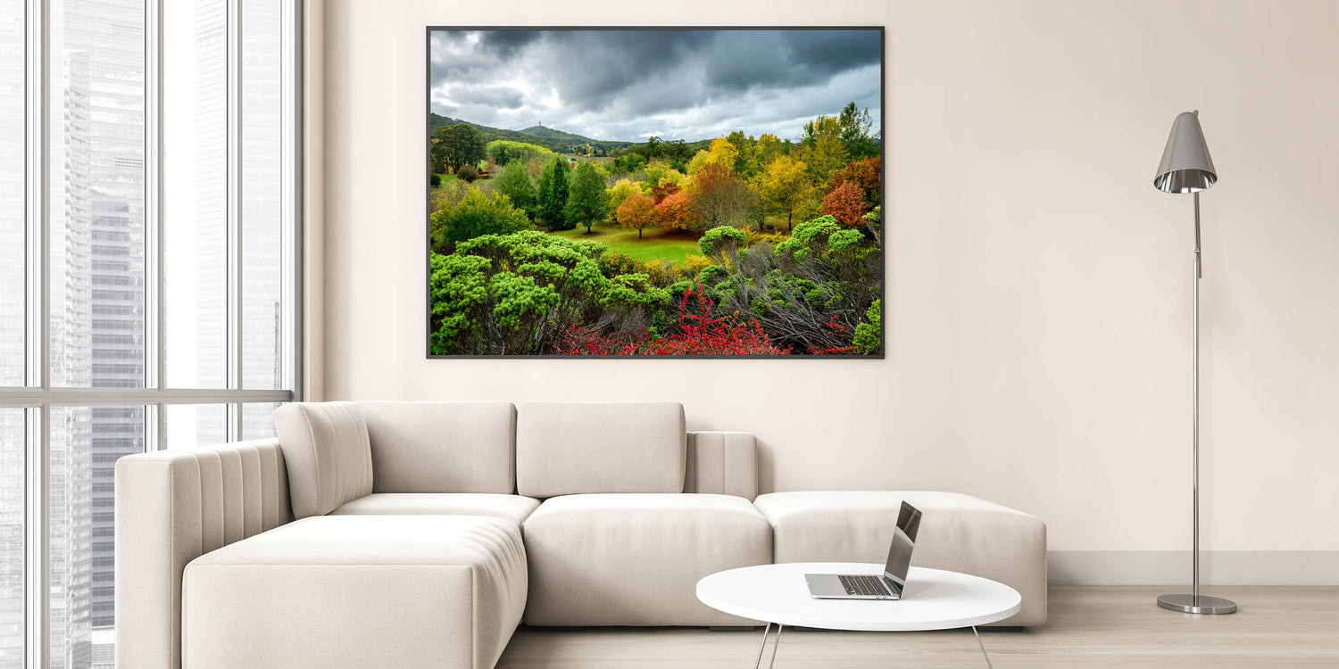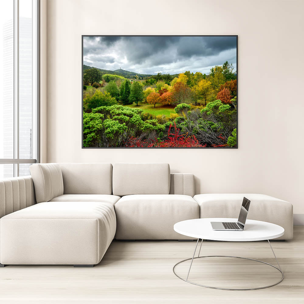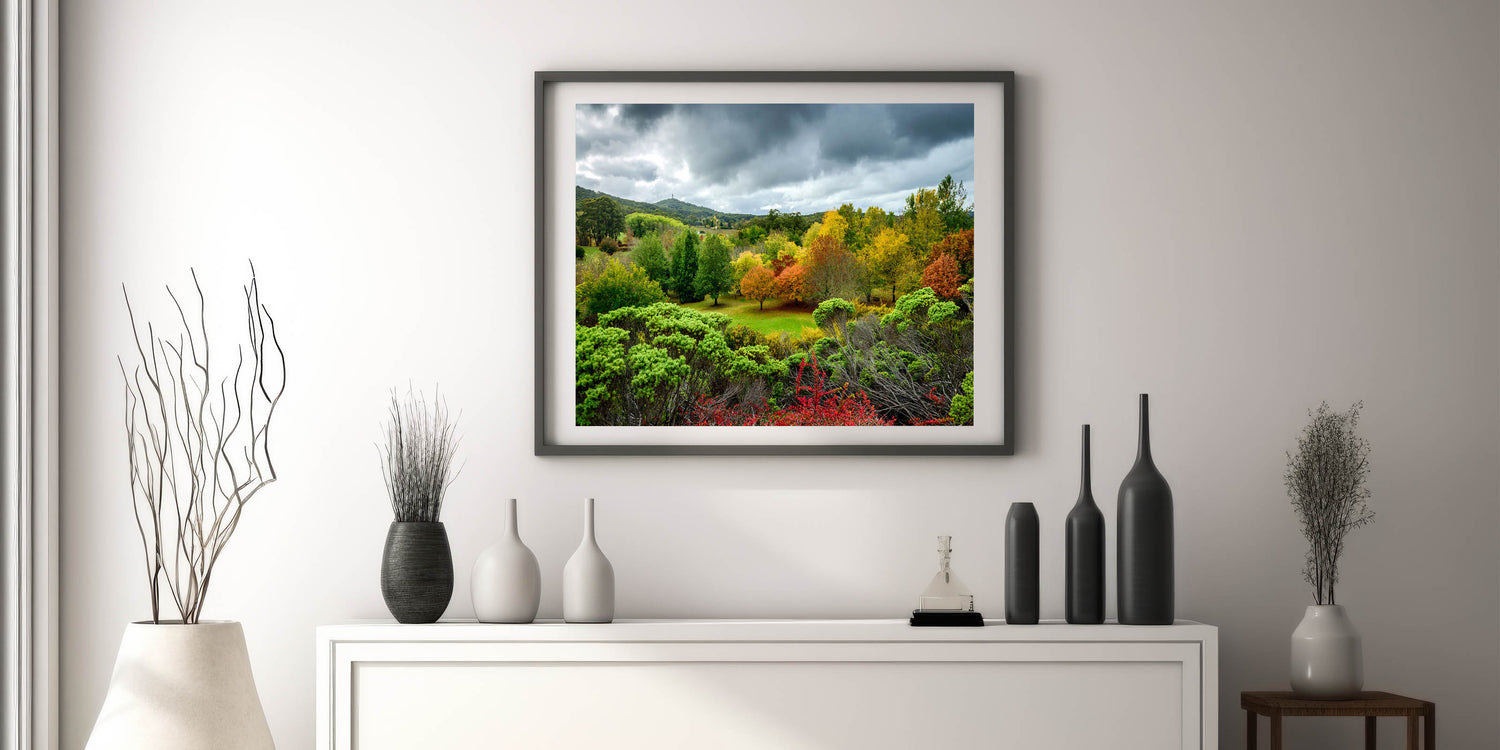 Add a touch of nature's beauty to your home with this stunning Adelaide landscape wall art. Capturing the vibrant hues of autumn in South Australia, this premium art print features an array of colors, from the lush greens of the trees to the warm reds, oranges, and yellows of the autumn leaves. This piece is perfect for anyone looking to bring the serene beauty of Adelaide's natural scenery into their living space.