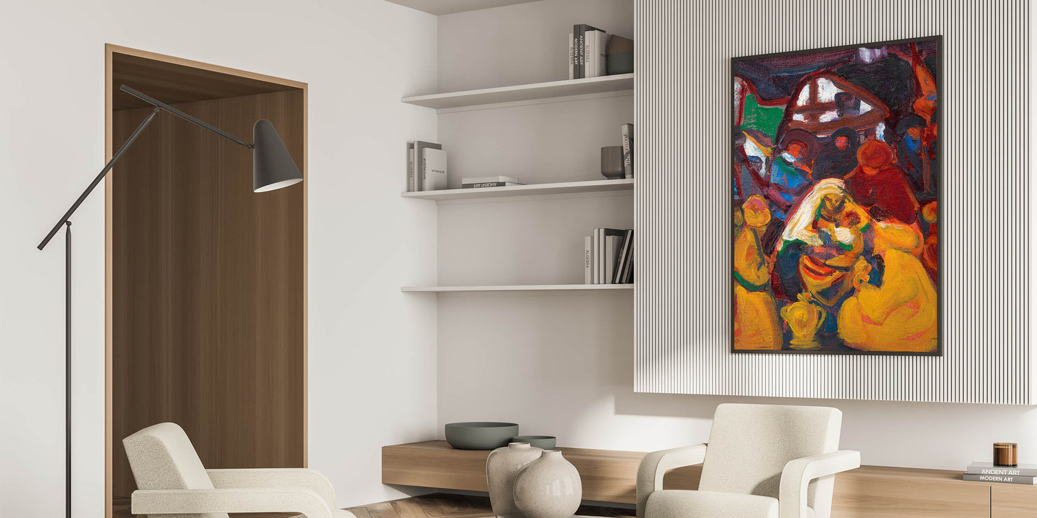 This Hölzel artwork blends modernist abstraction with the timeless narrative of religious iconography, making it an evocative piece for any space. Whether displayed in a living room, gallery, or personal office, this piece delivers a striking balance between the sacred and avant-garde.