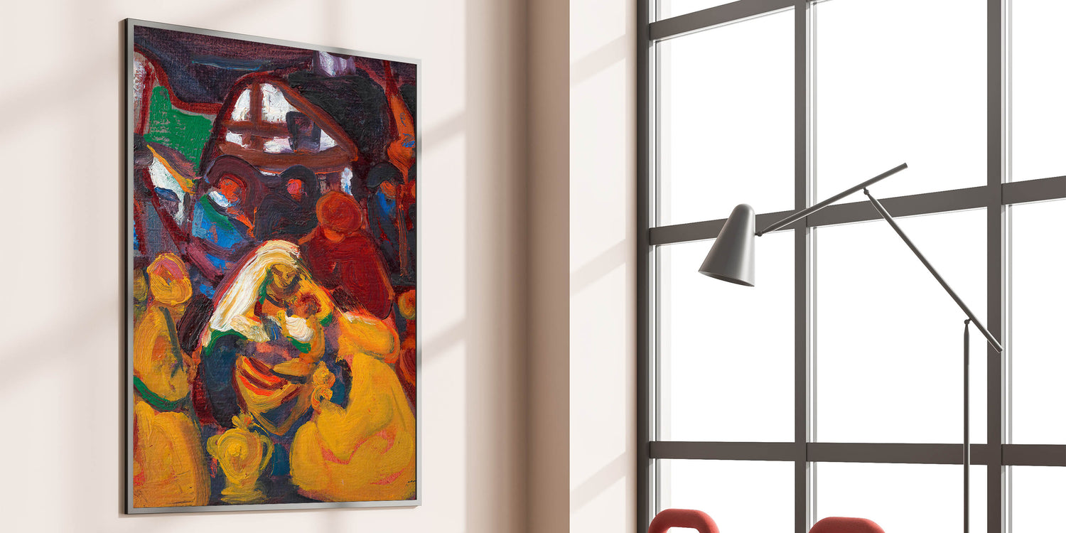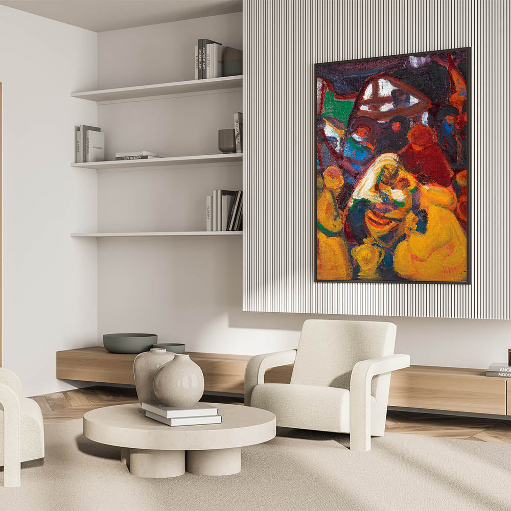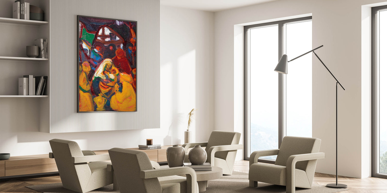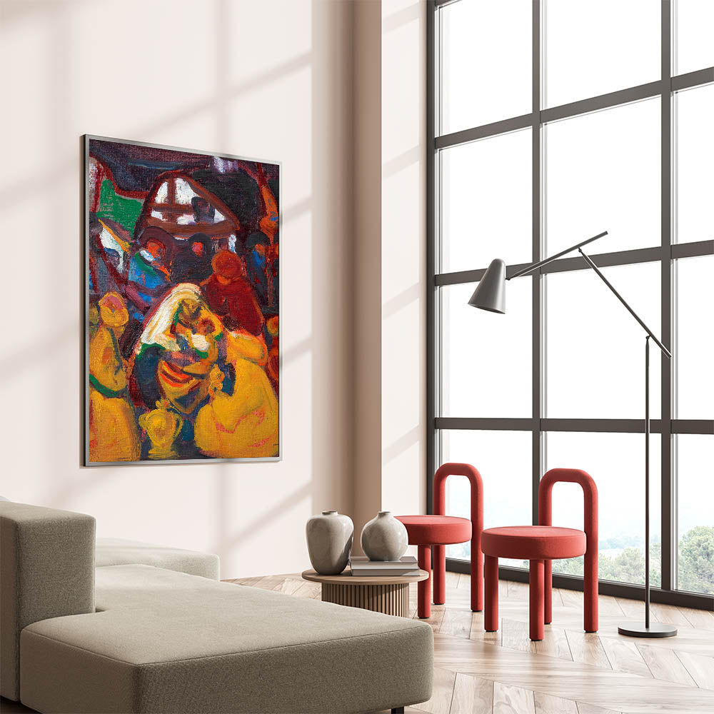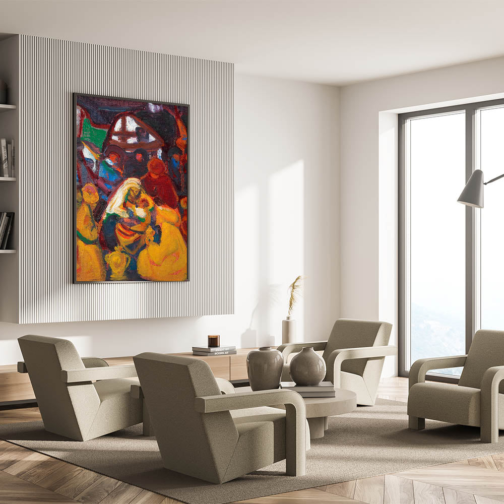 This vibrant and expressive artwork by Adolf Hölzel brings to life a bold abstract interpretation of a religious scene. With its thick, dynamic brushstrokes and rich color palette of warm oranges, reds, and yellows, this piece exemplifies Hölzel's avant-garde approach to sacred subjects. The abstract figures and emotional depth make this artwork a perfect addition for collectors of modernist art or those looking to infuse their space with a powerful visual narrative.