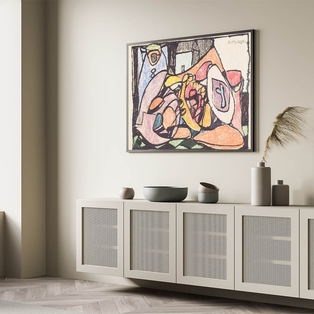 This Adolf Hölzel abstract painting captures the essence of early modernism with its intricate forms and bold composition. A unique blend of geometric shapes and expressive lines, this artwork is a true reflection of Hölzel's avant-garde style. The detailed composition, enhanced by vibrant shades of orange, yellow, and purple, draws the viewer into a complex world of abstract forms and colors.