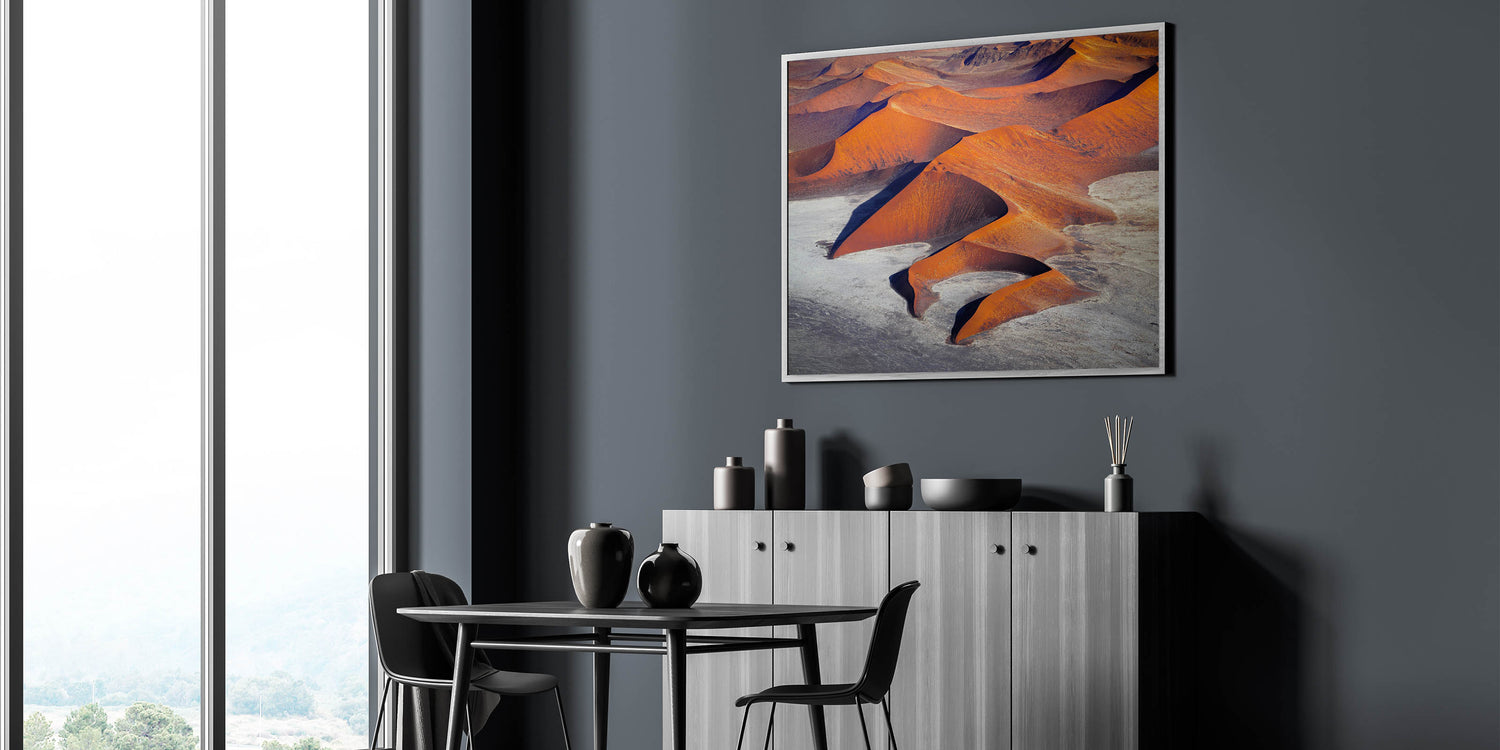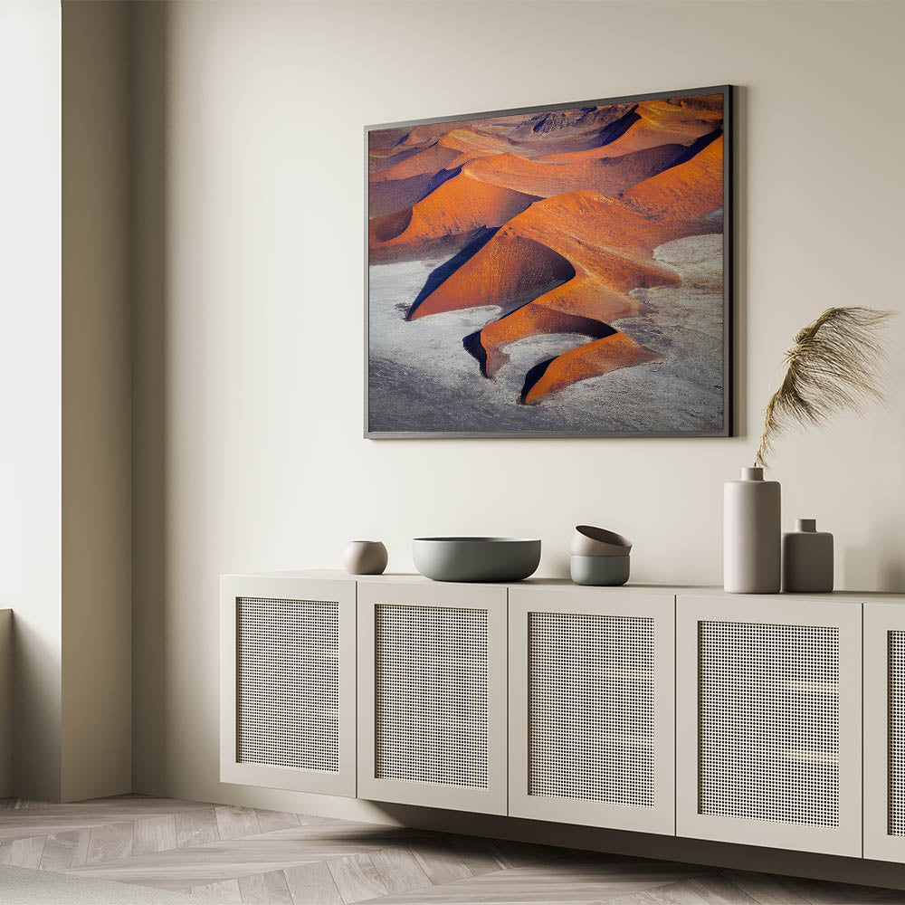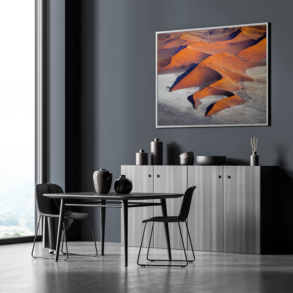 Explore the abstract beauty of Namibia's desert landscapes with this mesmerizing wall art. Captured from an aerial perspective, the undulating sand dunes create a striking pattern of shadows and vibrant orange hues against the pale desert floor. This unique piece of Namibian landscape photography is perfect for those who appreciate the natural artistry found in nature's formations, bringing a sense of depth and intrigue to any space.