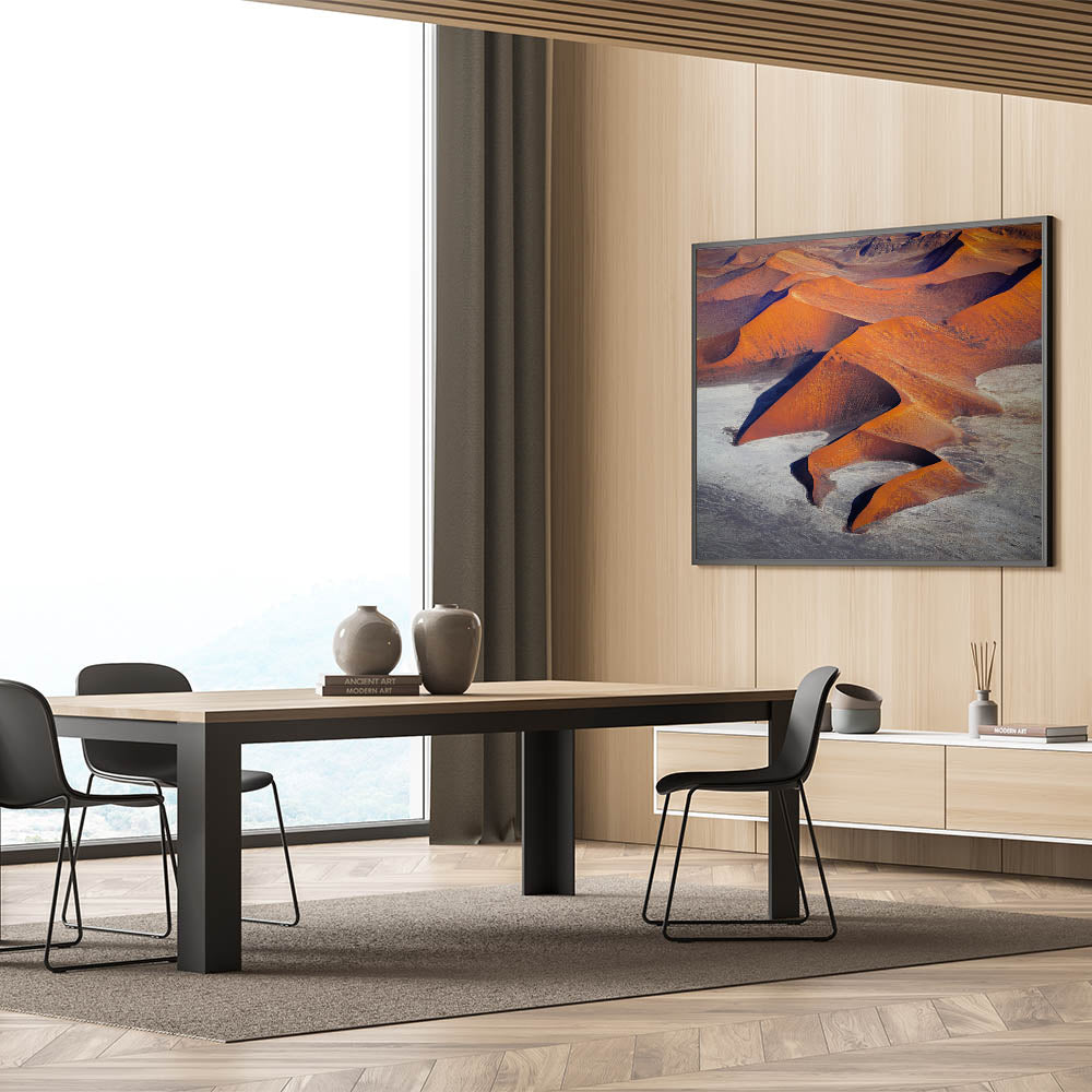 This Namibia desert art print is ideal for those who love abstract art and wish to bring a piece of Africa's natural wonder into their home or office. The dramatic interplay of light and shadow on the dunes creates a dynamic and visually stimulating piece that is sure to be a conversation starter.