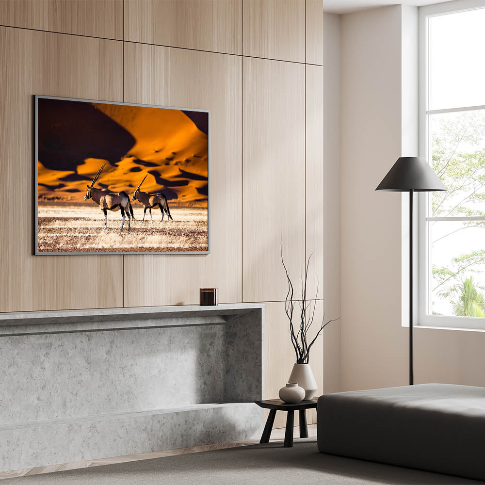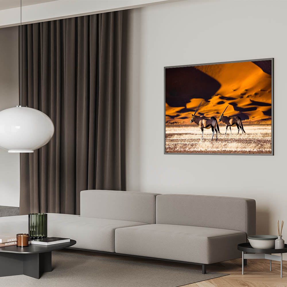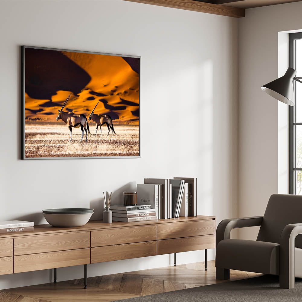 Capture the majestic beauty of Namibia’s wildlife with this stunning wall art, featuring two elegant oryx against the dramatic backdrop of Namibia's golden desert dunes. The warm tones of the sand contrast beautifully with the oryx’s sleek, strong forms, creating a piece that embodies the grace and resilience of Africa’s wildlife. Perfect for anyone who loves nature and wants to bring the untamed beauty of Namibia into their home or office.