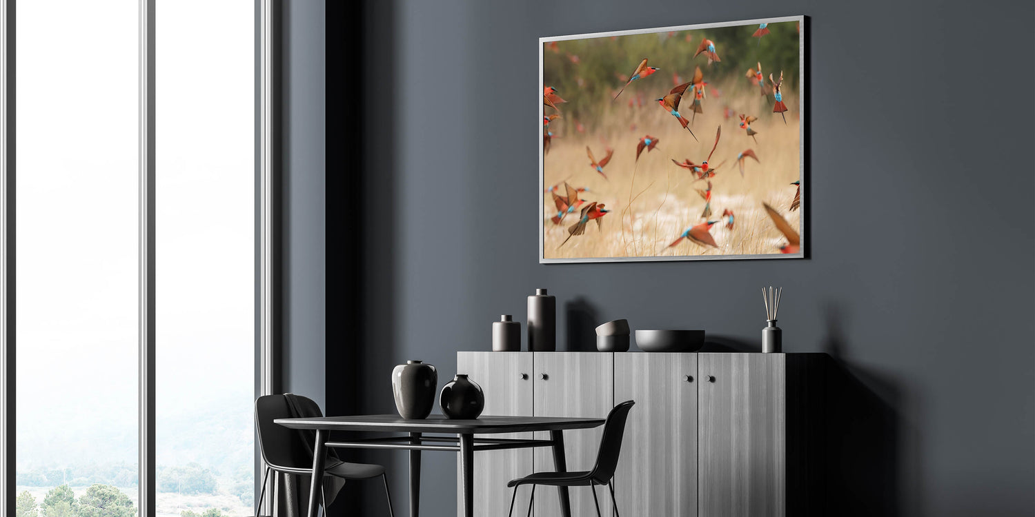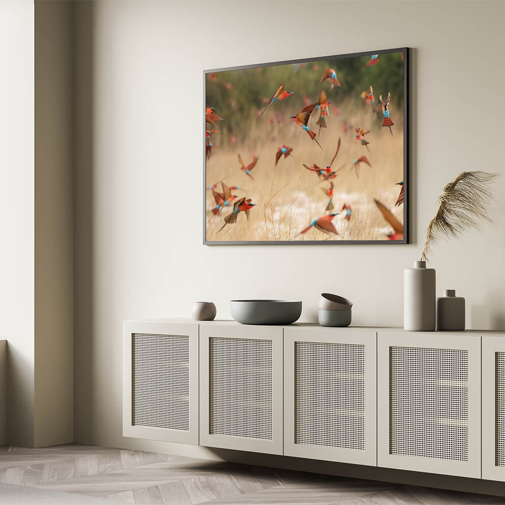 Immerse yourself in the vibrant beauty of Namibia with this stunning wall art featuring a flock of colorful bee-eaters in mid-flight over the golden African grasslands. The vivid red, turquoise, and brown hues of these birds against the soft, natural backdrop capture the essence of Namibia's rich biodiversity and dynamic landscapes. This piece is perfect for nature lovers and those who appreciate the intricate beauty of wildlife in motion.