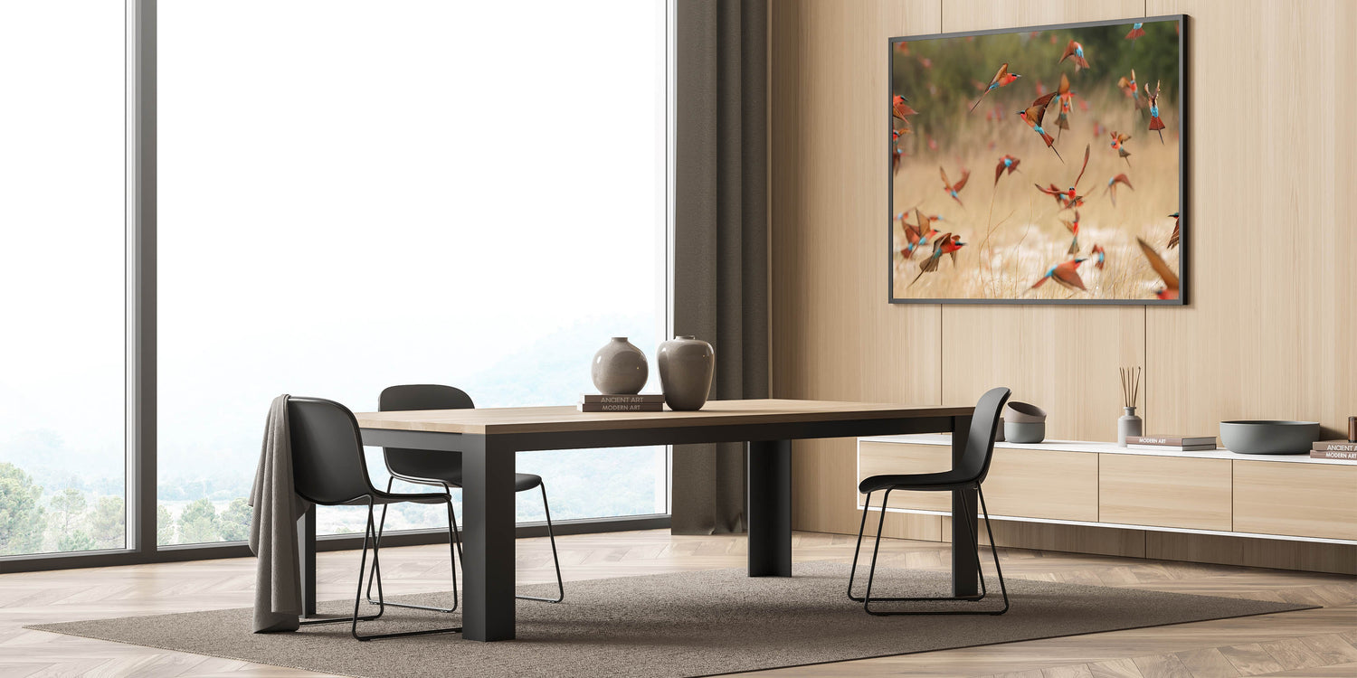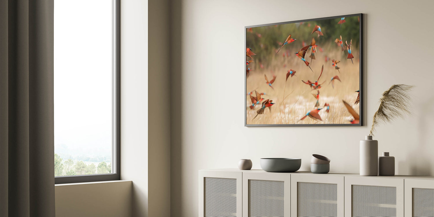 • Dynamic Imagery: Captures the vibrant movement and color of bee-eaters in their natural habitat, adding energy and life to any space.