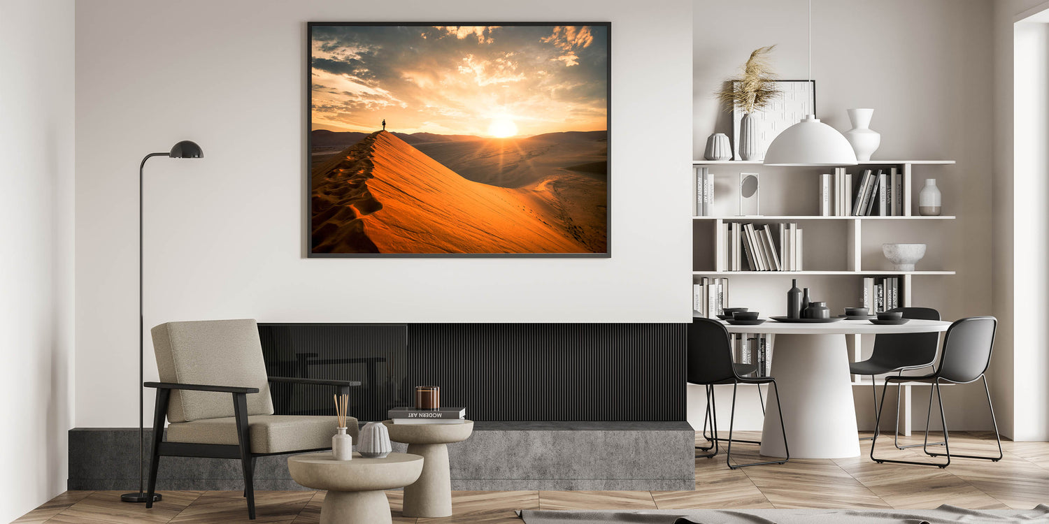 Witness the awe-inspiring beauty of the Namib Desert with this captivating wall art. Featuring a lone explorer standing atop a towering sand dune as the sun rises, this piece captures the profound solitude and expansive beauty of Namibia's desert landscape. The warm golden hues of the sunrise create a striking contrast with the cool shadows of the dune, making this artwork a perfect embodiment of the serene and majestic atmosphere of the desert.