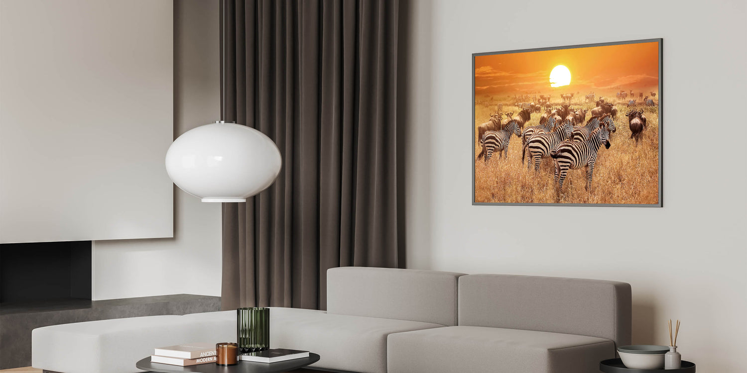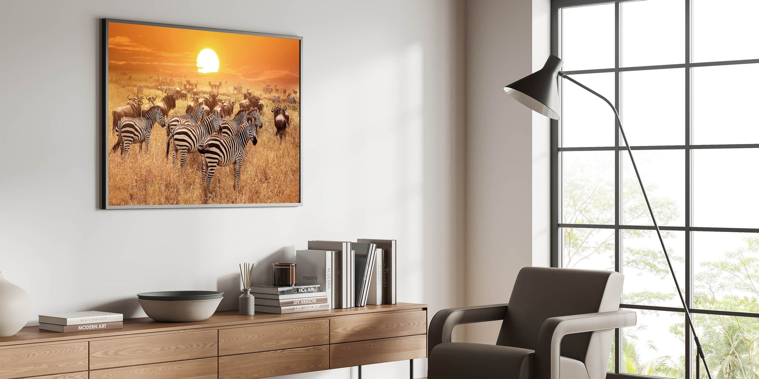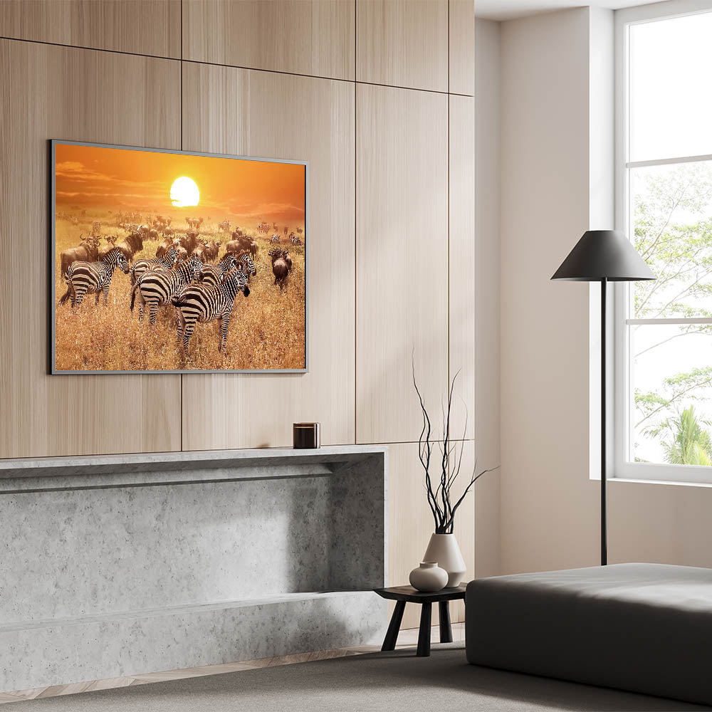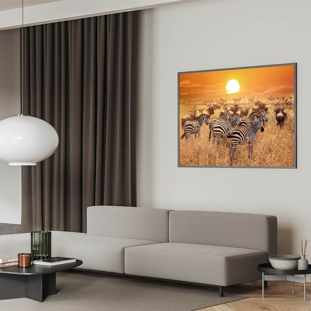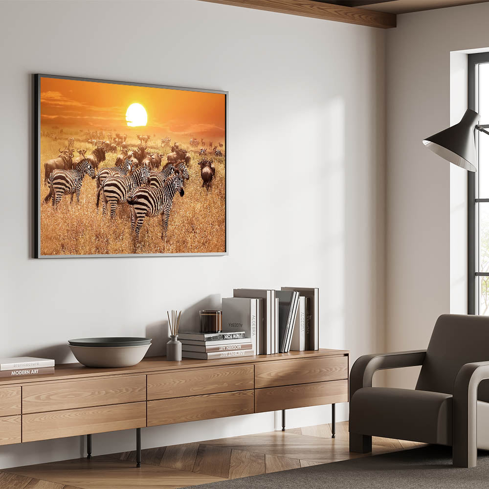 Capture the heart of Tanzania’s Serengeti with this stunning wall art featuring a mesmerizing sunset over a herd of zebras and wildebeests. The rich, golden hues of the sunset contrast beautifully with the striking black-and-white stripes of the zebras, creating a captivating scene that transports you to the vast African plains. This artwork celebrates the beauty of African wildlife, making it a perfect addition to your home or office decor.
