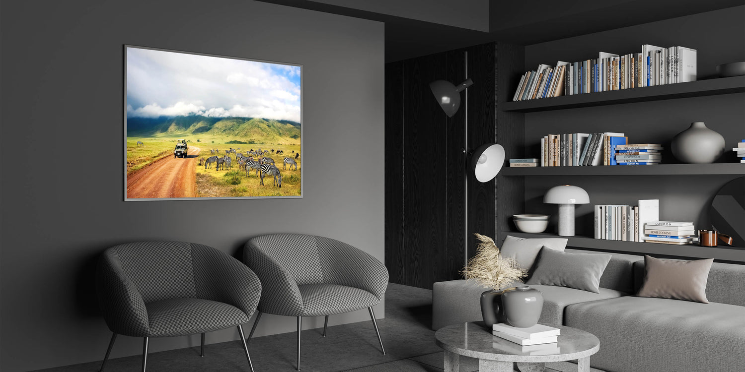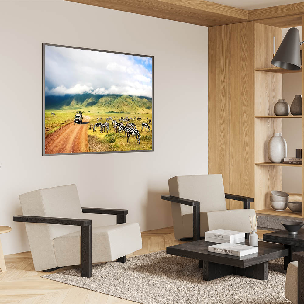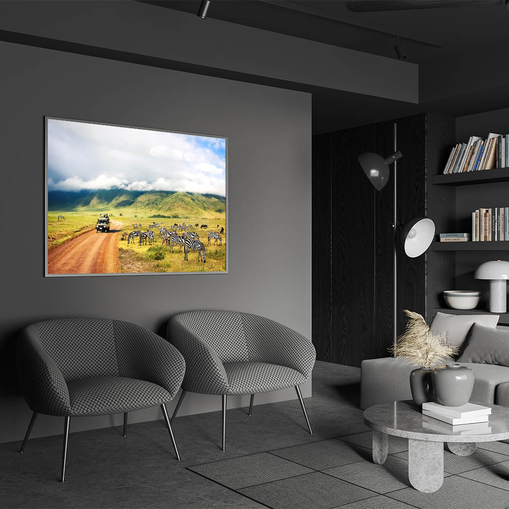 Immerse yourself in the heart of Tanzania with this stunning wall art showcasing a safari vehicle navigating the Ngorongoro Crater, surrounded by zebras peacefully grazing in the foreground. The majestic hills and cloud-covered skies add depth and tranquility to this beautiful scene. Perfect for any lover of African wildlife, this artwork brings the experience of a safari adventure into your home.