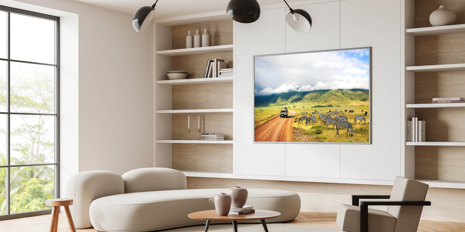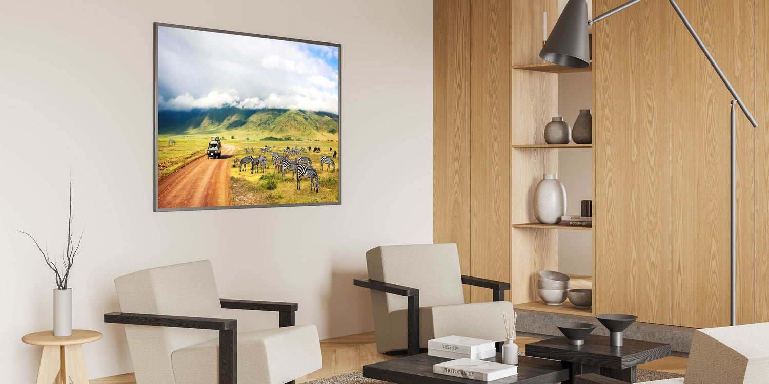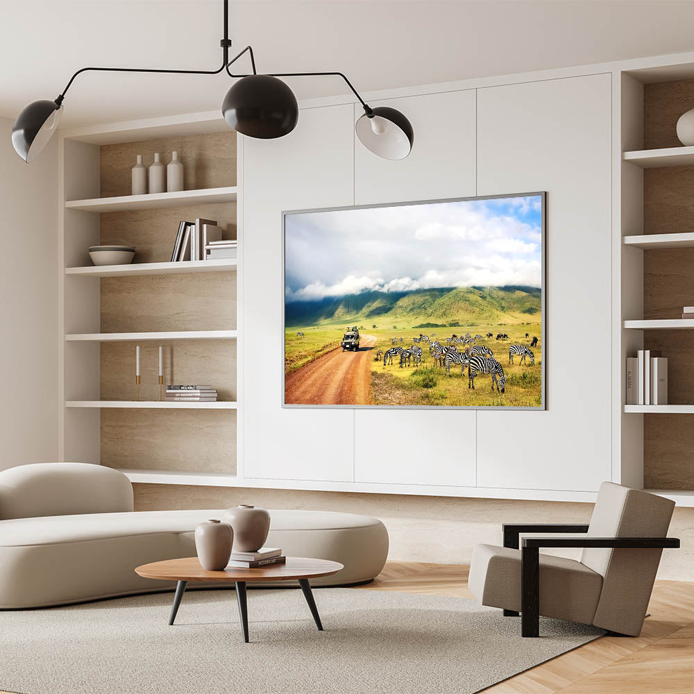 Immerse yourself in the heart of Tanzania with this stunning wall art showcasing a safari vehicle navigating the Ngorongoro Crater, surrounded by zebras peacefully grazing in the foreground. The majestic hills and cloud-covered skies add depth and tranquility to this beautiful scene. Perfect for any lover of African wildlife, this artwork brings the experience of a safari adventure into your home.