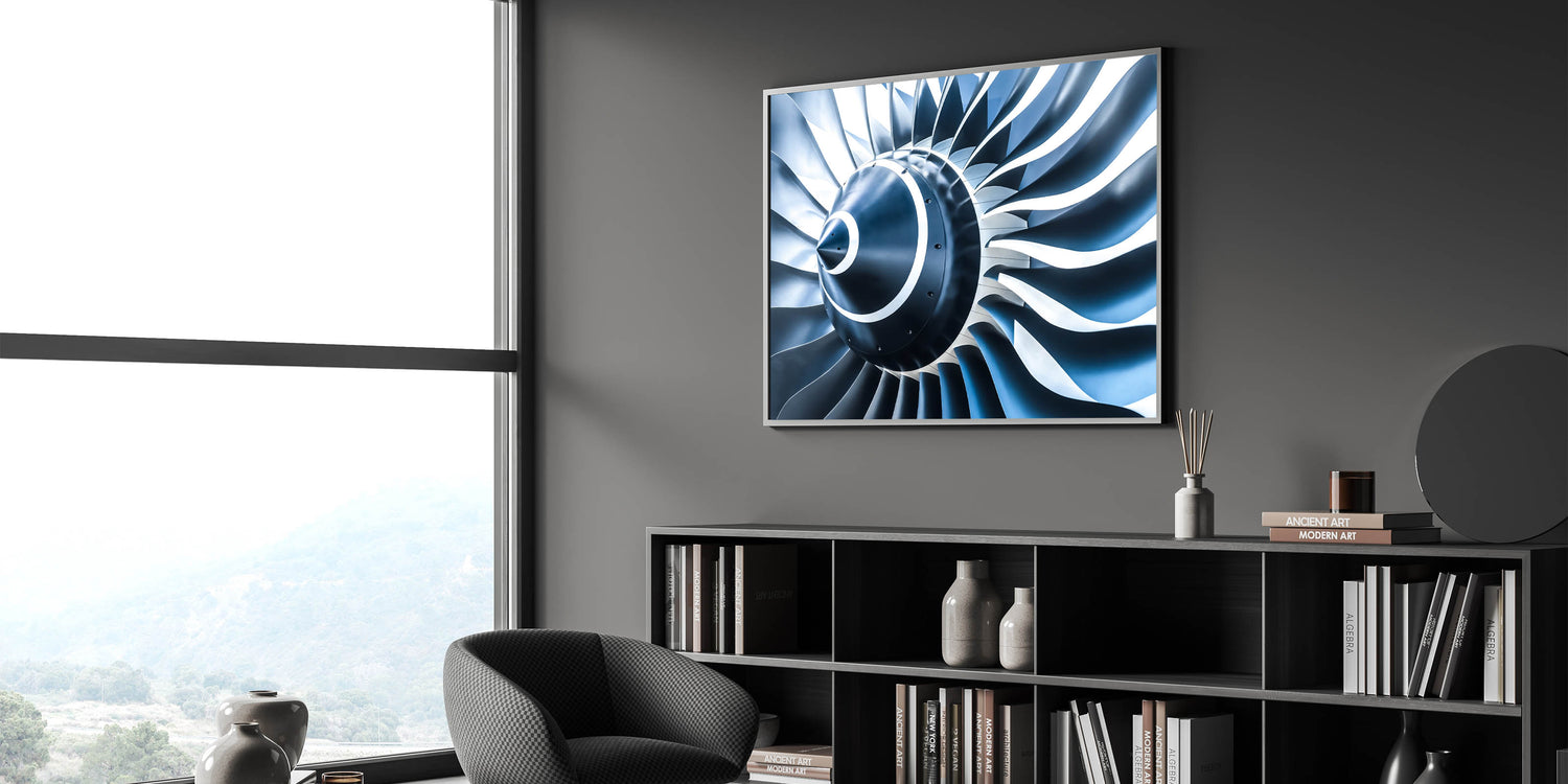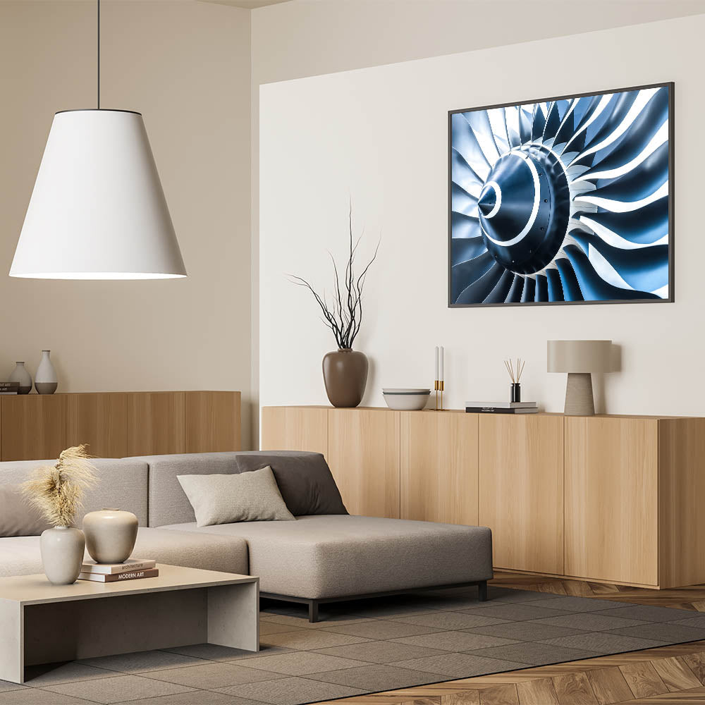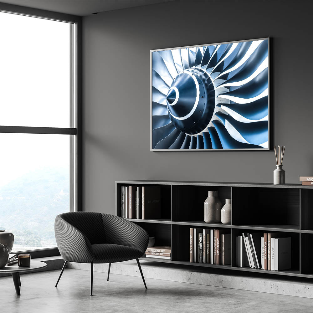 Immerse yourself in the power and precision of modern aviation with this striking close-up of a jet engine fan blade. This Modern Aviation Art piece captures the intricate design and engineering brilliance of contemporary aircraft, making it a perfect focal point for any space. The cool blue tones and sharp lines of the fan blades create a mesmerizing visual effect, ideal for those who appreciate the art of aviation.