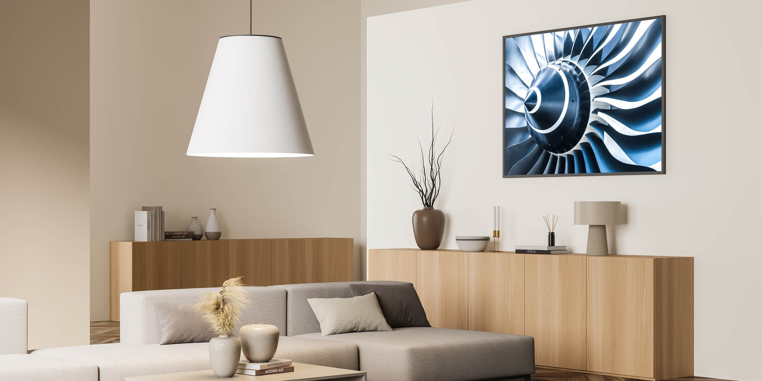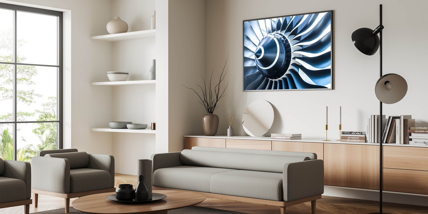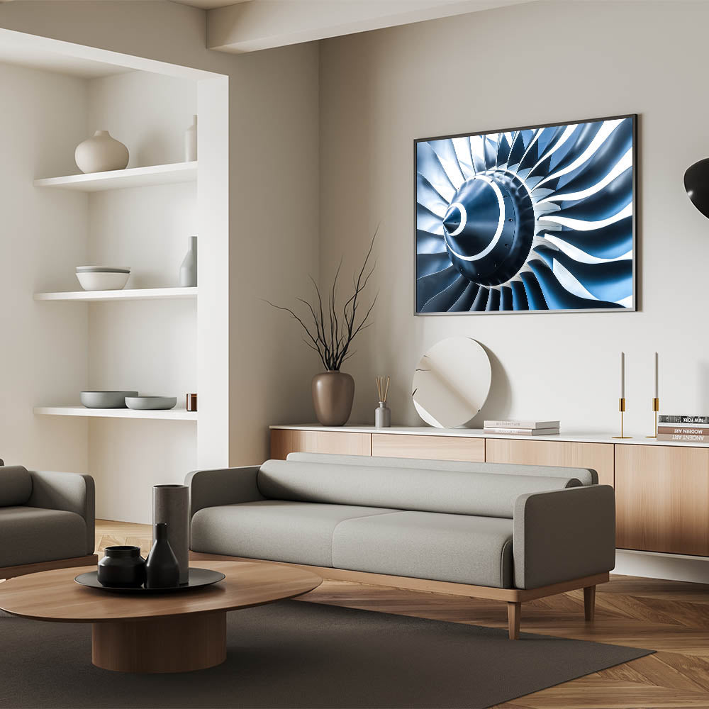 Immerse yourself in the power and precision of modern aviation with this striking close-up of a jet engine fan blade. This Modern Aviation Art piece captures the intricate design and engineering brilliance of contemporary aircraft, making it a perfect focal point for any space. The cool blue tones and sharp lines of the fan blades create a mesmerizing visual effect, ideal for those who appreciate the art of aviation.