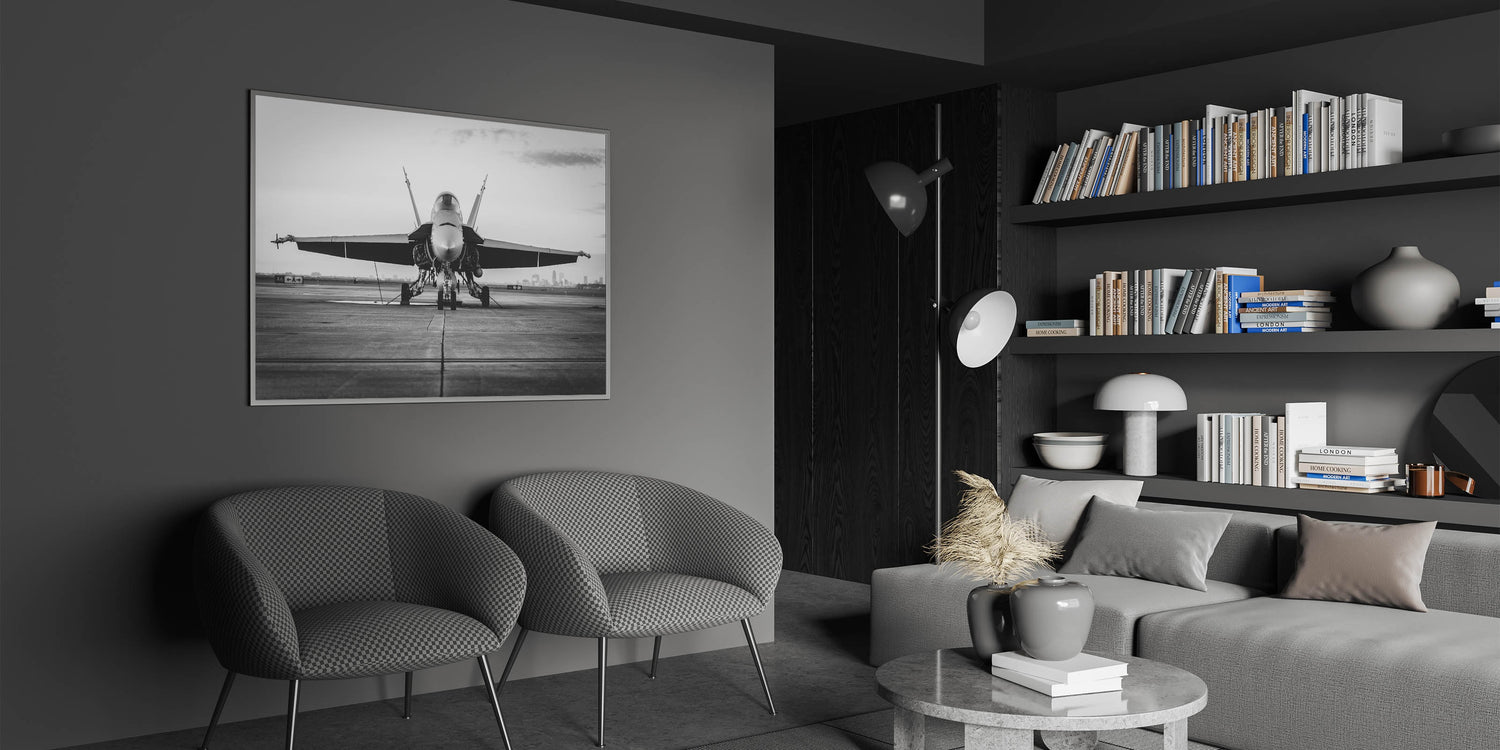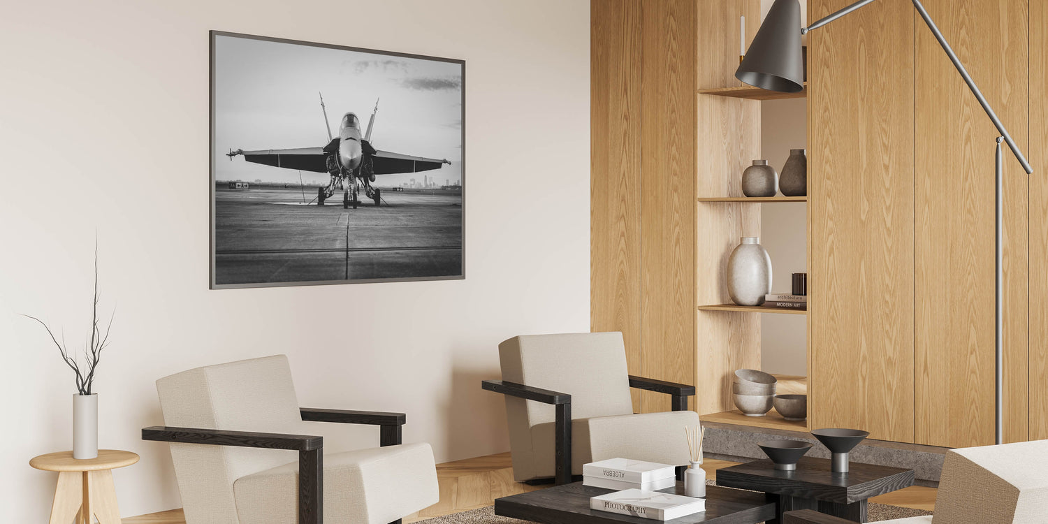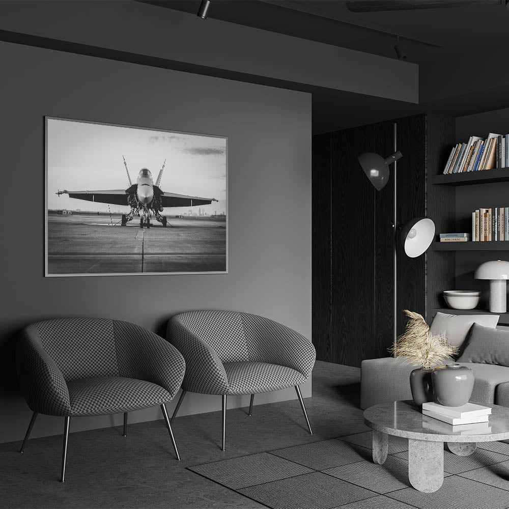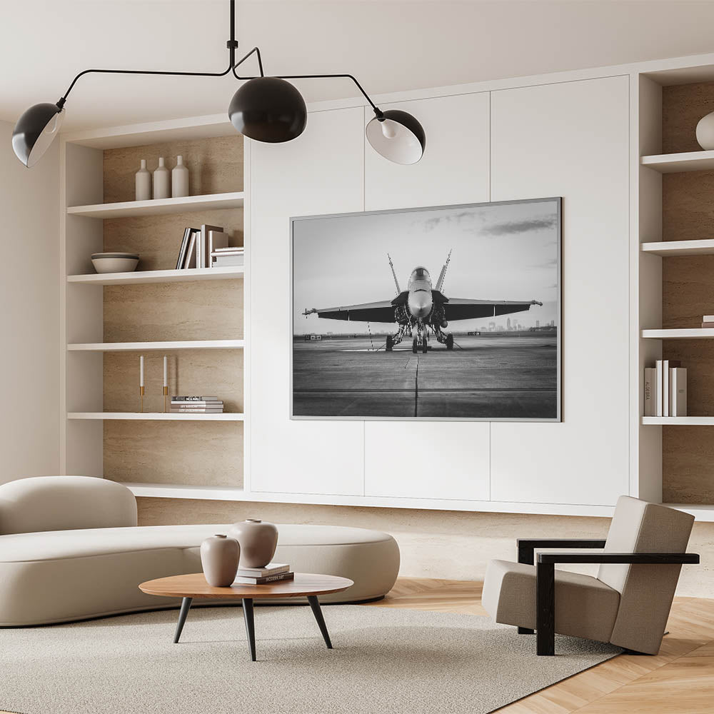 Experience the sleek power of modern military aviation with this striking monochrome artwork, featuring a fighter jet poised on the runway. The detailed black and white photography captures the intensity and readiness of the jet, making it an ideal addition for any aviation enthusiast's collection. The contrast between the aircraft and the expansive runway creates a visually commanding image that embodies the essence of modern air power.