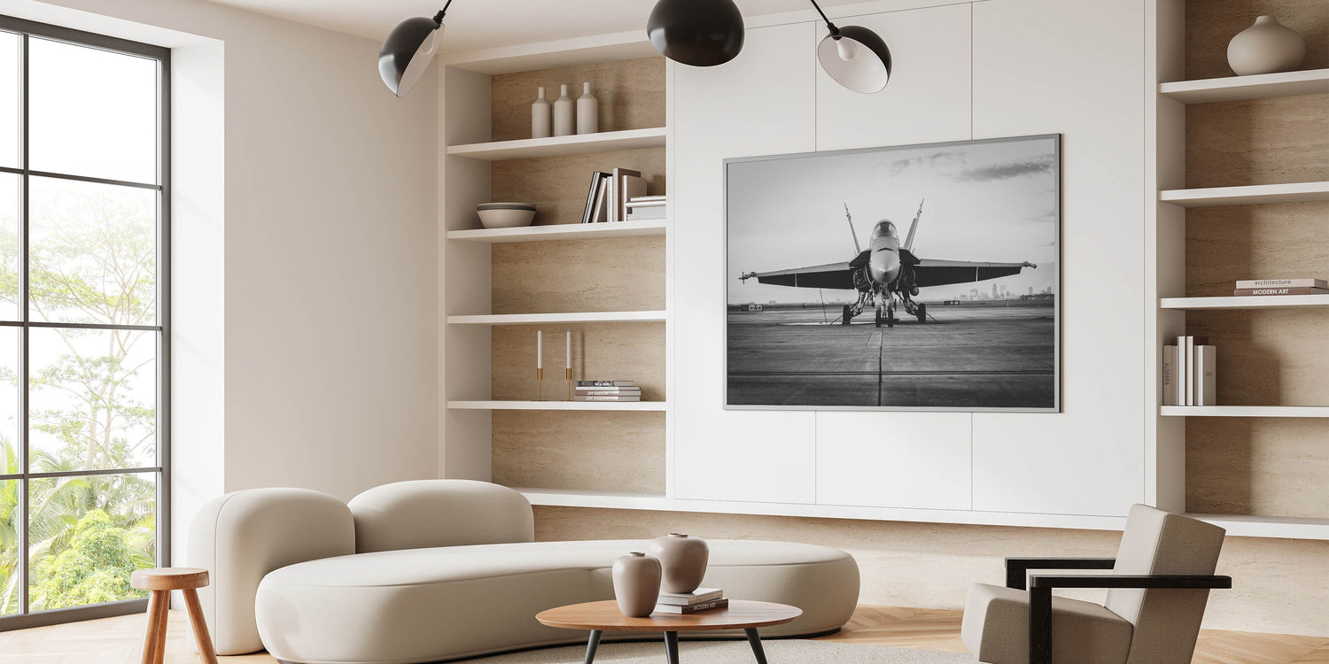 - Sleek Monochrome Design: The black and white tones emphasize the powerful design of the fighter jet, making this piece a bold statement in any room.
